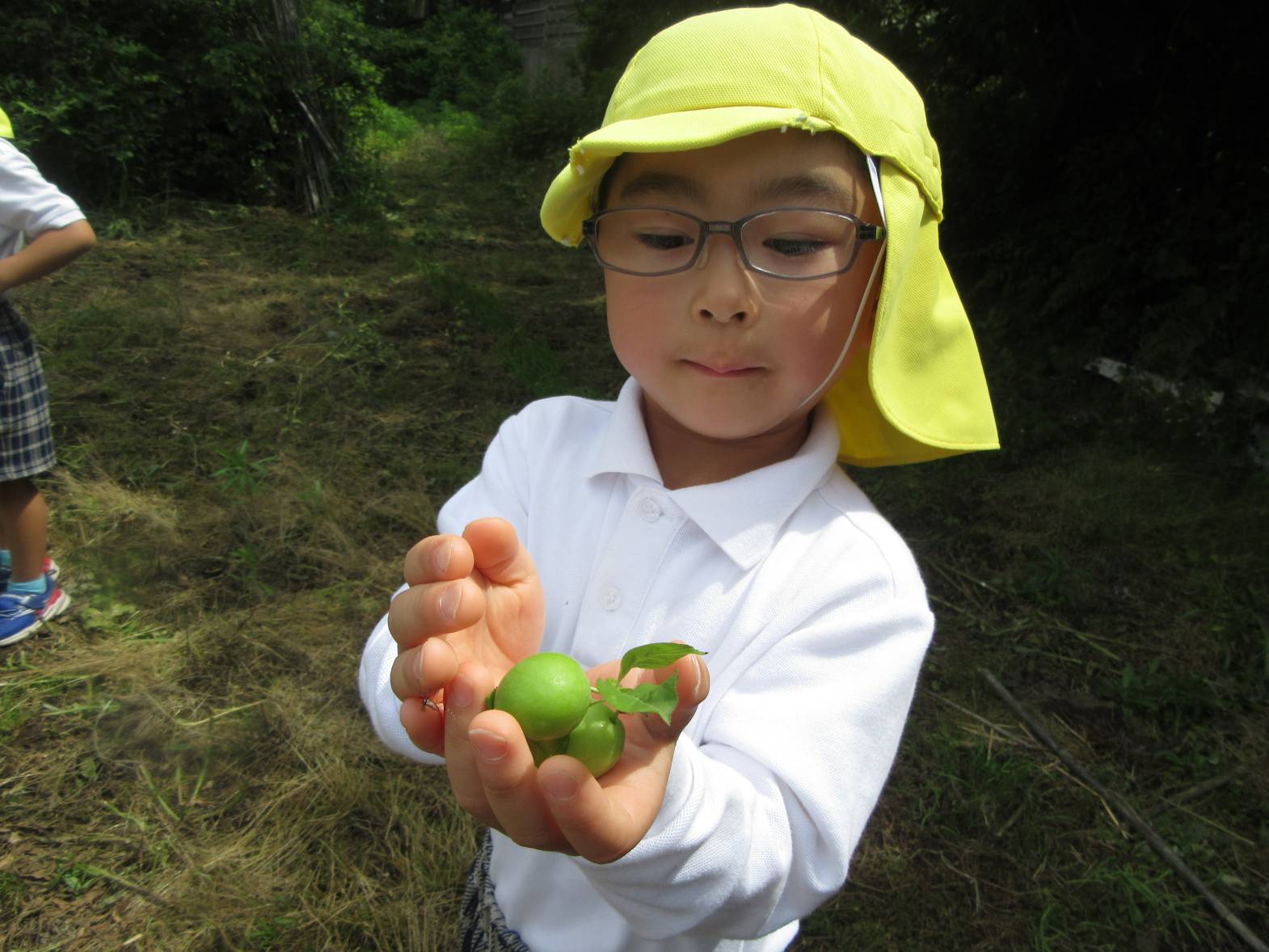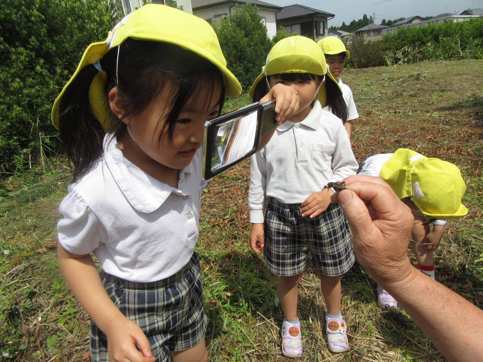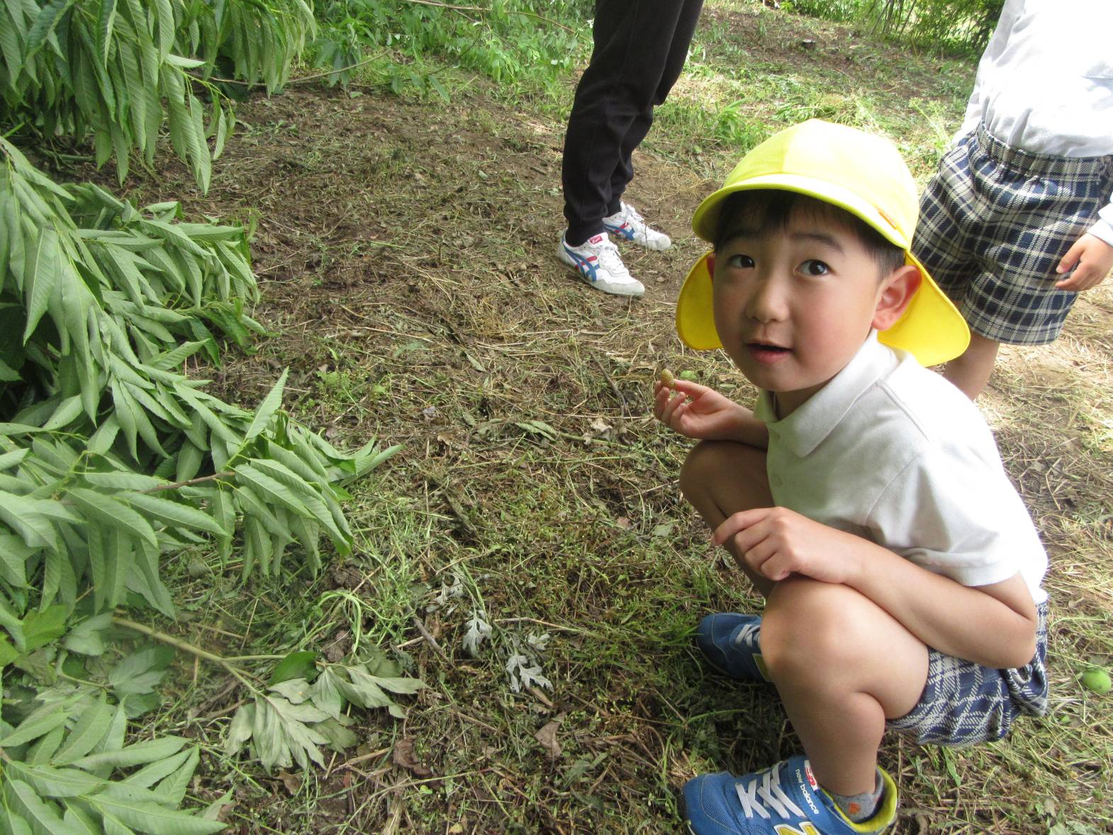 今日は、園長先生と保育園の裏側を探検しに行きました。 「何があるかな?」とわくわくしながら向かっていきます! 虫を見つけると、園長先生が持ってきた虫眼鏡でじっくり観察することができ、「わぁ~!すごい!」と大興奮の子どもたち。 「梅みたいなものがある!」、「これは何かな?」と様々な物を発見し、友だちと共有することを楽しんだきりん組さんでした。