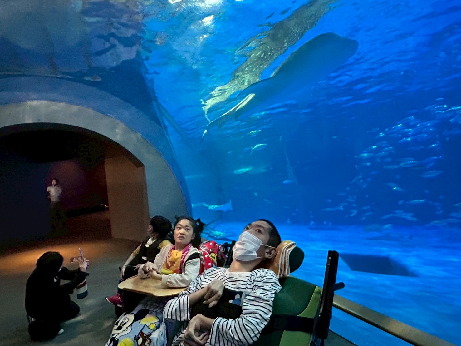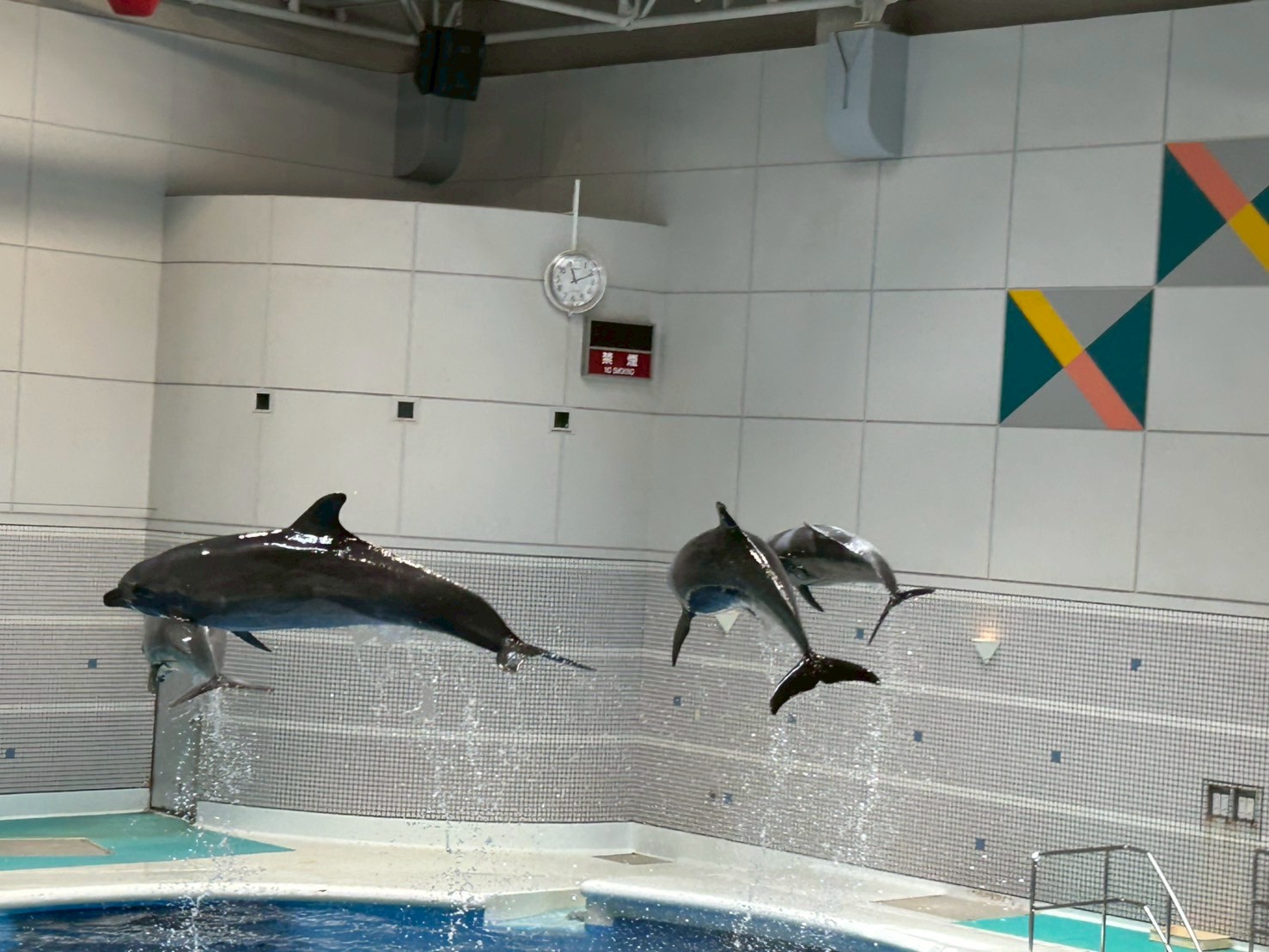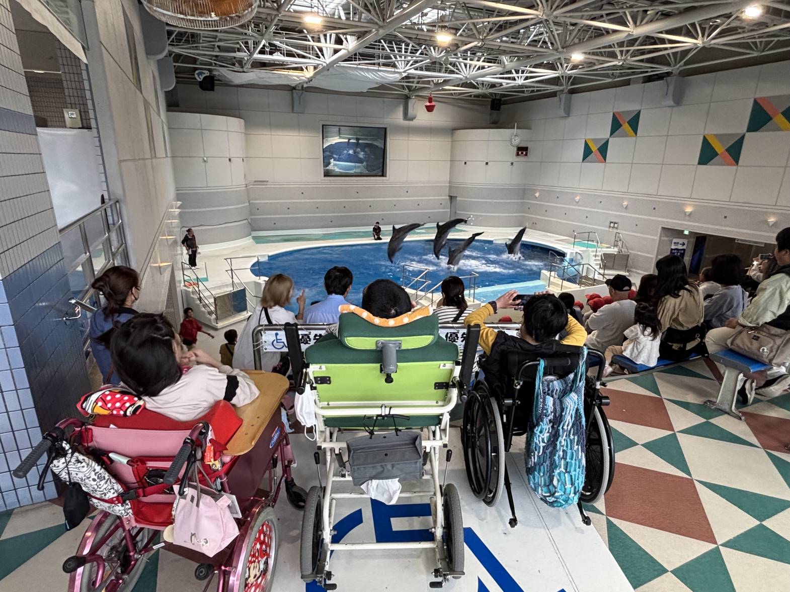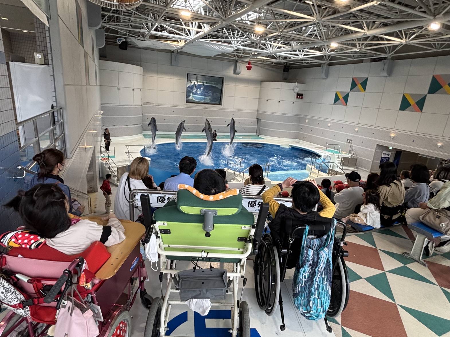 今日は2班目の水族館外出でした! 今日の外出活動をとても楽しみにされていたそうです! 出発前から皆さん、ニコニコです♪ バックヤード見学の後、イルカショーを見て楽しみました。 残念ながらイルカにサインを出せる係には指名されず・・・ それでも皆さんと一緒に手を大きく動かして、サインをしておりました! 次回の水族館外出に参加される方も楽しみにしておいてくださいね♪