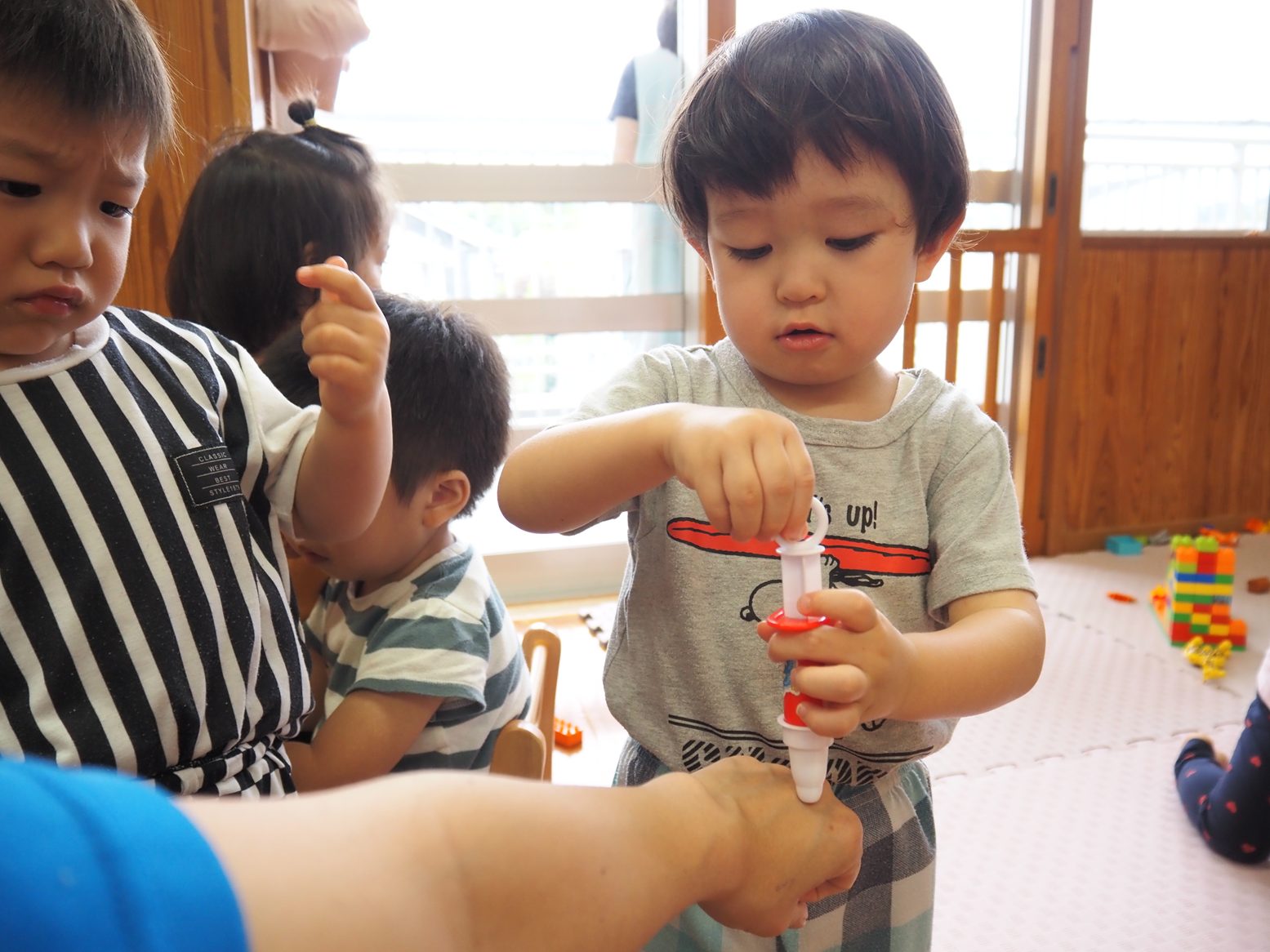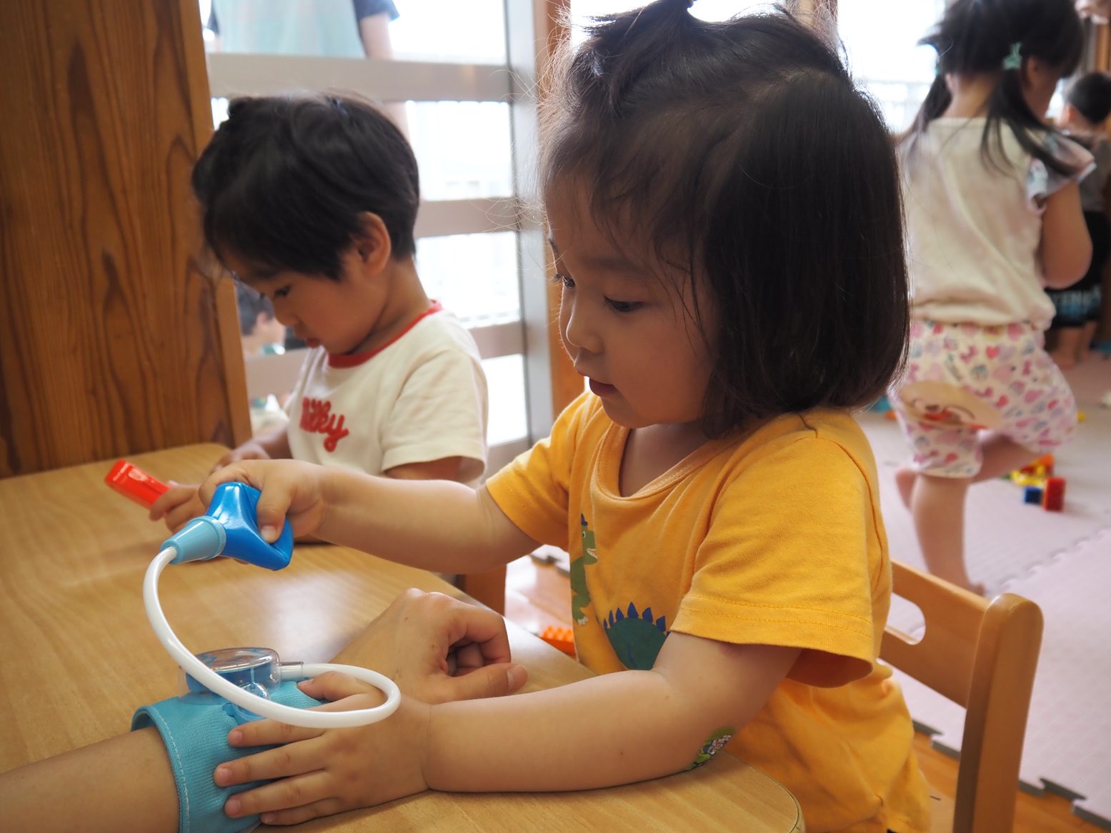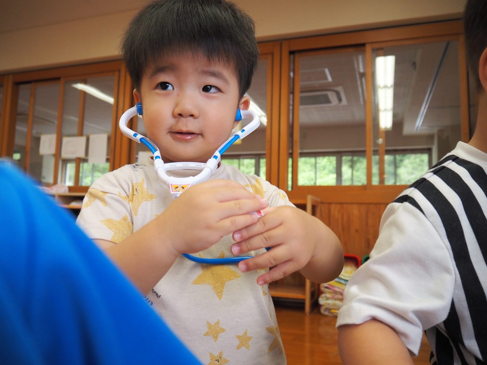 聴診器や注射器などのおもちゃで遊んでみると、「なにこれー!」と目をキラキラさせる子どもたち。