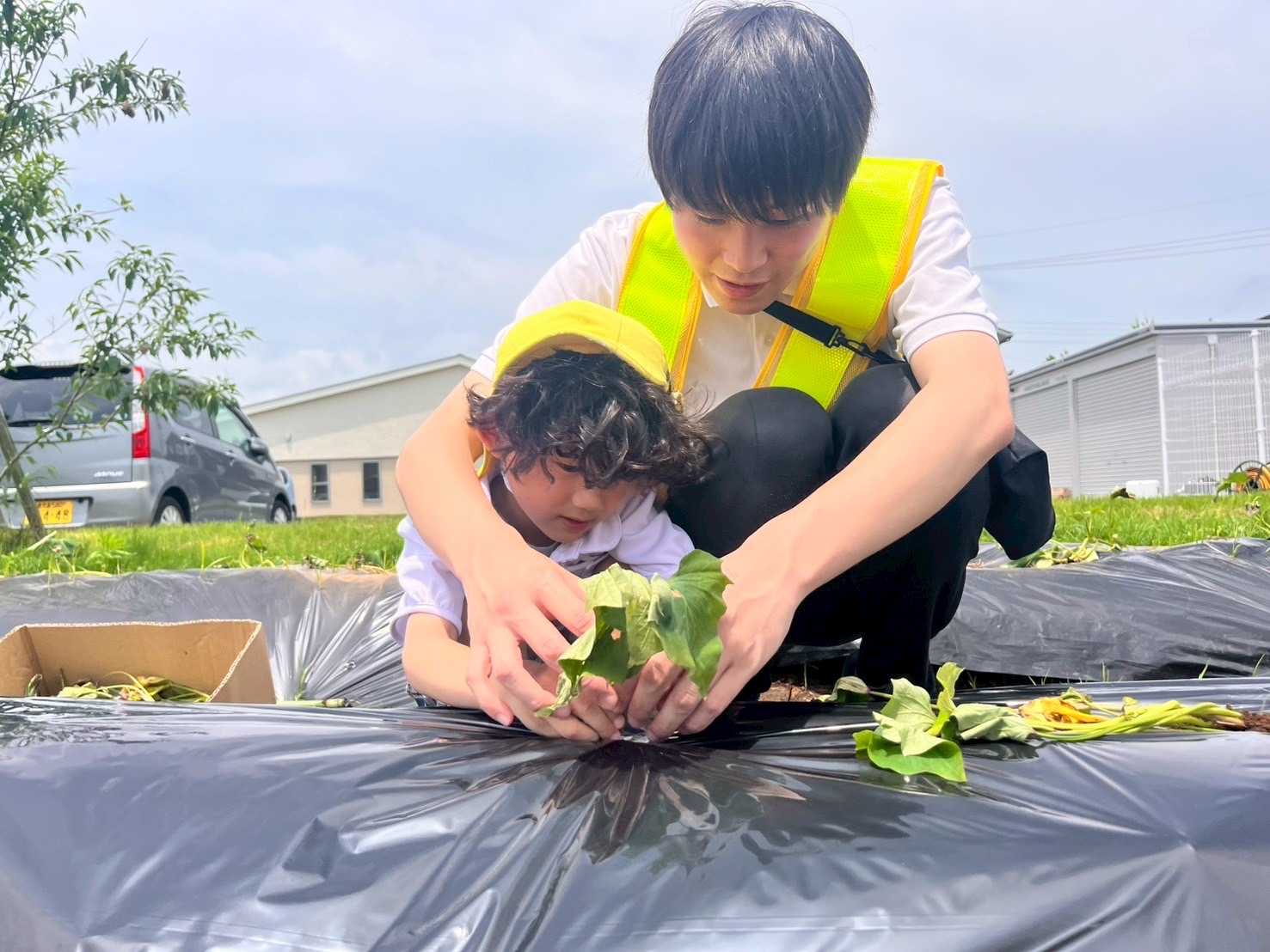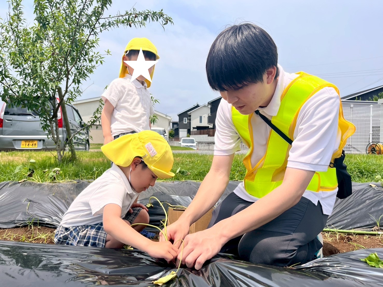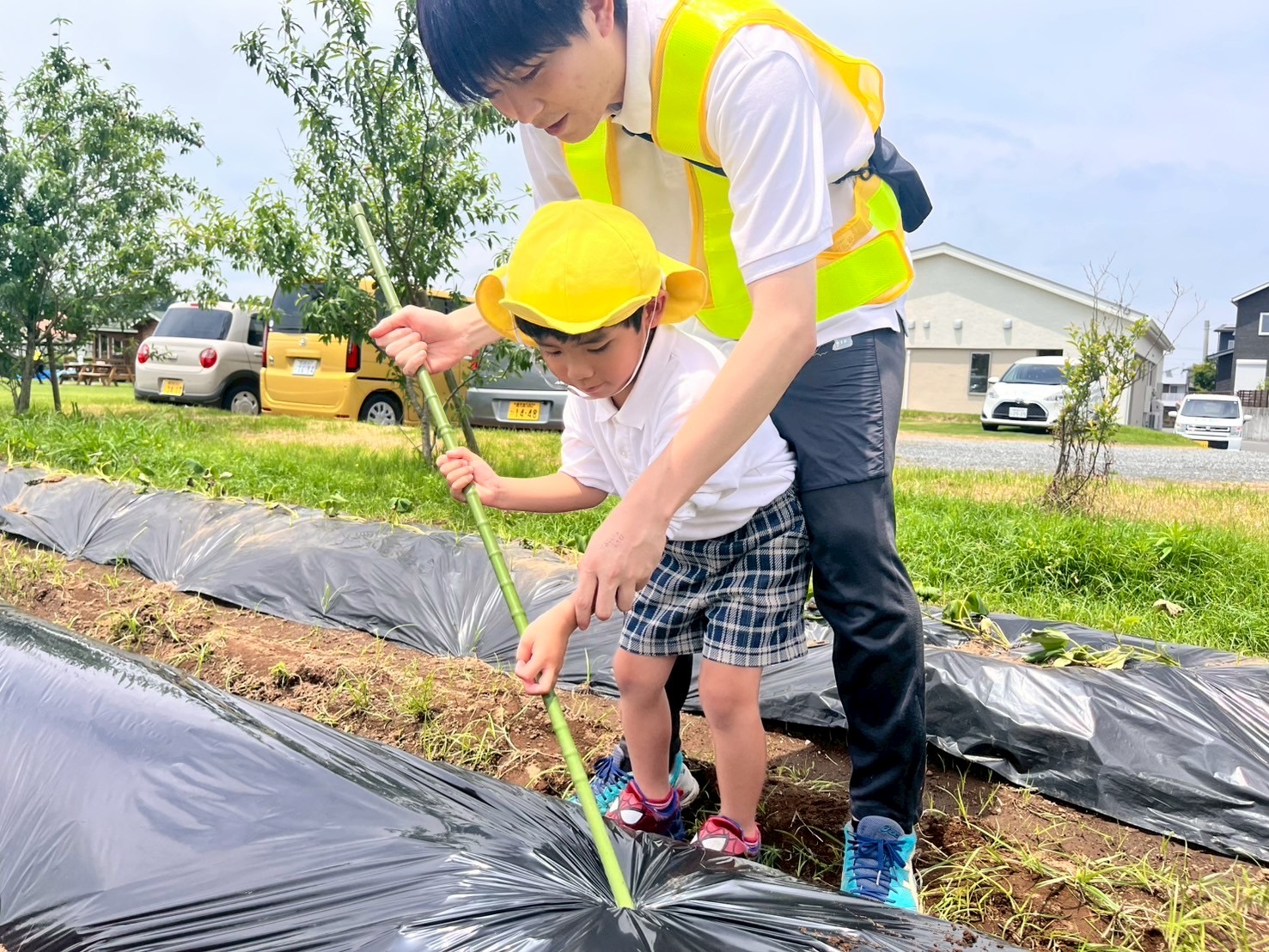 今日は、戸外活動でウェルガーデンの芝生に行き、お芋を植えました。 お芋を植えることを伝えると、「どうやって植えるの?」「早く植えたい!」といつもとは違う活動に興味津々なぞうグループさん! 植え方についての話を聞き、まずは、苗を植える穴を作りました。 職員と一緒に力強く棒を指して苗を植える穴ができた後は、いよいよ、苗を植えていきます。 優しく苗も扱うことができ、「大きくなると良いな。」とお芋さんの成長を楽しみにする声も聞かれたぞうグループさんでした♪