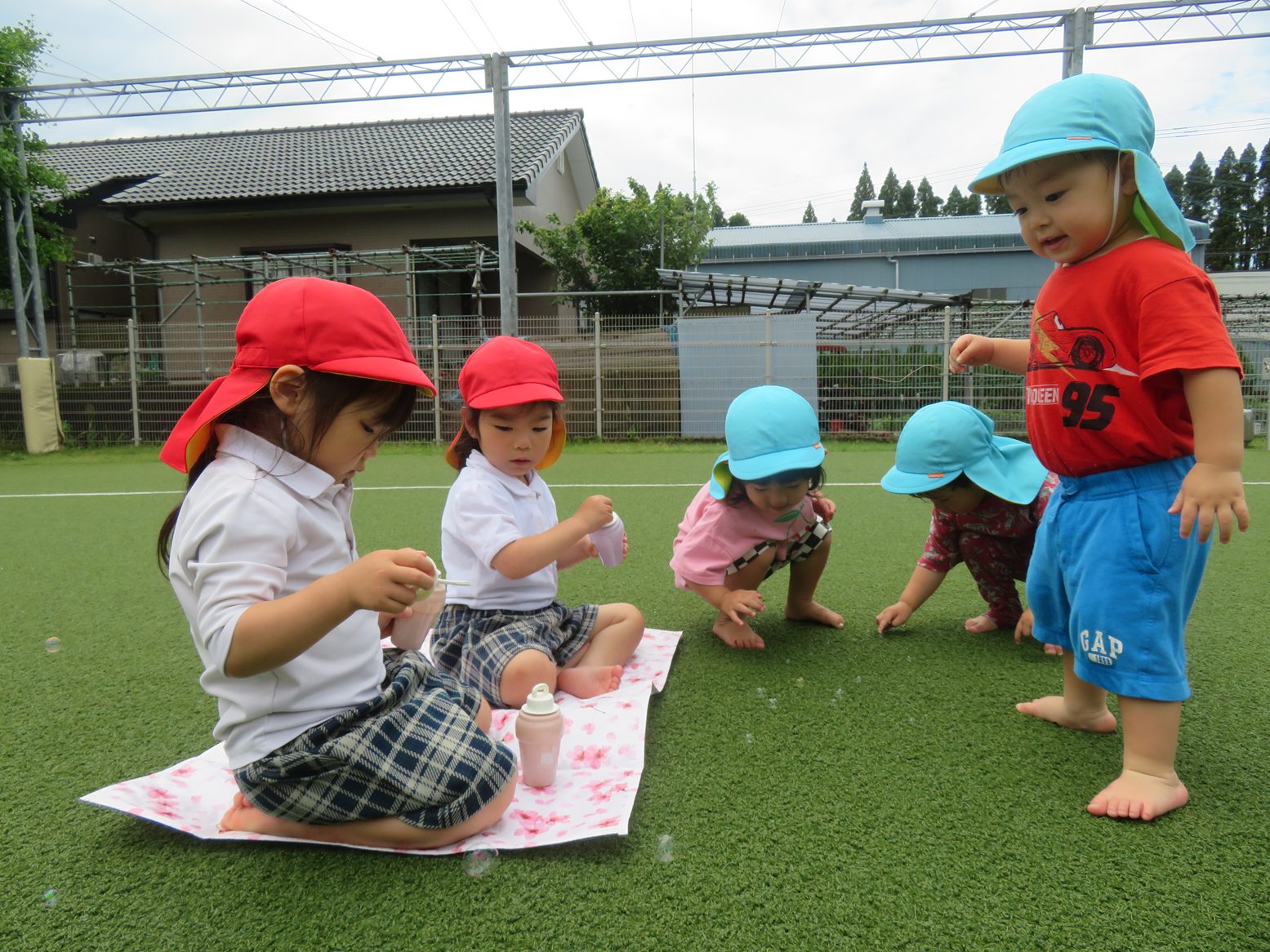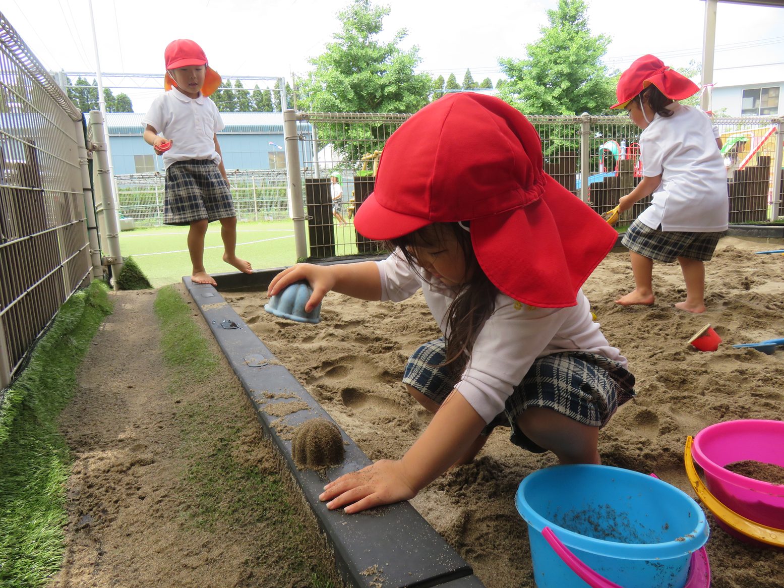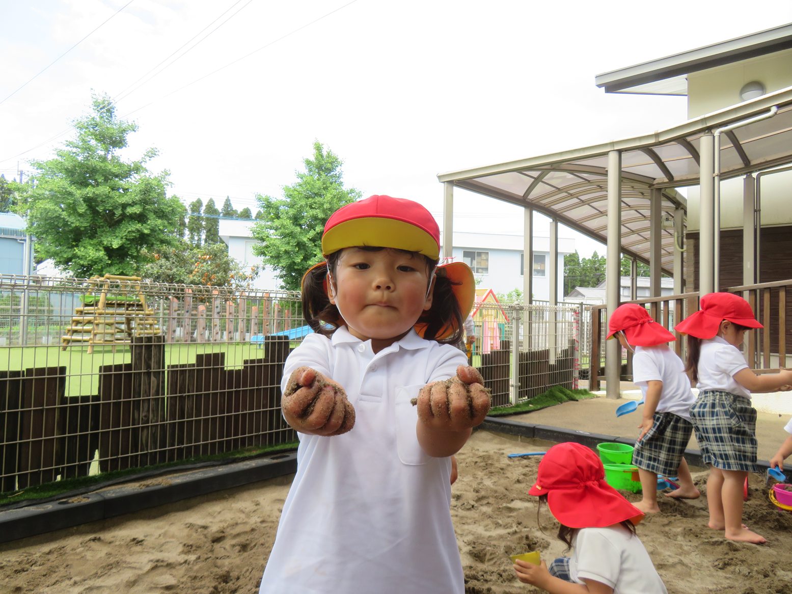 梅雨の時期には貴重な晴れの日! 園庭では、虫探しやしゃぼん玉と子どもたち思い思いに好きな遊びを楽しみます。 砂場では、昨日の雨で土がいい感じに湿っていたこともあり、団子やおにぎり作り、型抜き遊びを楽しむ子どもたち。 「お外晴れてよかった!」「また明日も晴れるといいな~。」と晴れの日を喜びつつ、明日も晴れを願うりす組さんです。