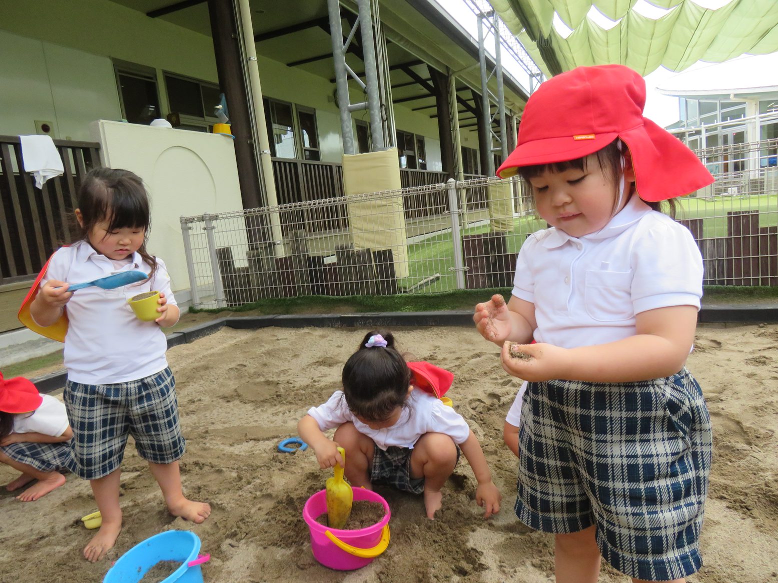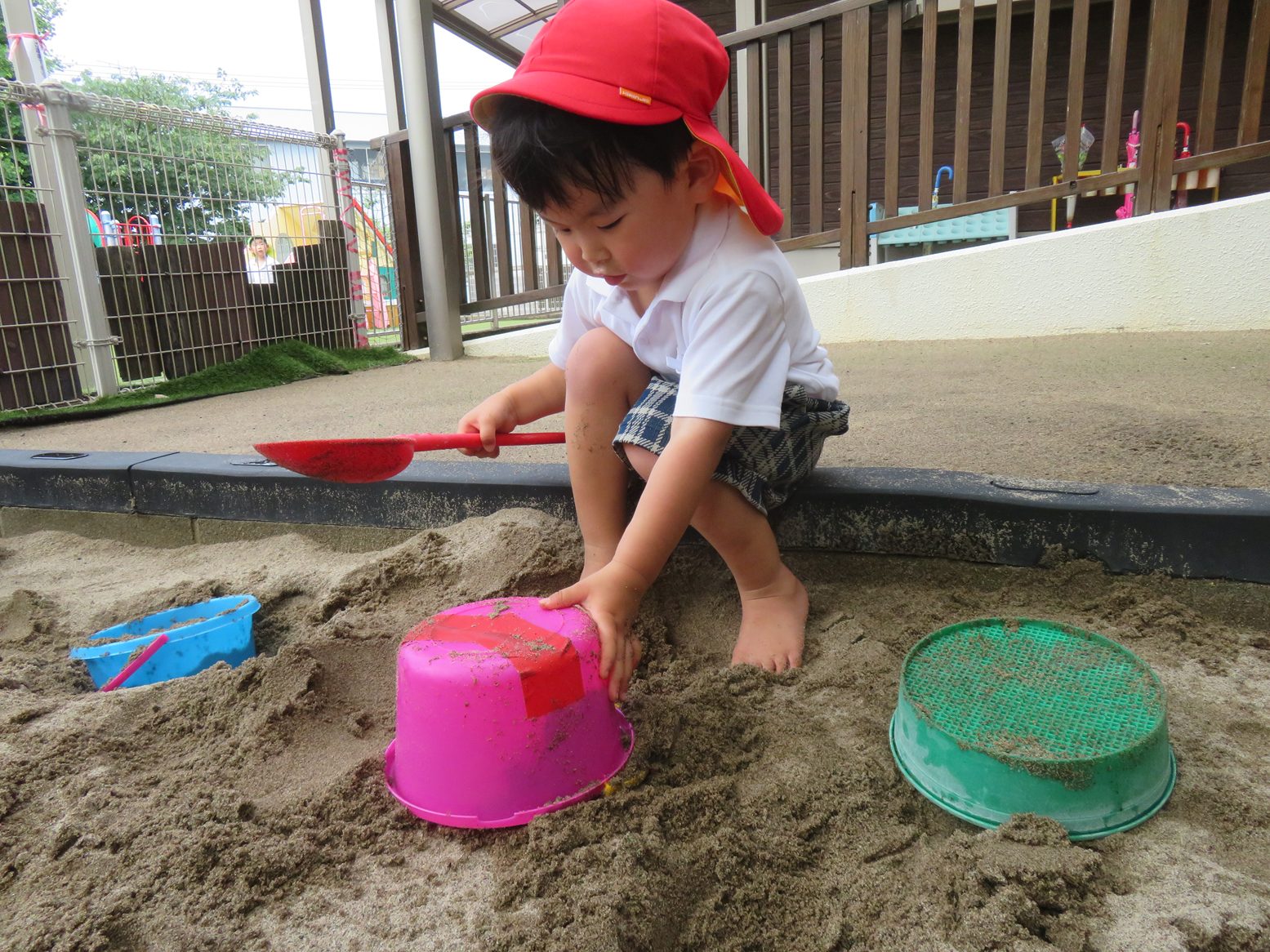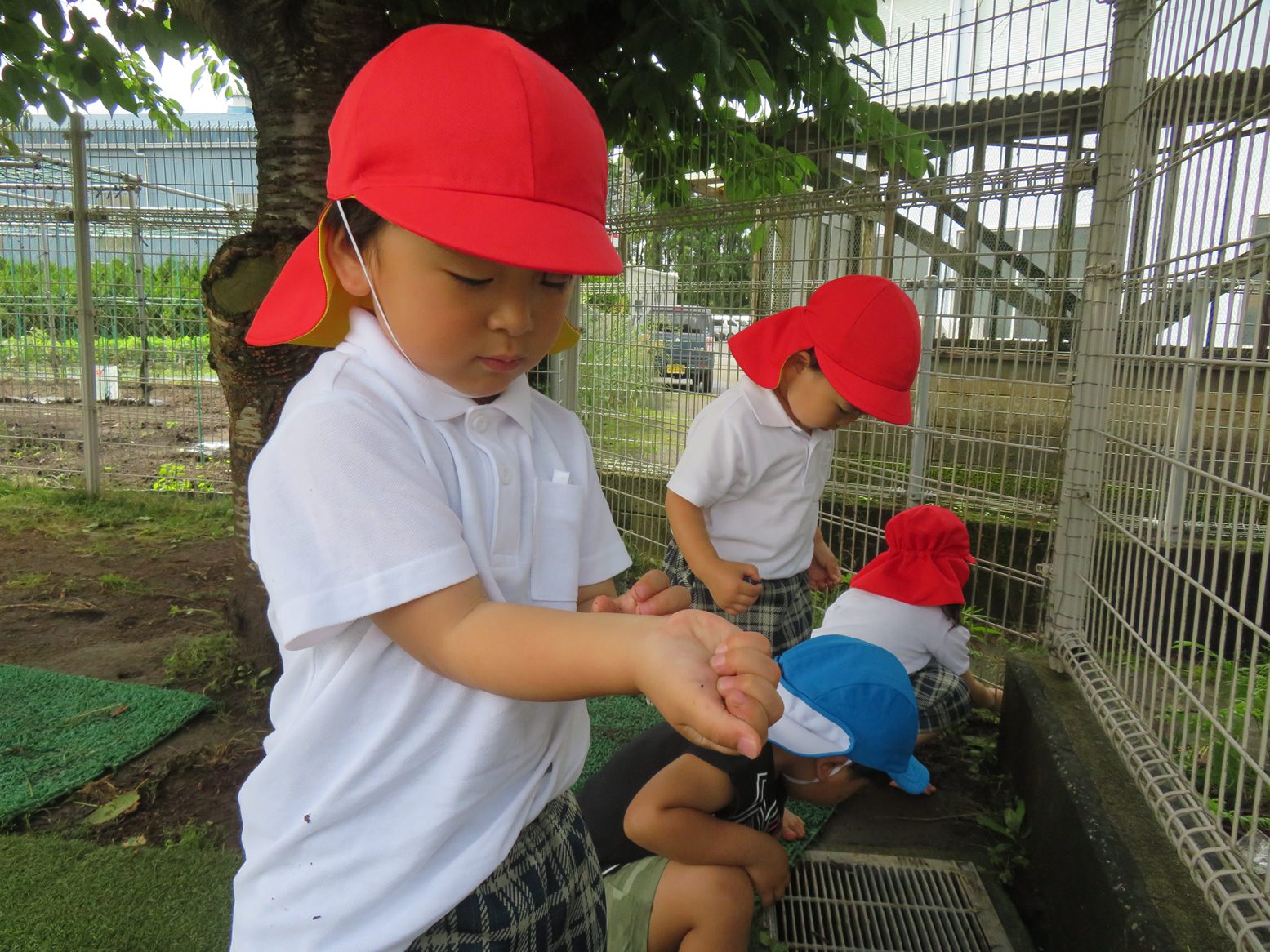 梅雨の時期には貴重な晴れの日! 園庭では、虫探しやしゃぼん玉と子どもたち思い思いに好きな遊びを楽しみます。 砂場では、昨日の雨で土がいい感じに湿っていたこともあり、団子やおにぎり作り、型抜き遊びを楽しむ子どもたち。 「お外晴れてよかった!」「また明日も晴れるといいな~。」と晴れの日を喜びつつ、明日も晴れを願うりす組さんです。