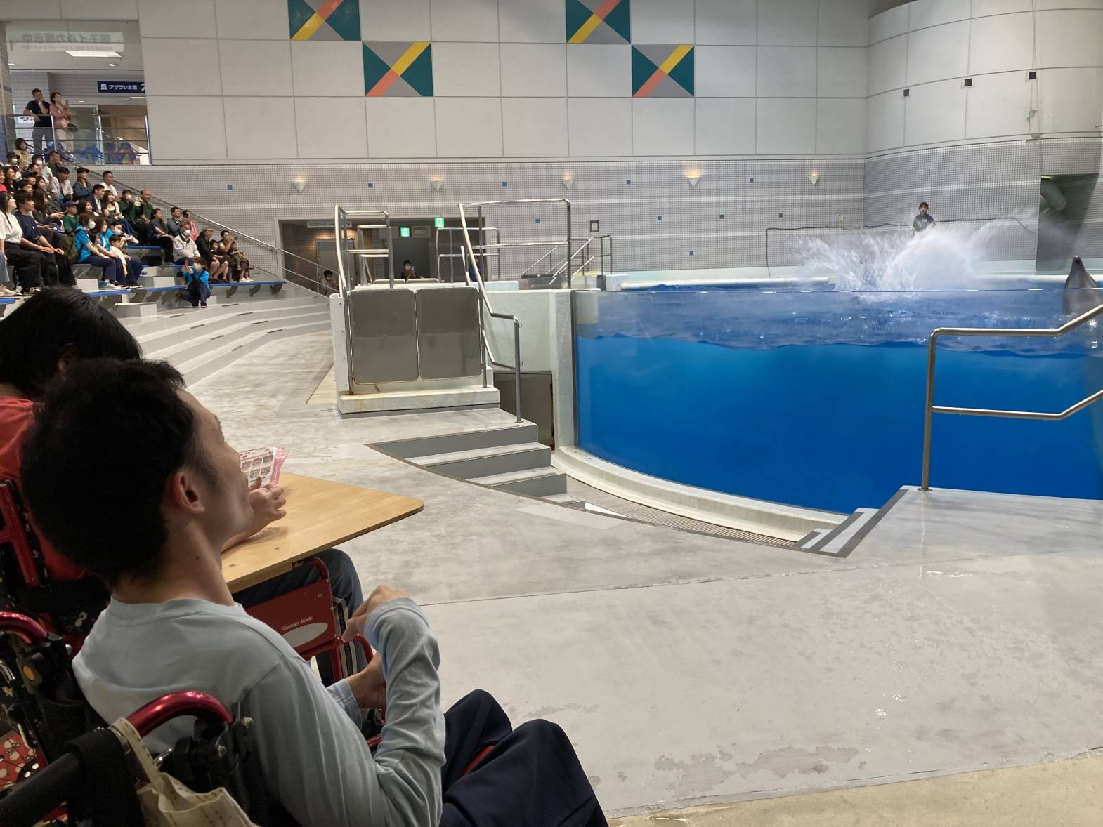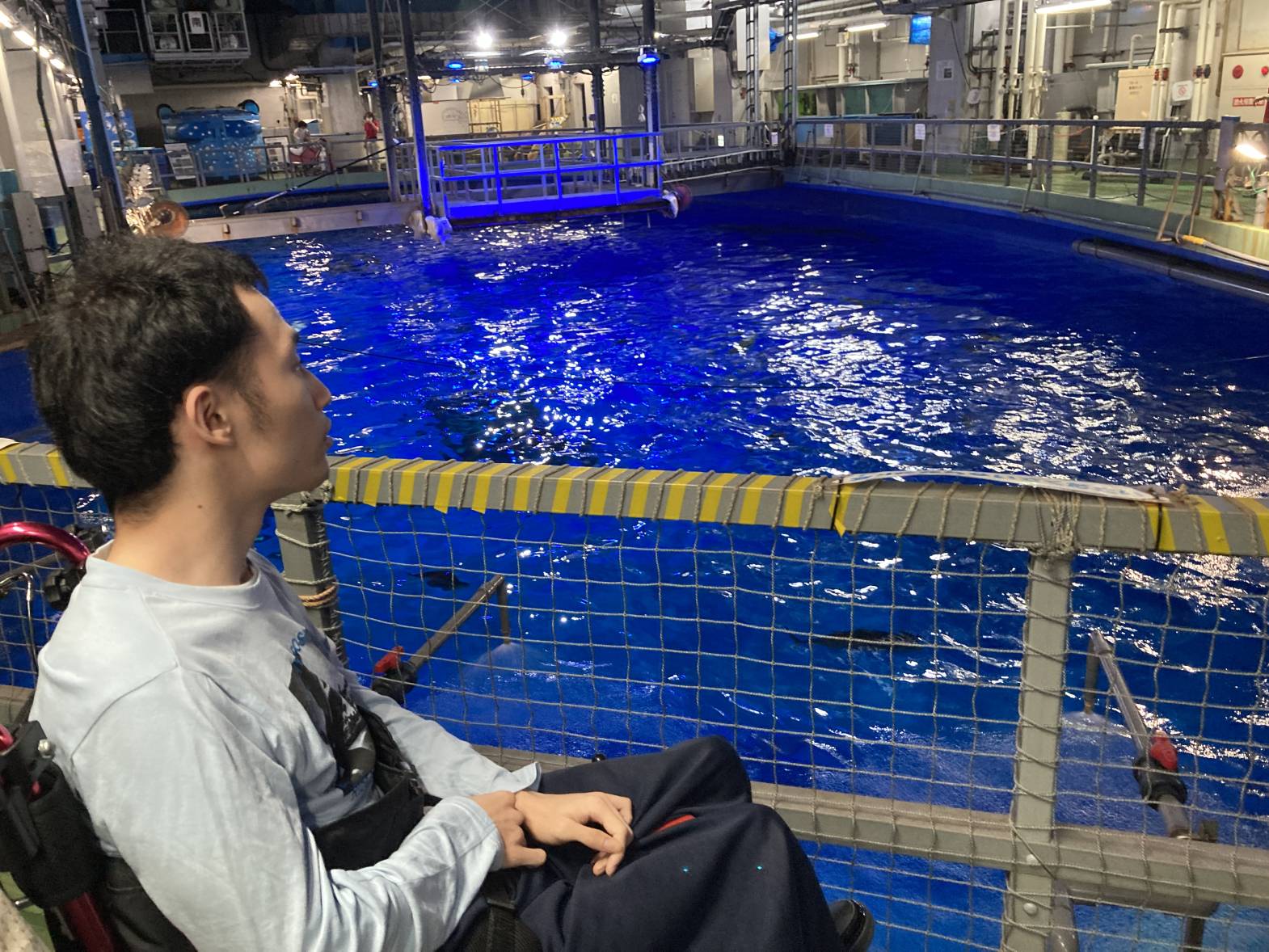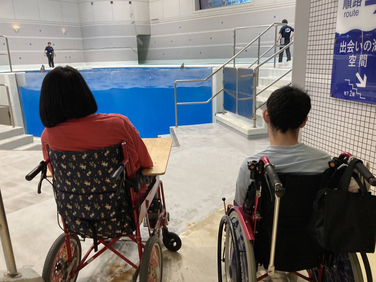 今日は3班目が水族館外出に出発しました! 黒潮大水槽の迫力は圧巻ですね! 水族館について早々、皆さん水槽内で泳ぐたくさんの魚たちに見入っておりました! バックヤード見学は普段見る水槽と違って、上から覗く水槽はなんだか不思議な感覚でしたね! 最後はイルカショーの見学をしました♪そして、なんと一番前の席を取れました! とっても楽しかったですが、イルカたちとの距離が近すぎたのかちょっとびっくりしちゃう場面も・・・ それでも、水族館外出は楽しかった様子でした♪