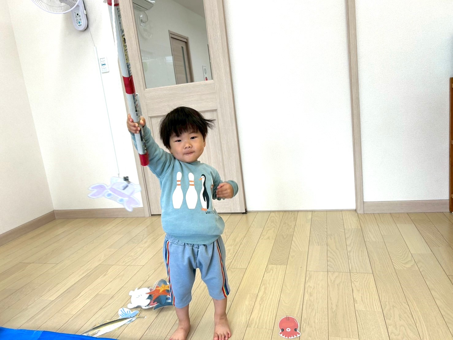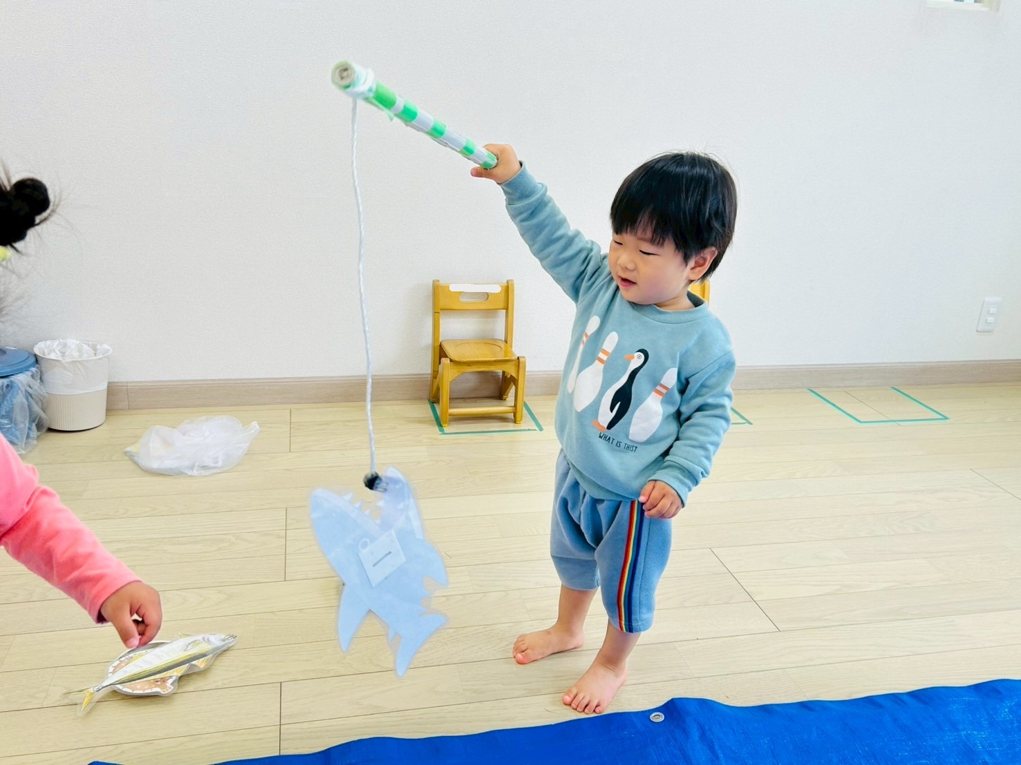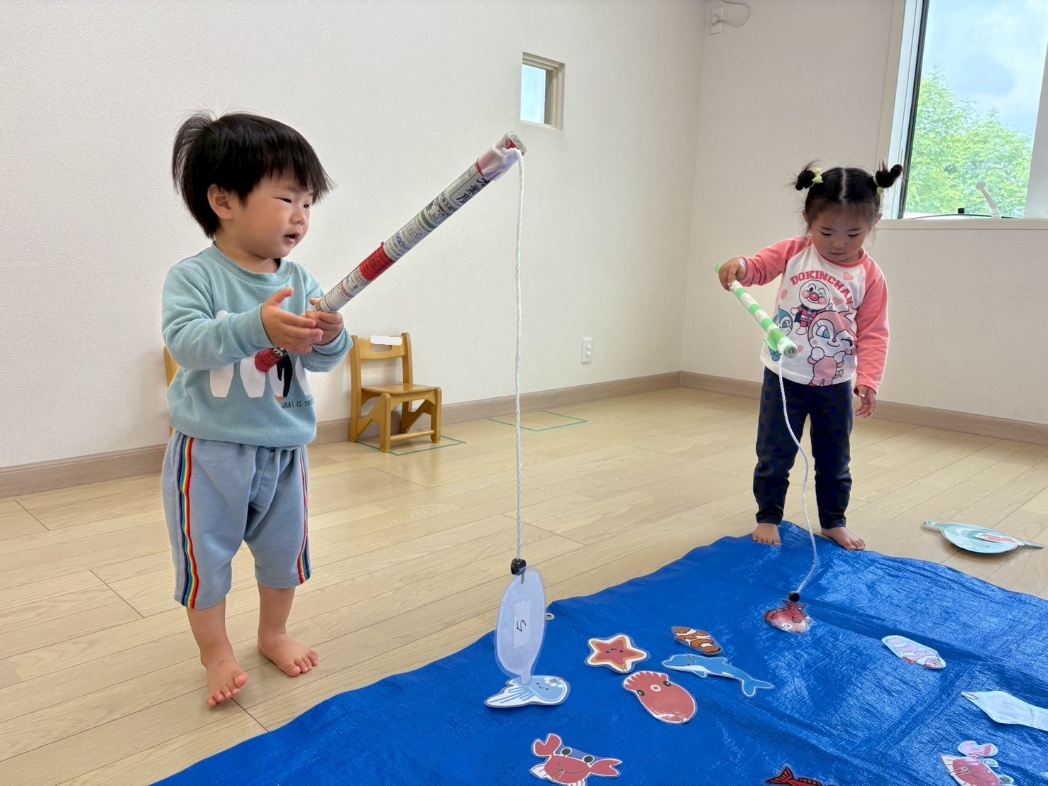 今回くまグループはブルーシートで海を作って、魚釣りゲームを行いました。