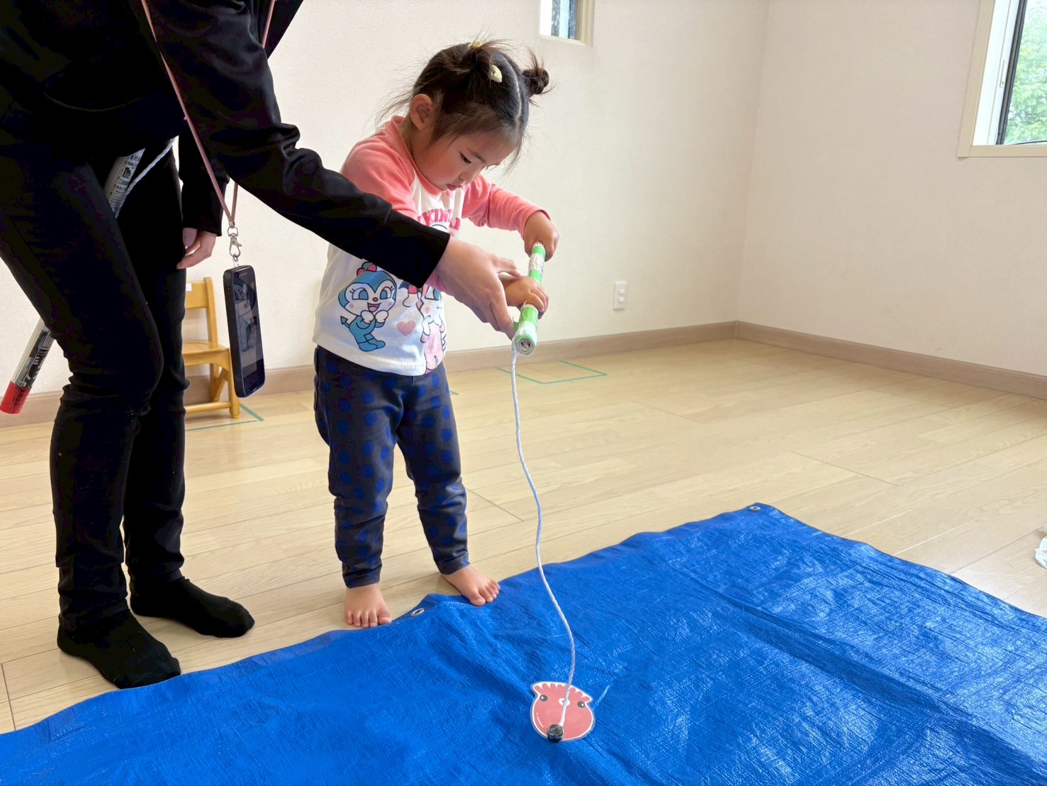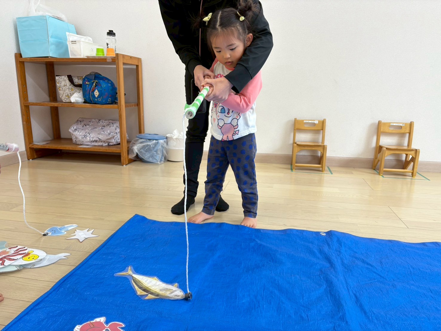 初めは大きな竿を両手で持ったり、狙った魚に向けて竿を下ろしたりすることが難しく、なかなか釣ることができませんでしたが、職員が手添えをして慎重に竿を動かす練習をする事で一人でお魚を釣ることができるようになりました!