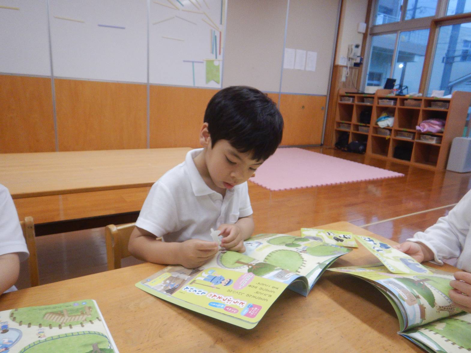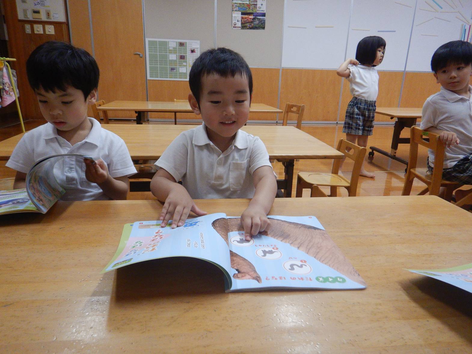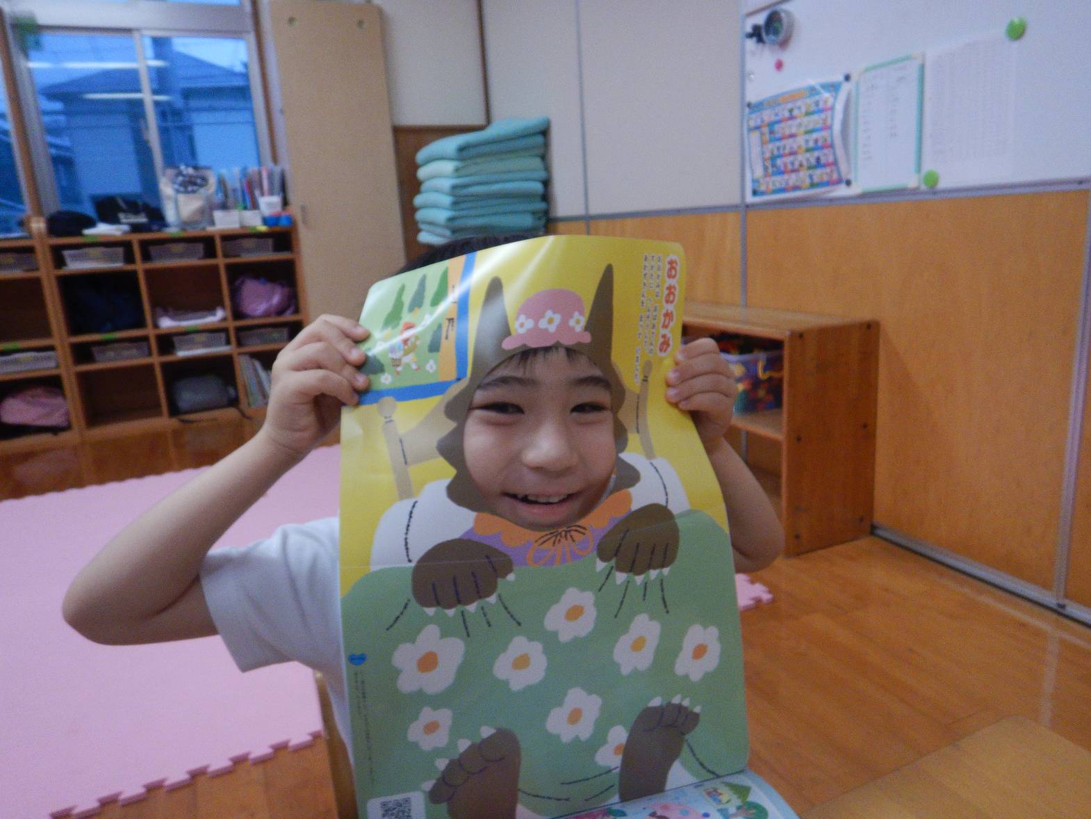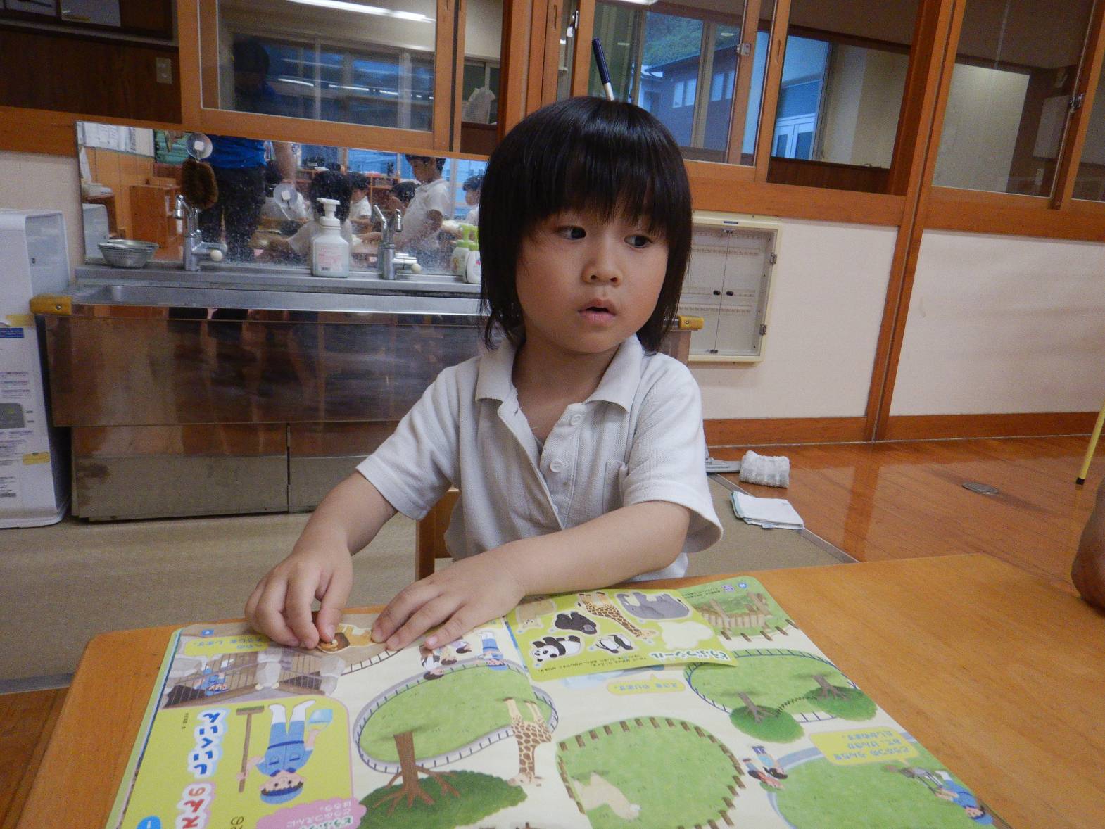 今月の月間絵本「なんで?」は動物についてのお話でした。 「動物さんのお家のお掃除してるんだね!」「ご飯あげてるんだね!」と動物園の人がどんなお仕事をしているのかに興味心身の子どもたち。 他にも動物のクイズや迷路を楽しんだうさぎ組さんでした。