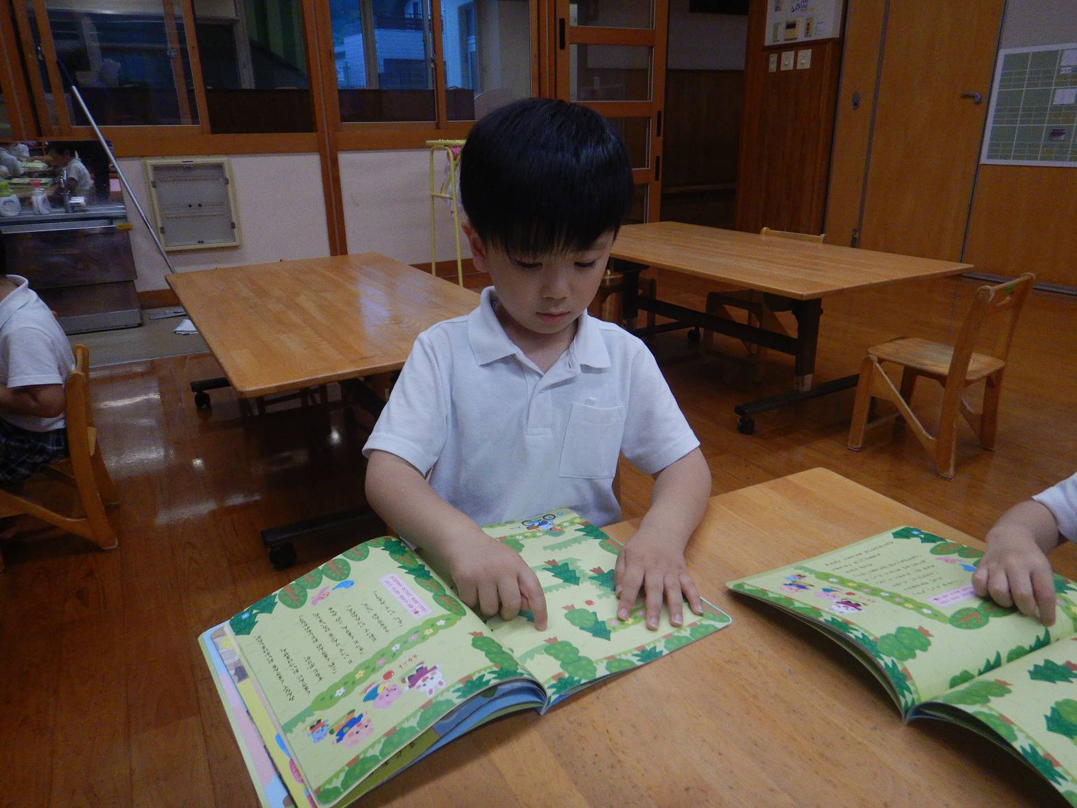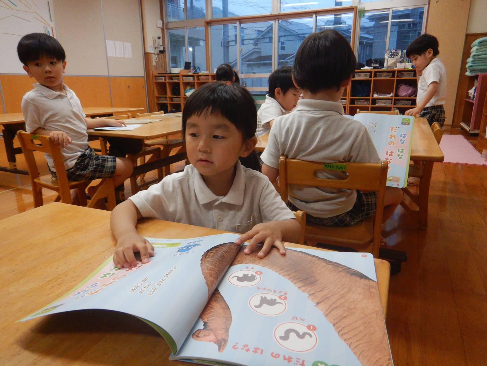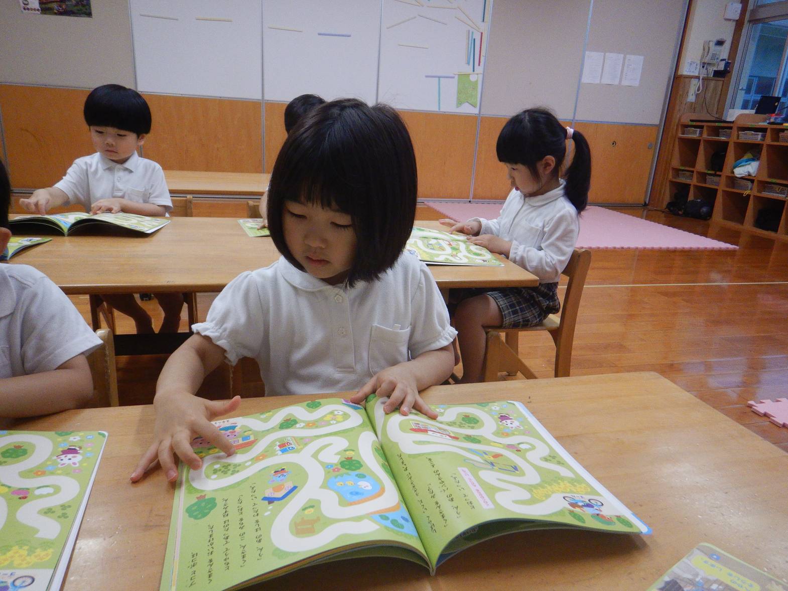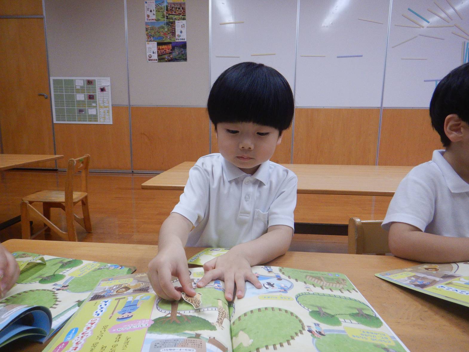 今月の月間絵本「なんで?」は動物についてのお話でした。 「動物さんのお家のお掃除してるんだね!」「ご飯あげてるんだね!」と動物園の人がどんなお仕事をしているのかに興味心身の子どもたち。 他にも動物のクイズや迷路を楽しんだうさぎ組さんでした。