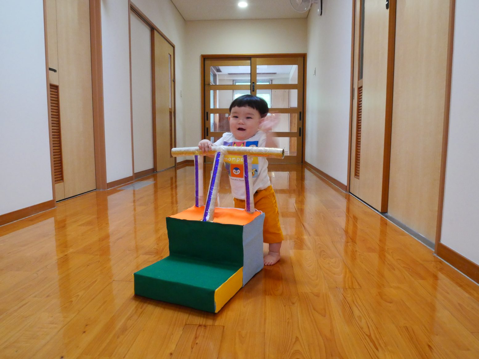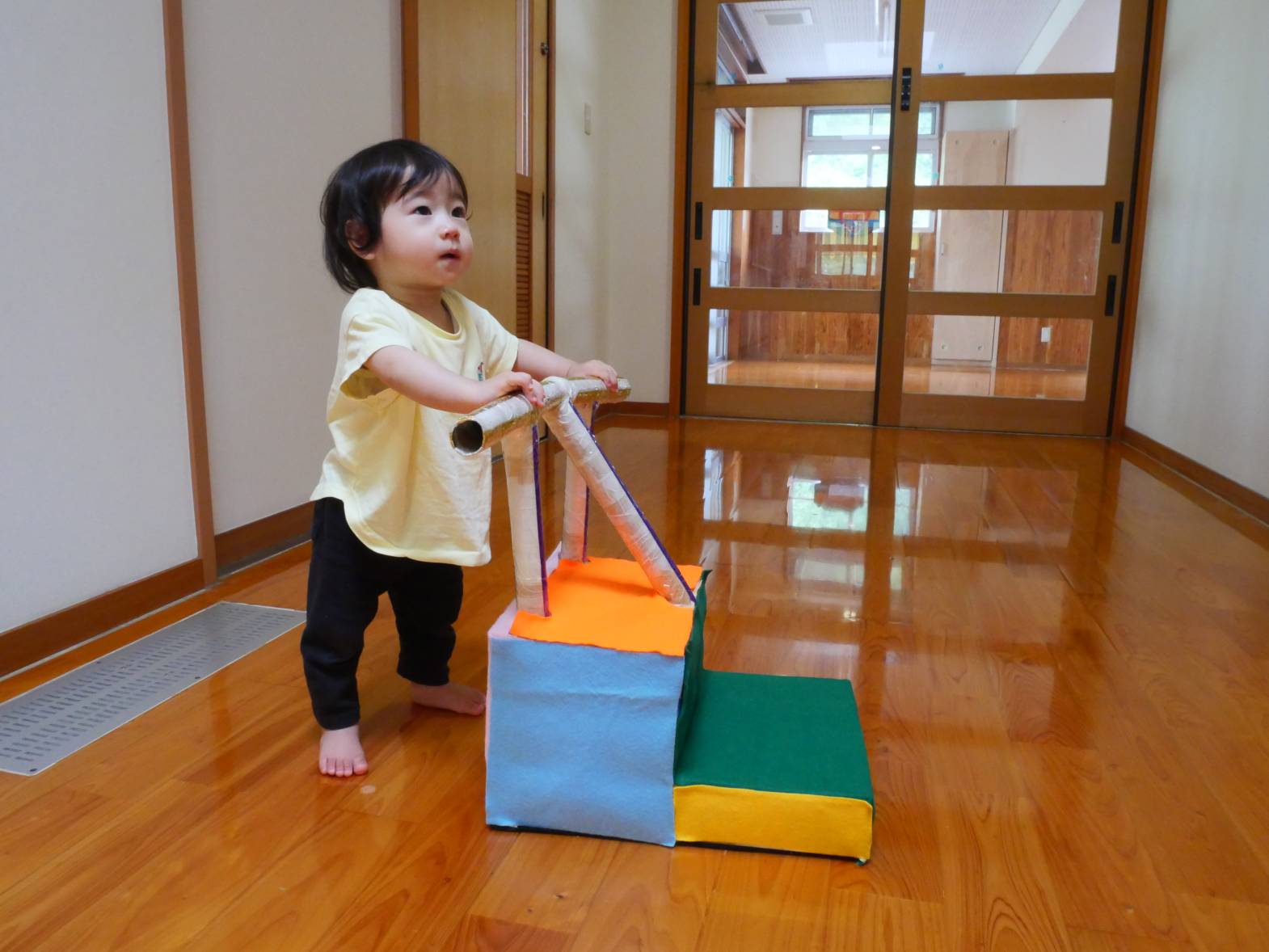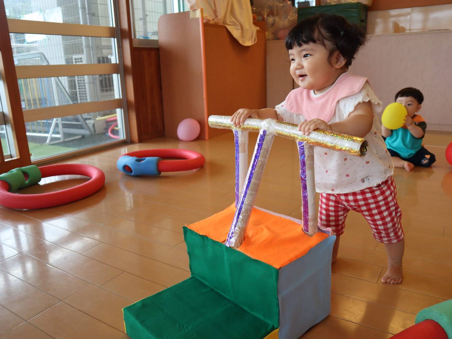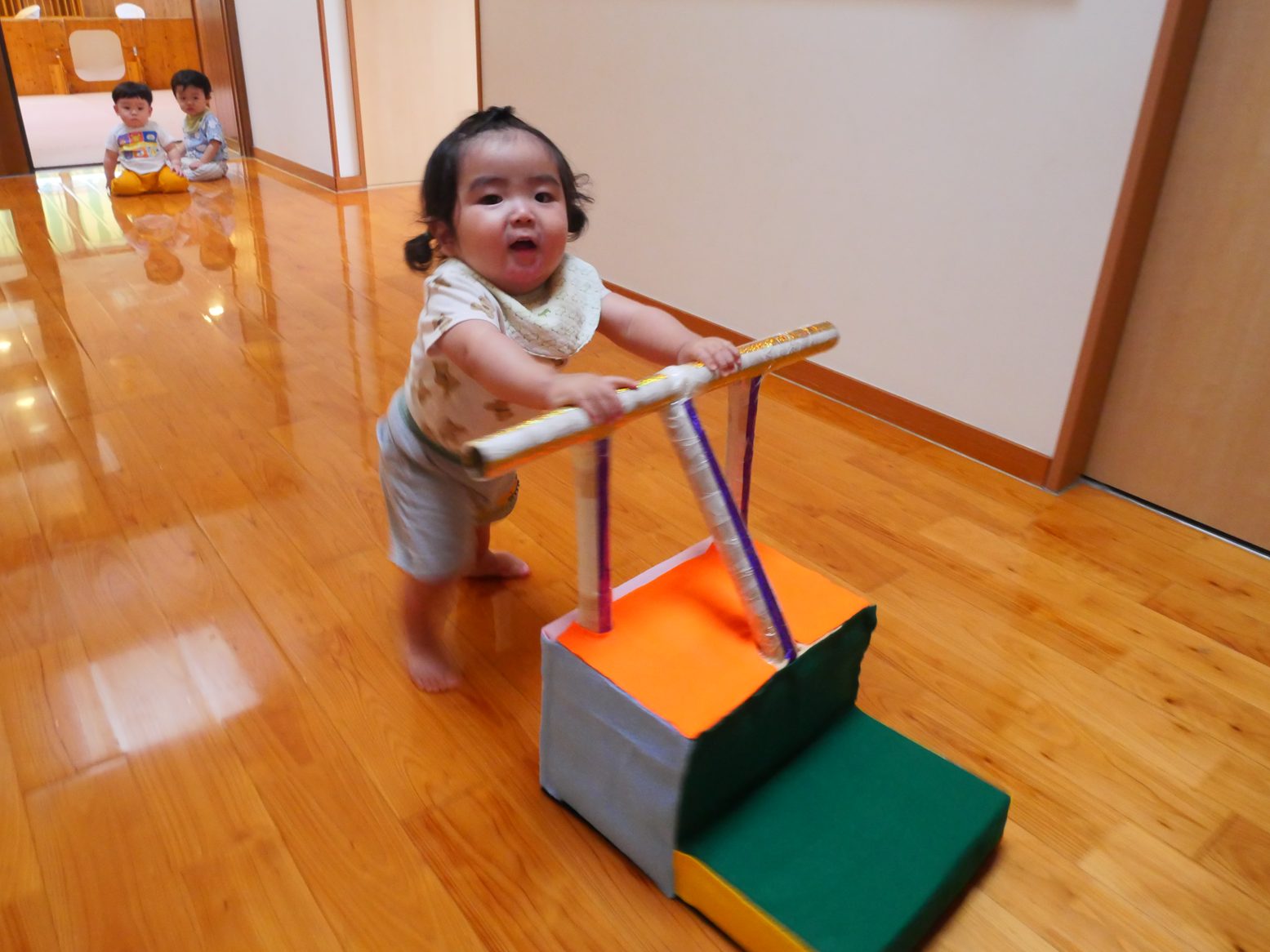 ひよこ組さんに手押し車が登場しました! 「なんだこれ?」と興味津々な様子の子どもたち。 ゆっくりと前に押して、自分のペースで歩けることに「あ!」と嬉しそうな表情です。 「上手上手~!」と声を掛けると得意気にどんどん進んでいく子どもたち。 手押し車を気に入ってくれたようです! 掴まり立ちや伝い歩きがとっても上手になってきたひよこ組さん。 安全に歩行の練習ができるよう、側で見守っていけたらと思います。