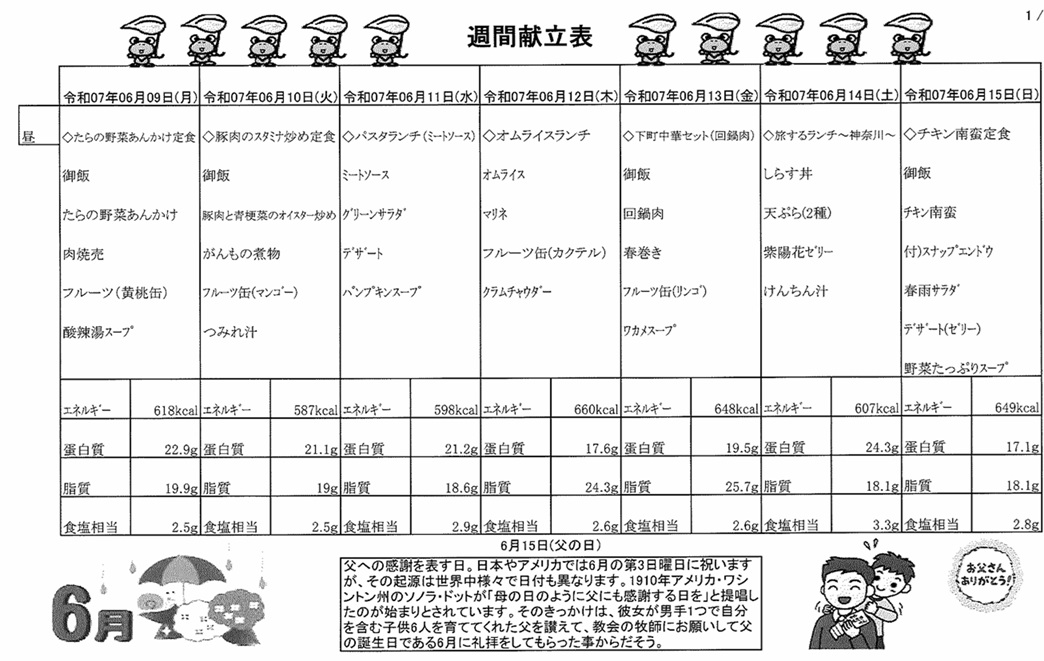 6月9日(月)~6月15日(日)の献立表になります。ぜひご覧ください。
