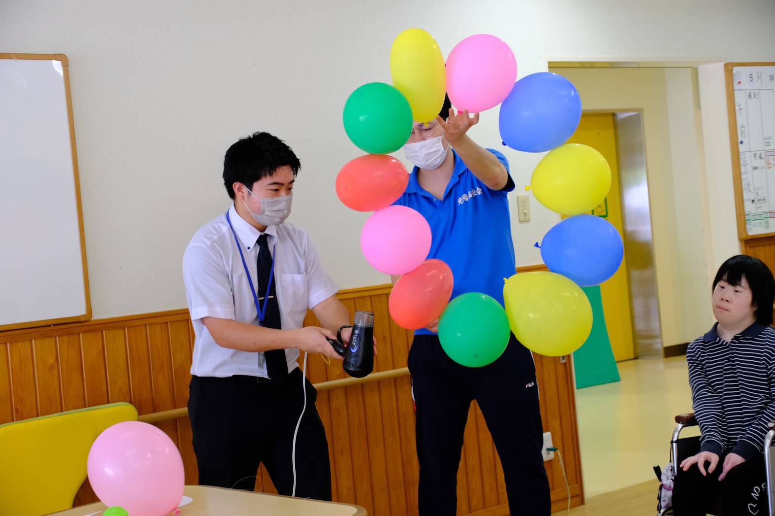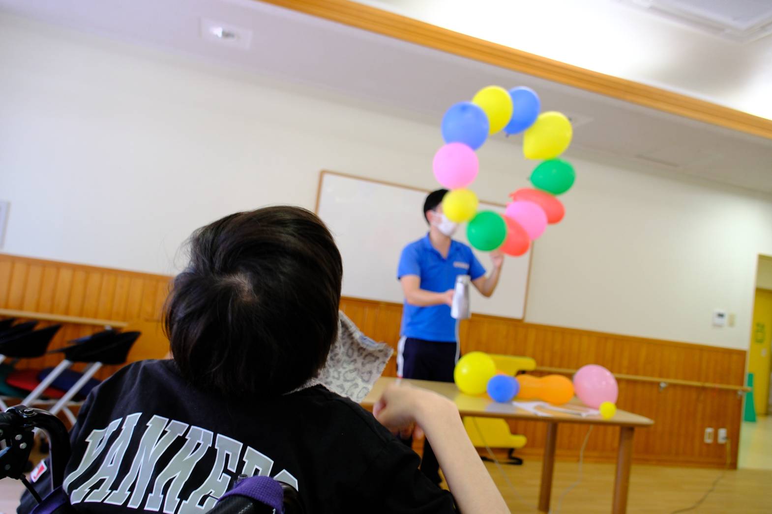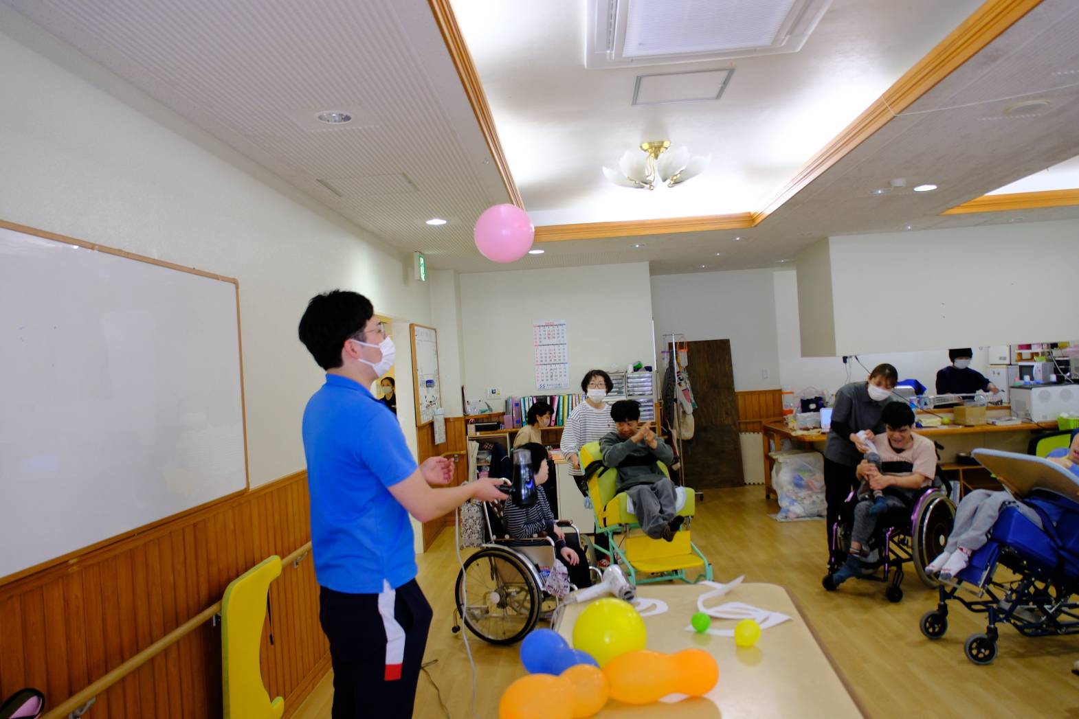 ふわふわ浮かぶボールを叩いたり、浮いているボールの下に手を入れてみたり様々な反応が見られました。