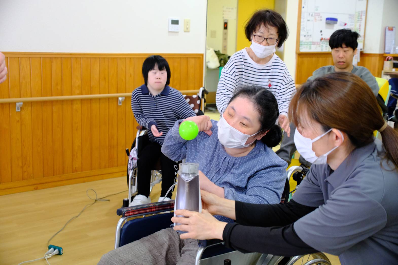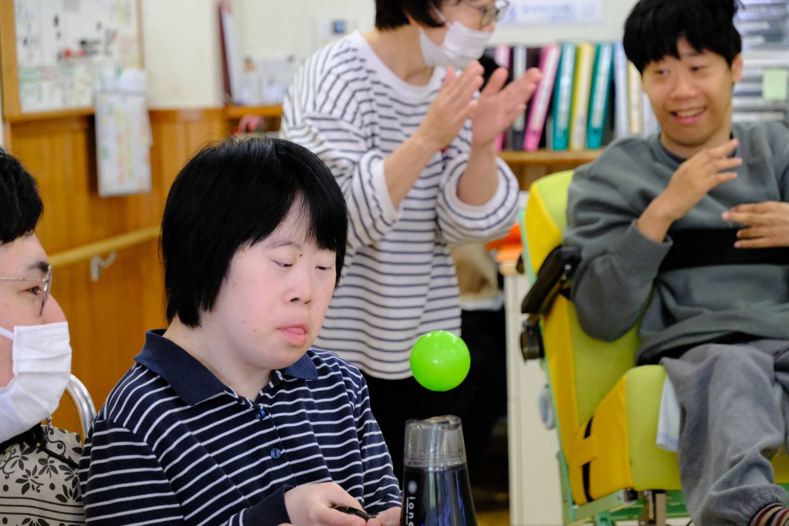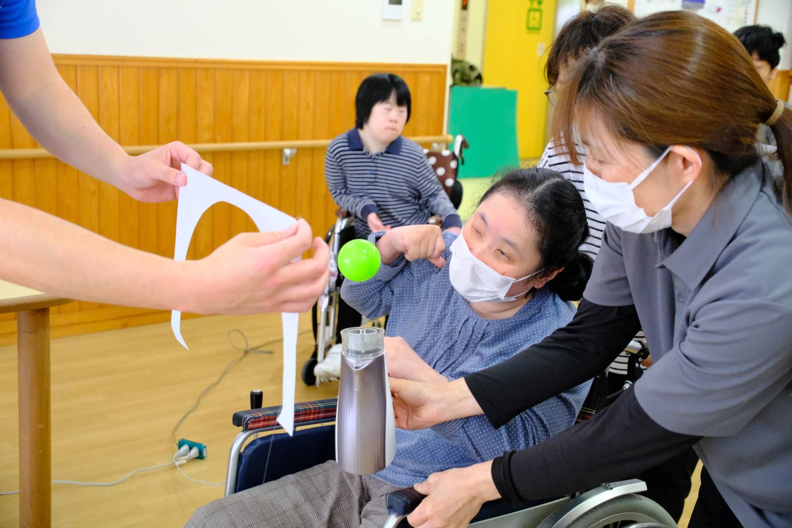 ふわふわ浮かぶボールを叩いたり、浮いているボールの下に手を入れてみたり様々な反応が見られました。