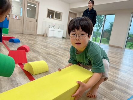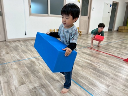 くま・とらグループでお引越しゲームを行いました。 ホールの中心に置かれた様々なブロックを両端からスタートし、自分たちの陣地に運ぶルールで取り組みます。 「よーい、スタート!」の合図でブロック目掛けて、走り出す子どもたち。 「僕はこれ!」「よいしょ。よいしょ。」と思い思いにブロックを運びます。 自分の身体よりも大きいブロックを一人で持ち運ぶ子もいましたよ☆ 時間いっぱいブロックを運びを行い、力持ちなくま・とらグループさんでした!