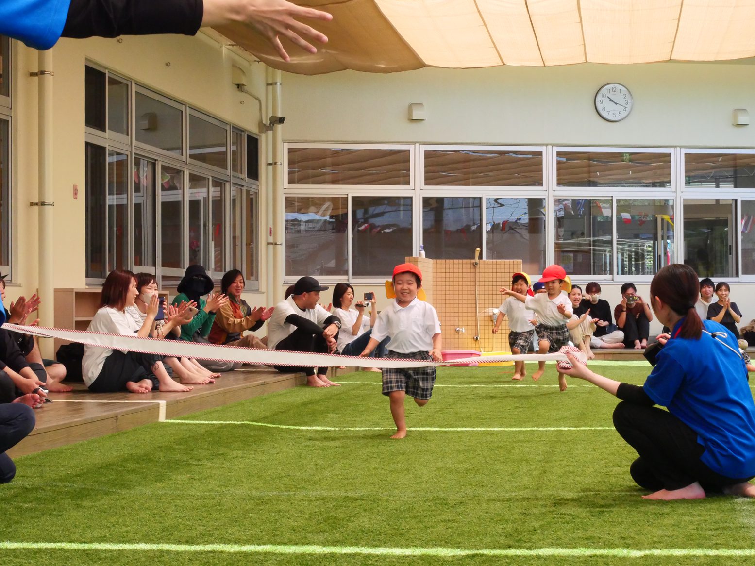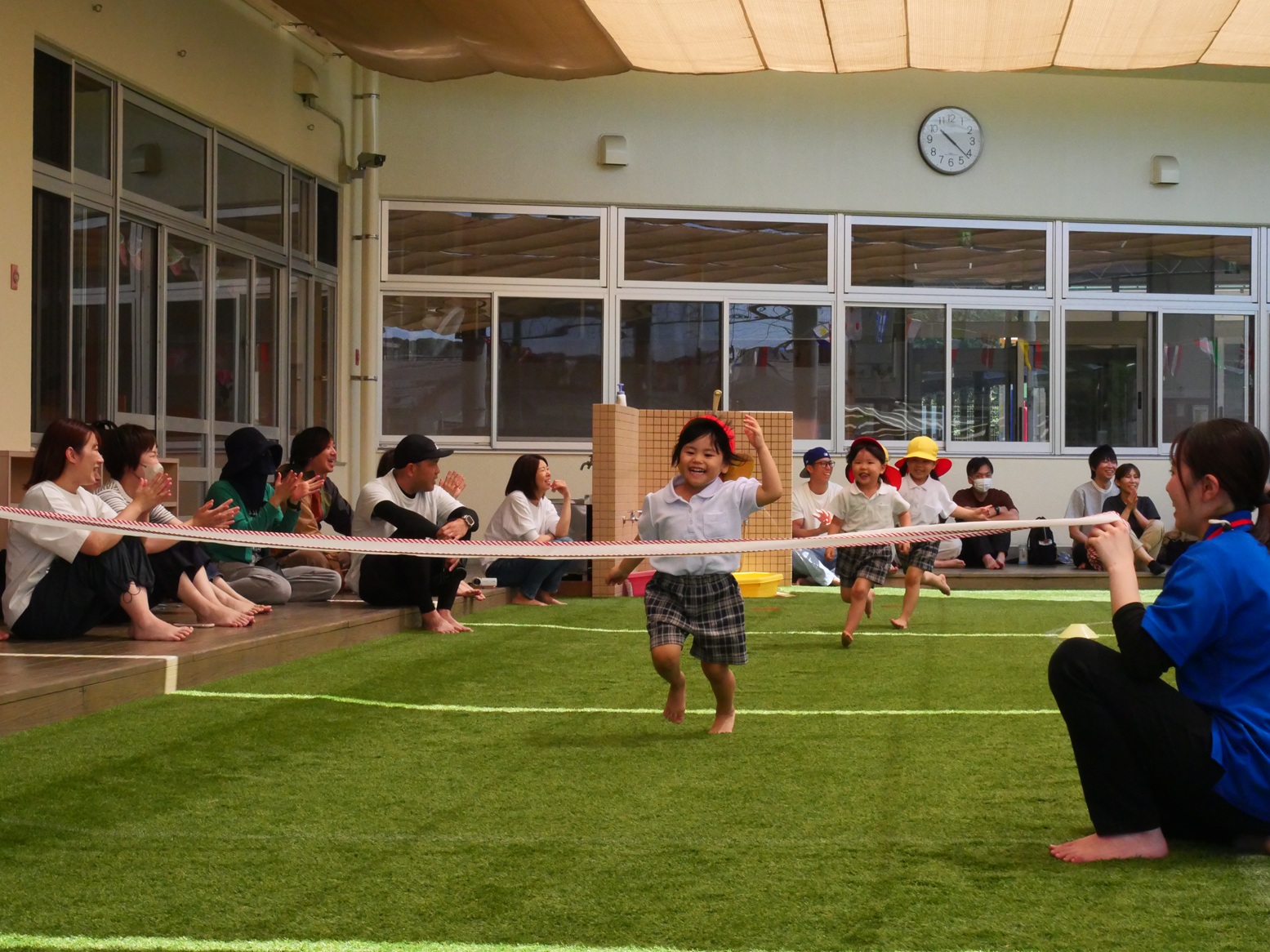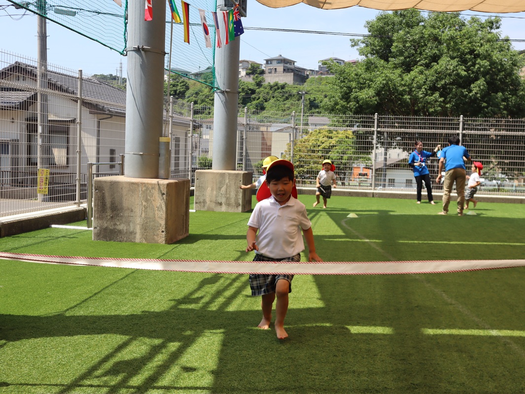かけっこでは、名前を呼ばれると元気よく返事をし、ゴールまで一生懸命走りきるりす組さん!