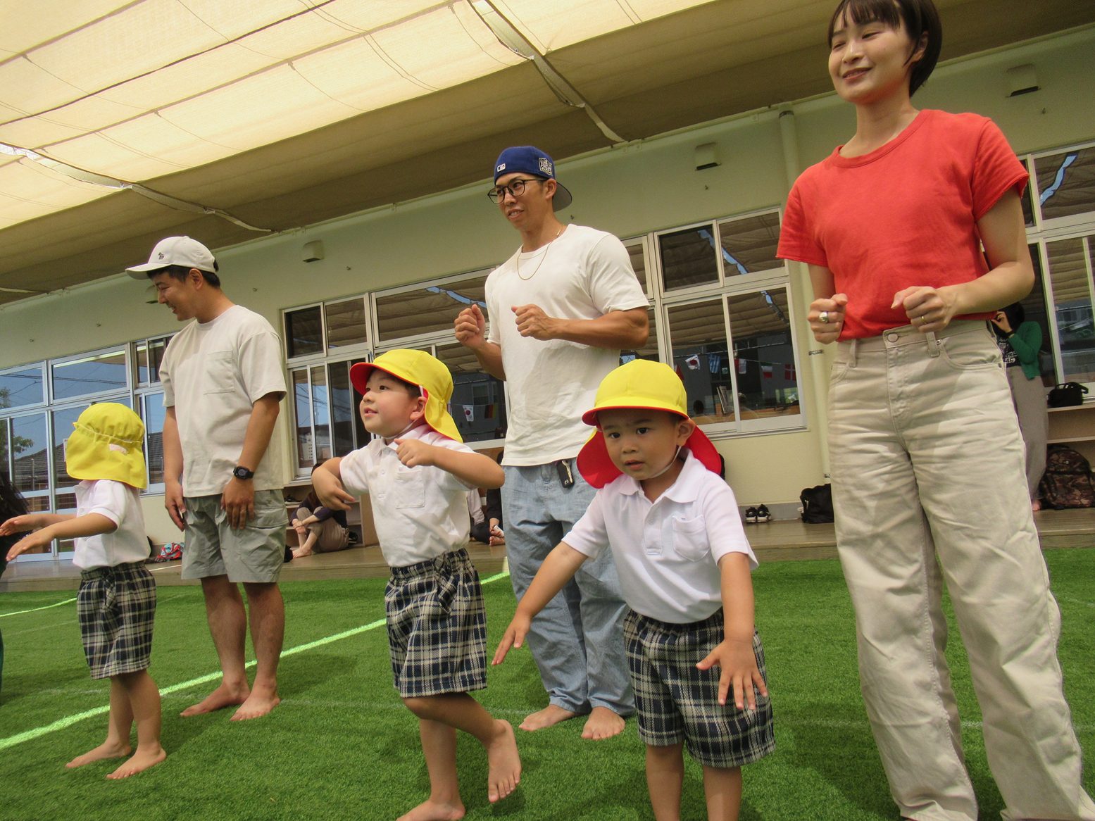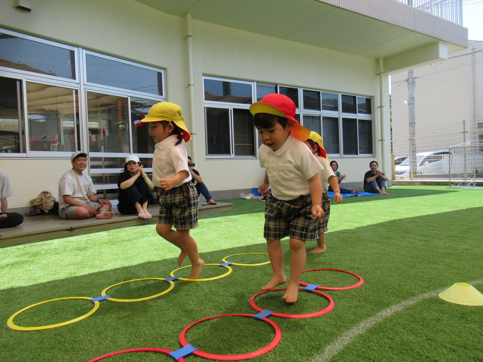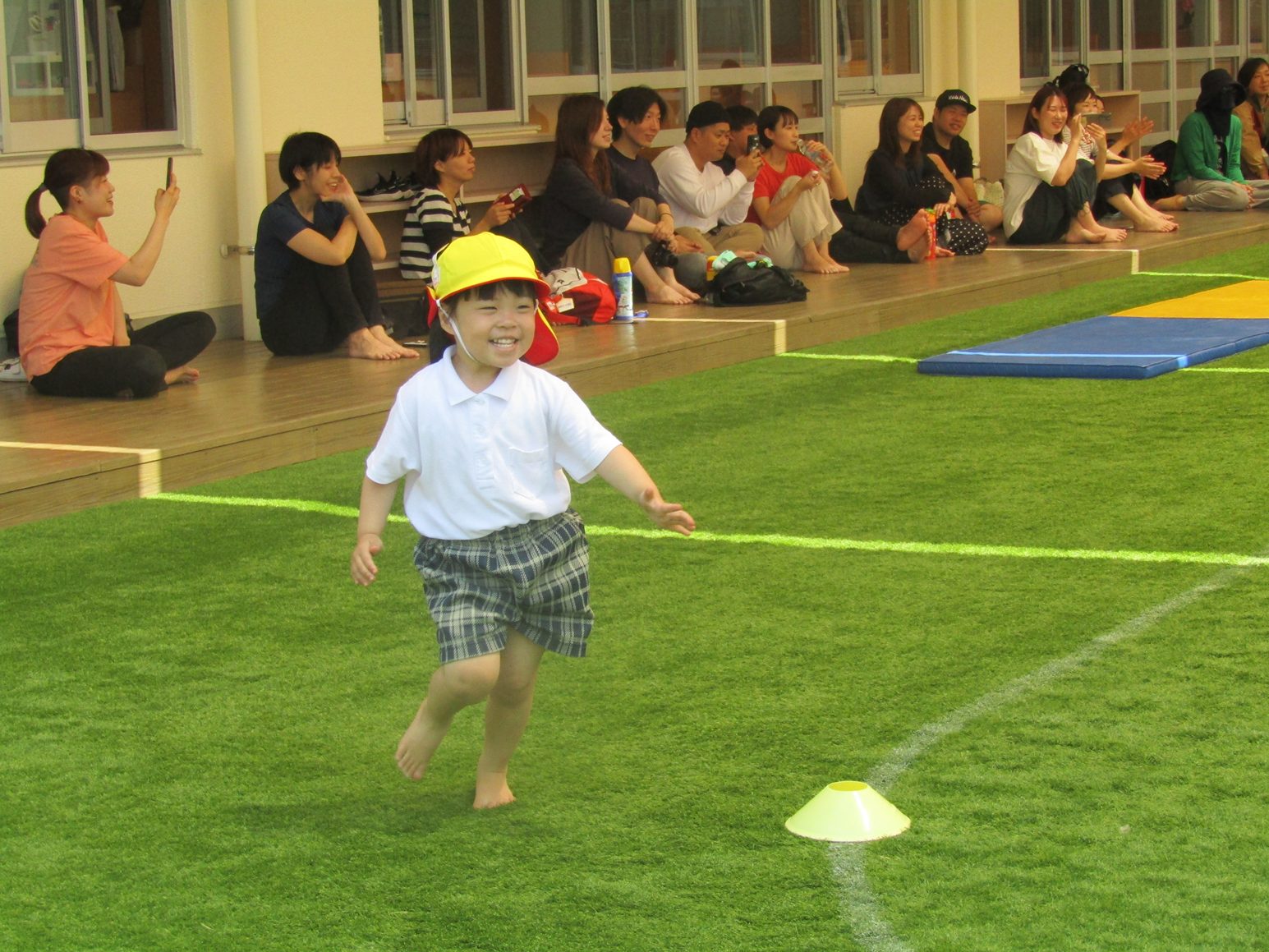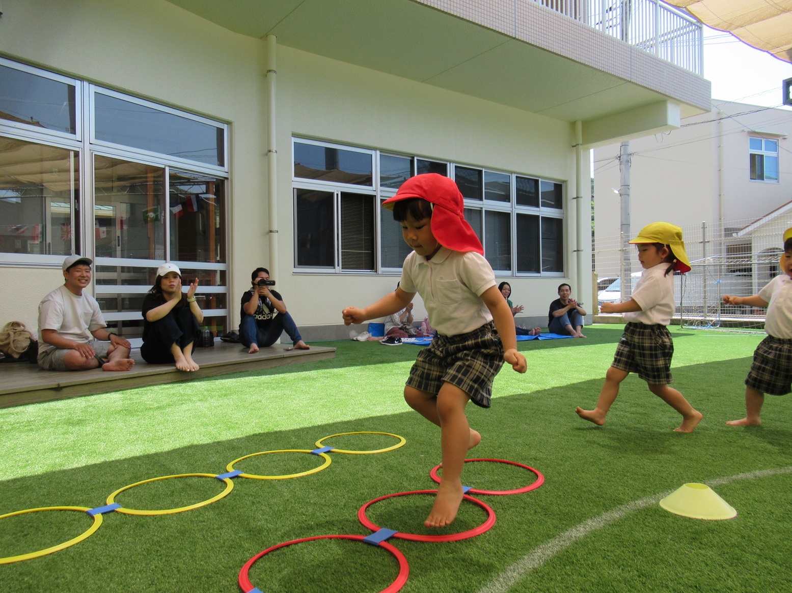 障害物競走では、両足ジャンプやクマ歩き、タッチ板など色々な壁がありましたが、一つずつ丁寧に挑戦する姿が見られました。