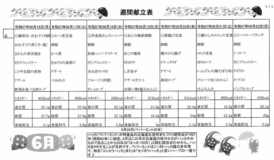 6月16日(月)~6月22日(日)の献立表になります。ぜひご覧ください。