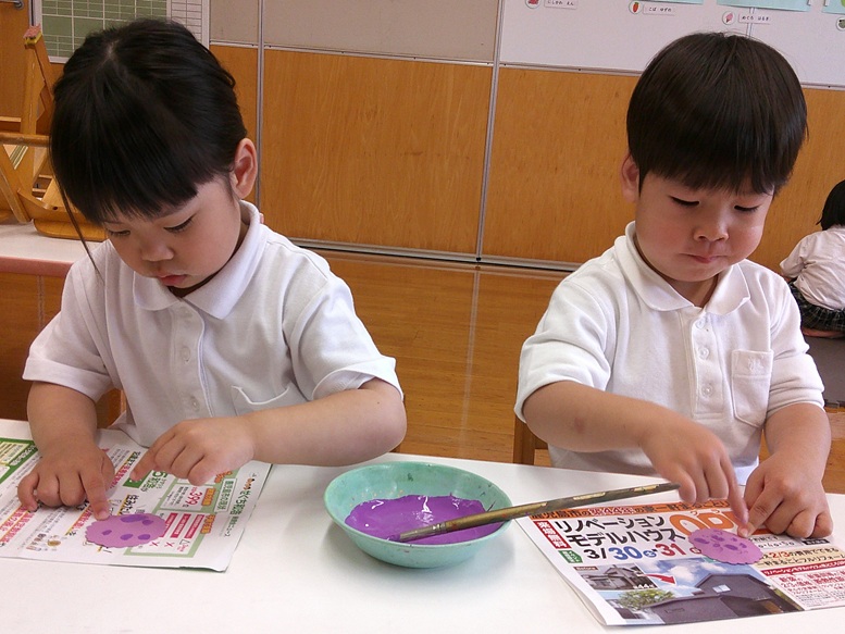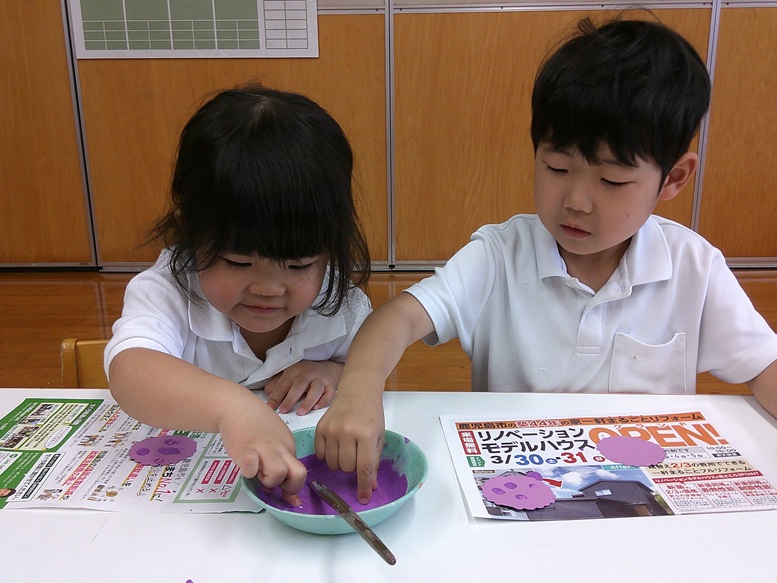 「だんだんアジサイに見えてきた!」「スタンプ楽しい!」と言いながら作るりす組さん。