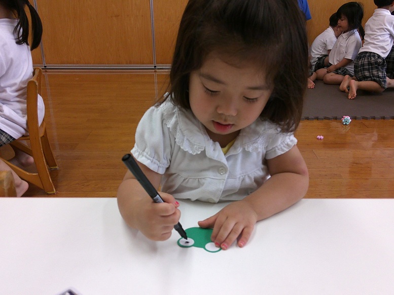 カエルは目にシールを貼り、油性ペンとクレヨンを使って上手に顔を描きました。