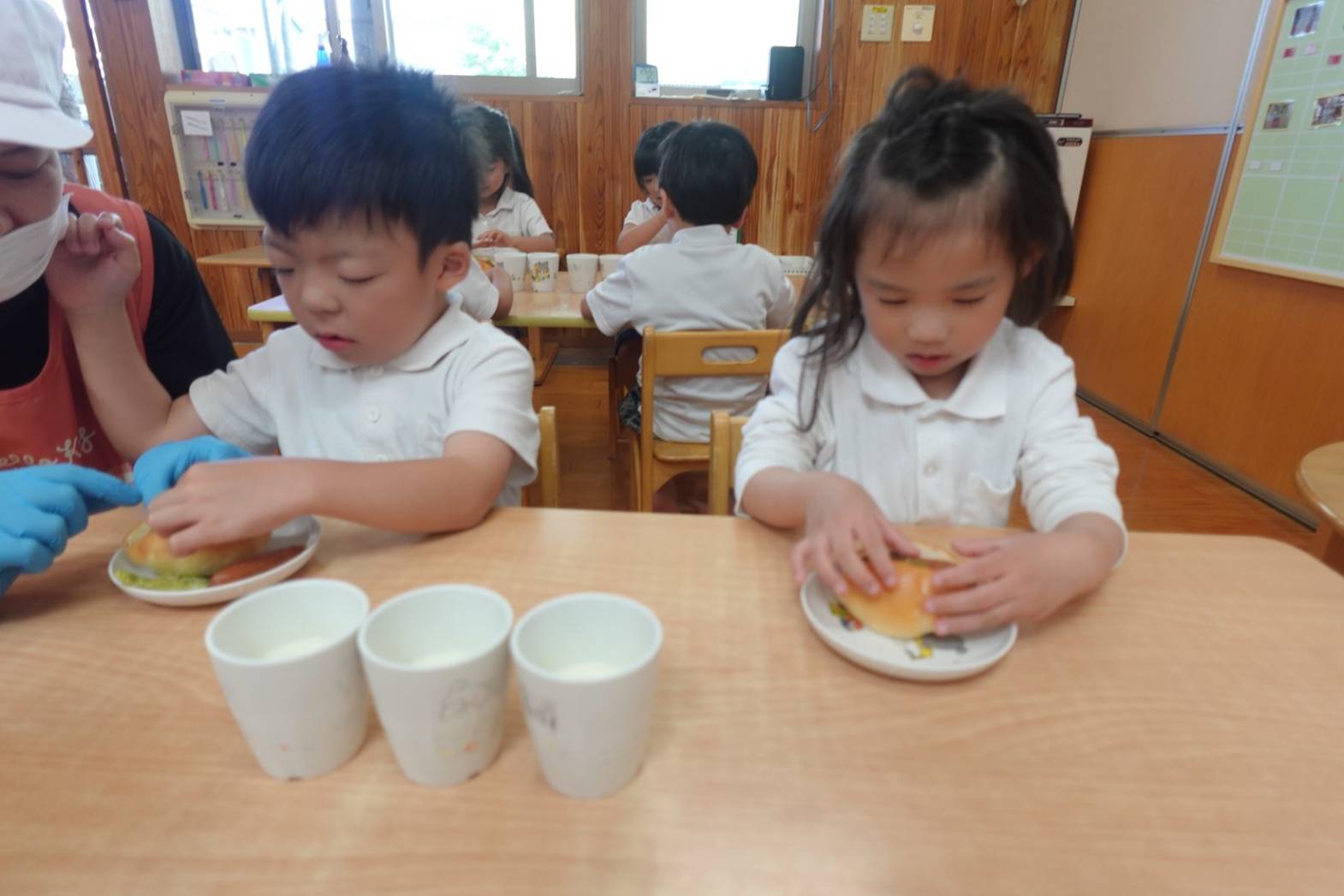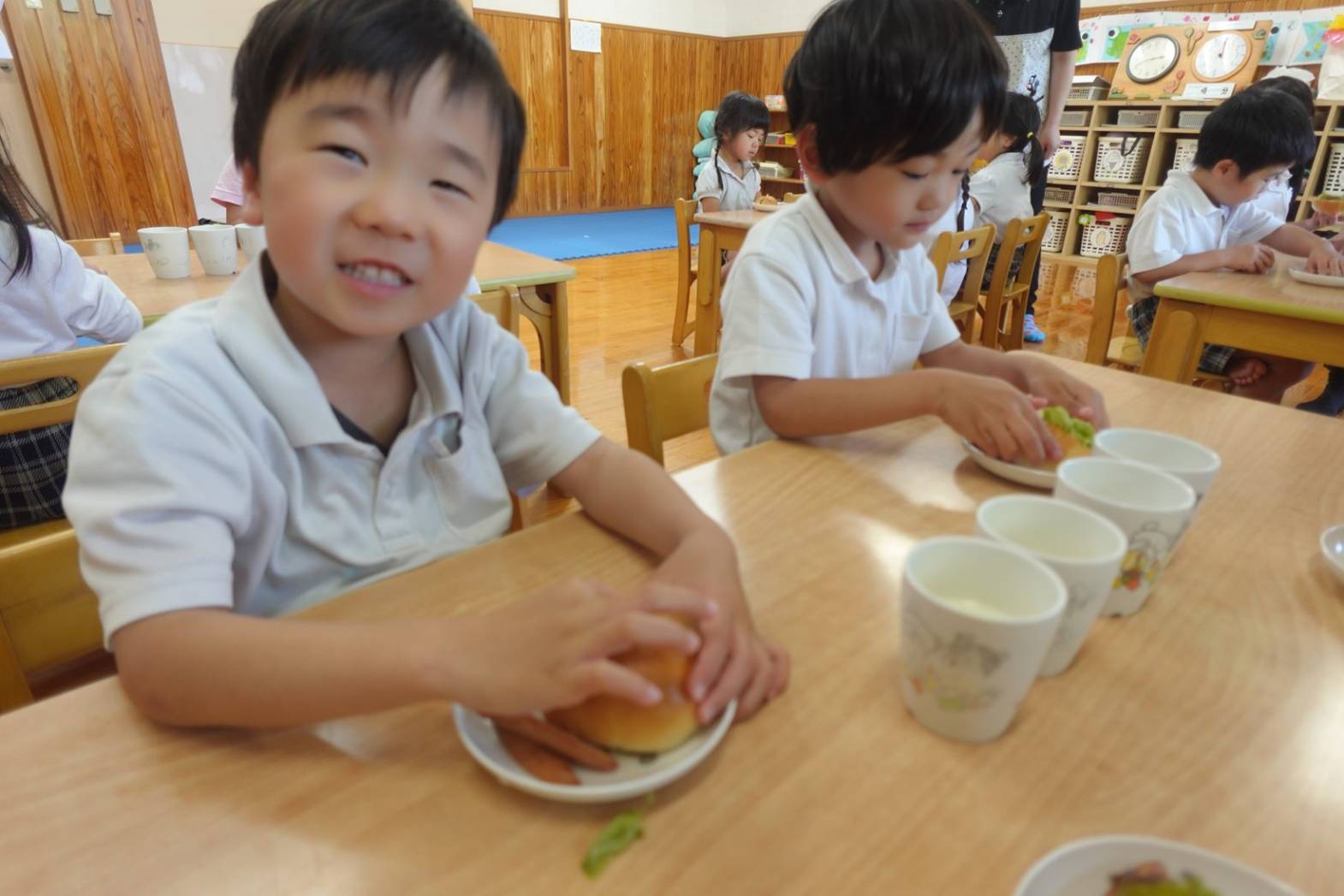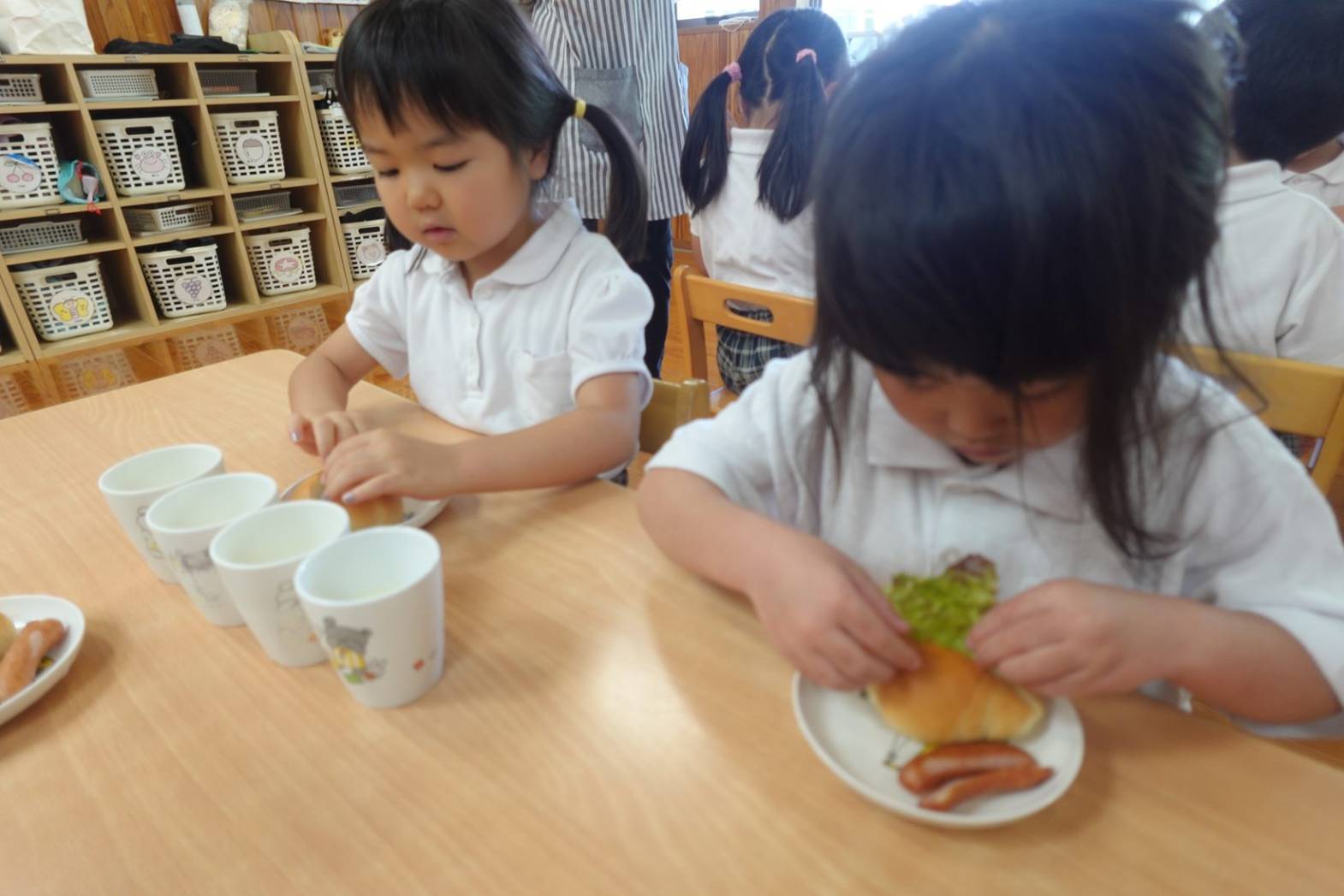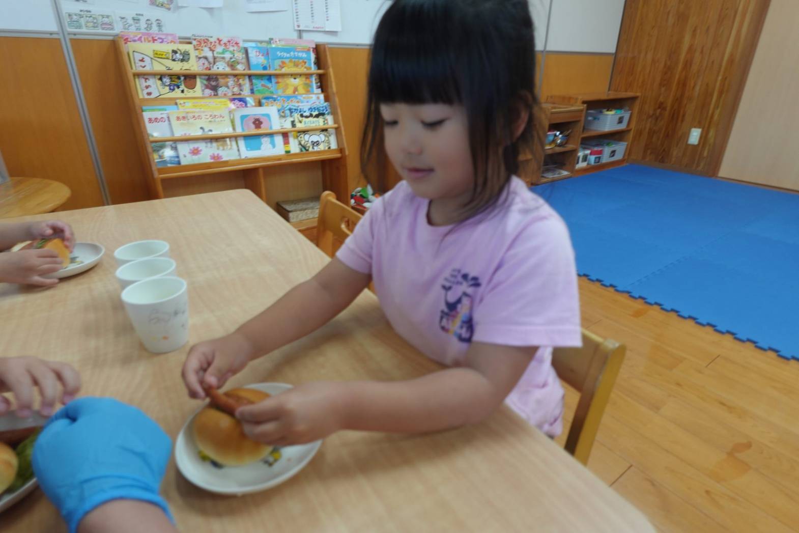 おやつの時間にホットドック作りがありました。 お昼寝から起きて「今日のおやつはホットドックを作るよ」と言うと、大喜びの子どもたち。 先生の説明を聞いて、レタスとウインナーを自分たちで挟みました。 完成したらみんな大きなお口でがぶり! 「自分で作ると美味しいね」と、大満足の子どもたちでした♪