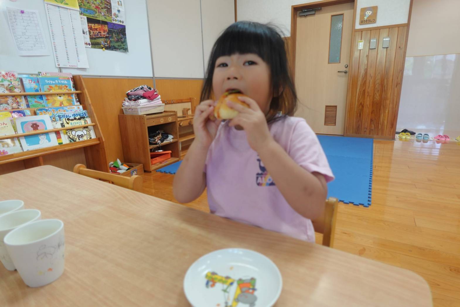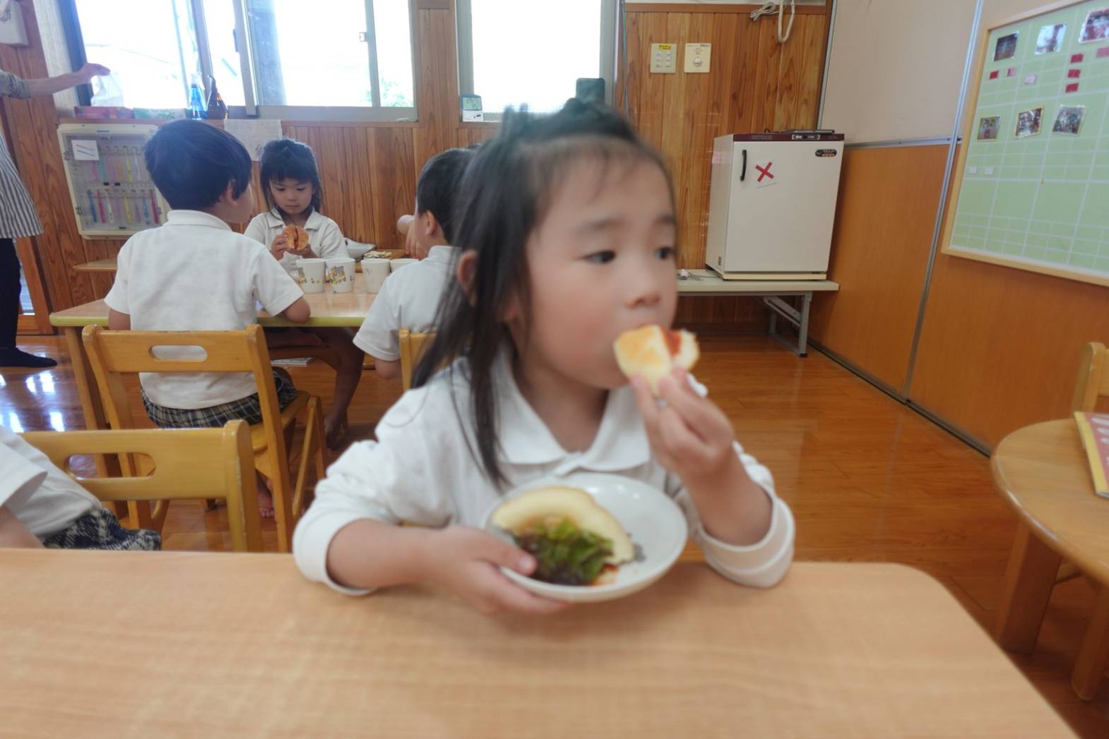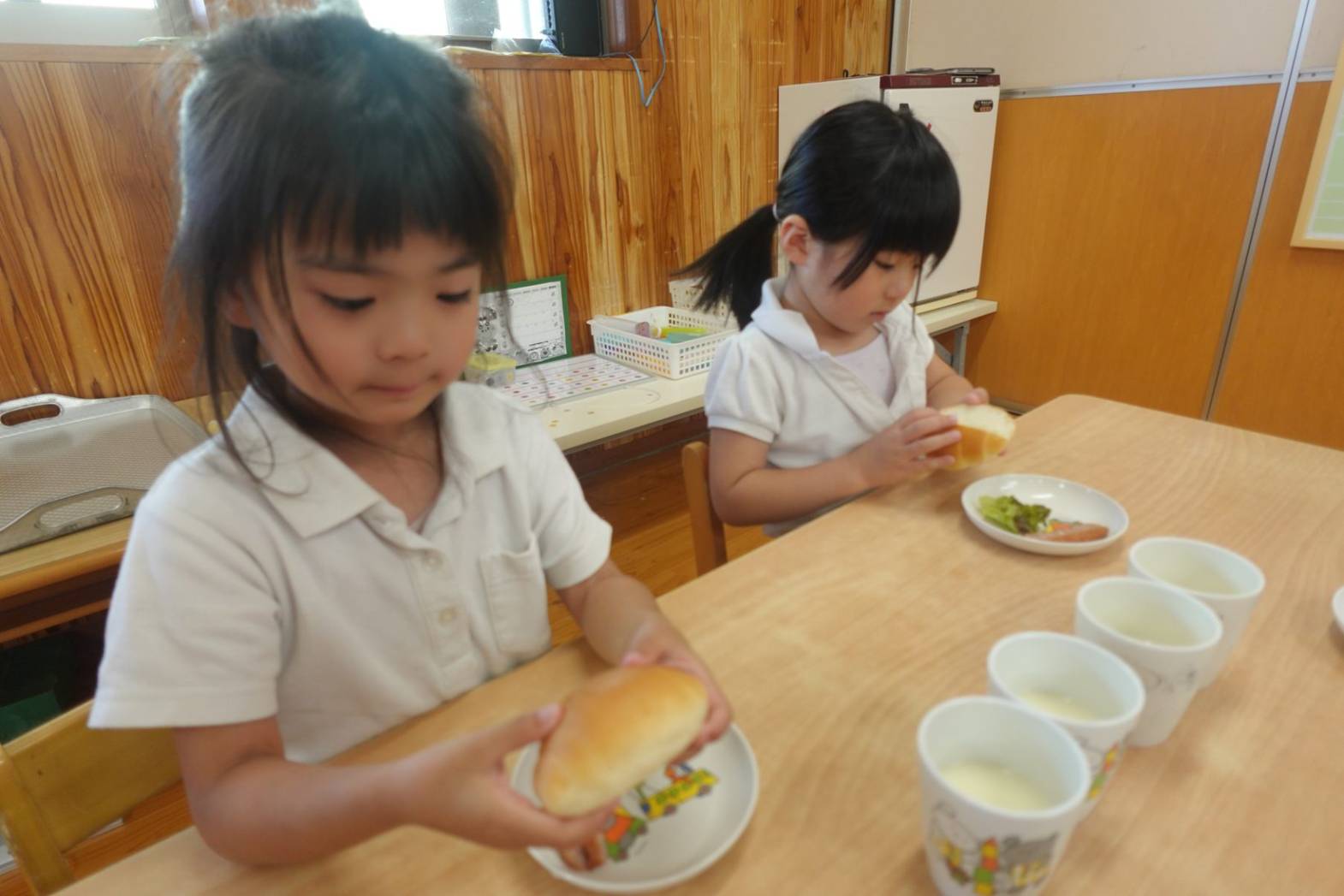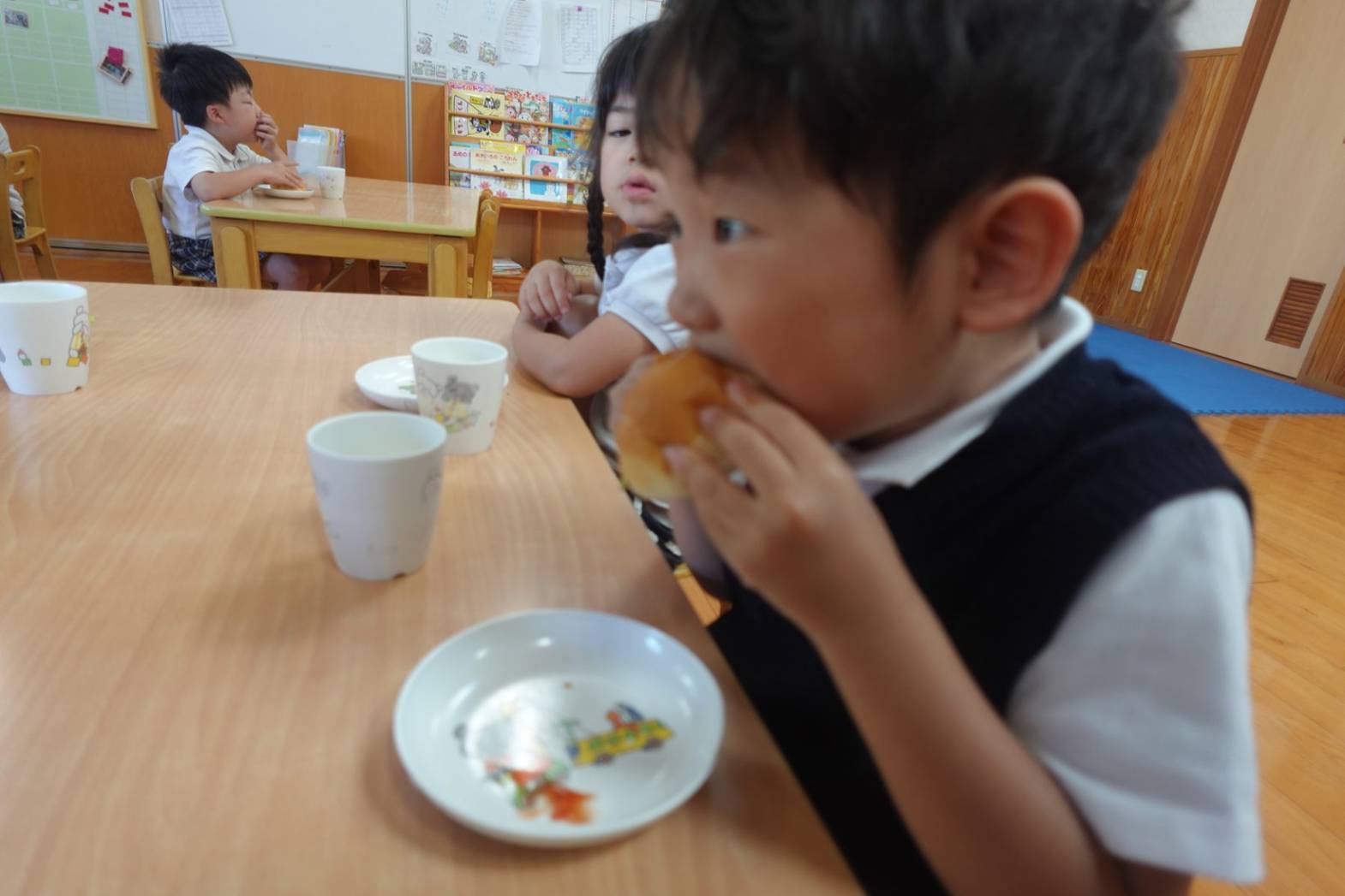 おやつの時間にホットドック作りがありました。 お昼寝から起きて「今日のおやつはホットドックを作るよ」と言うと、大喜びの子どもたち。 先生の説明を聞いて、レタスとウインナーを自分たちで挟みました。 完成したらみんな大きなお口でがぶり! 「自分で作ると美味しいね」と、大満足の子どもたちでした♪