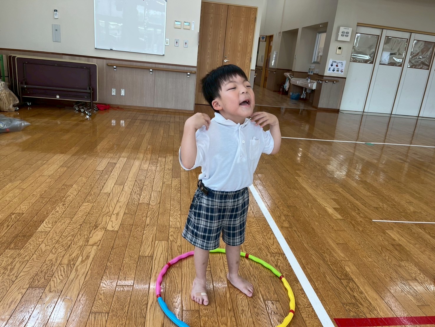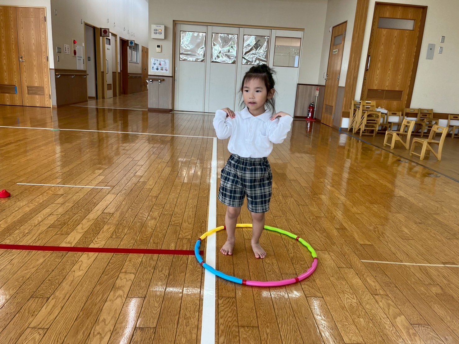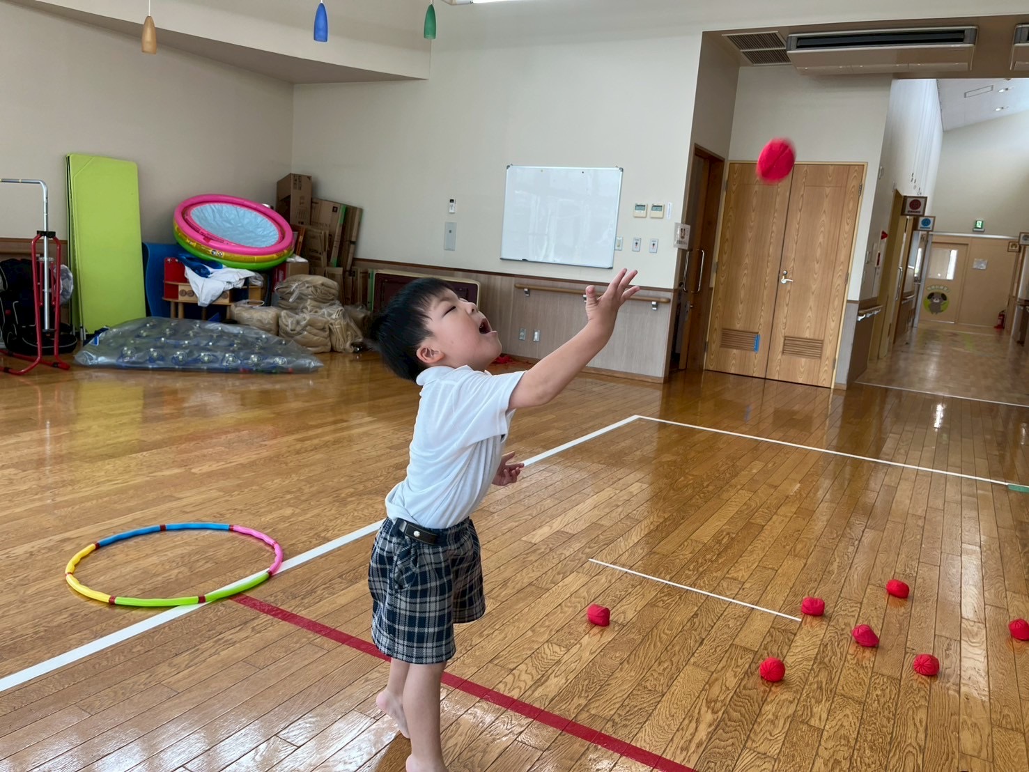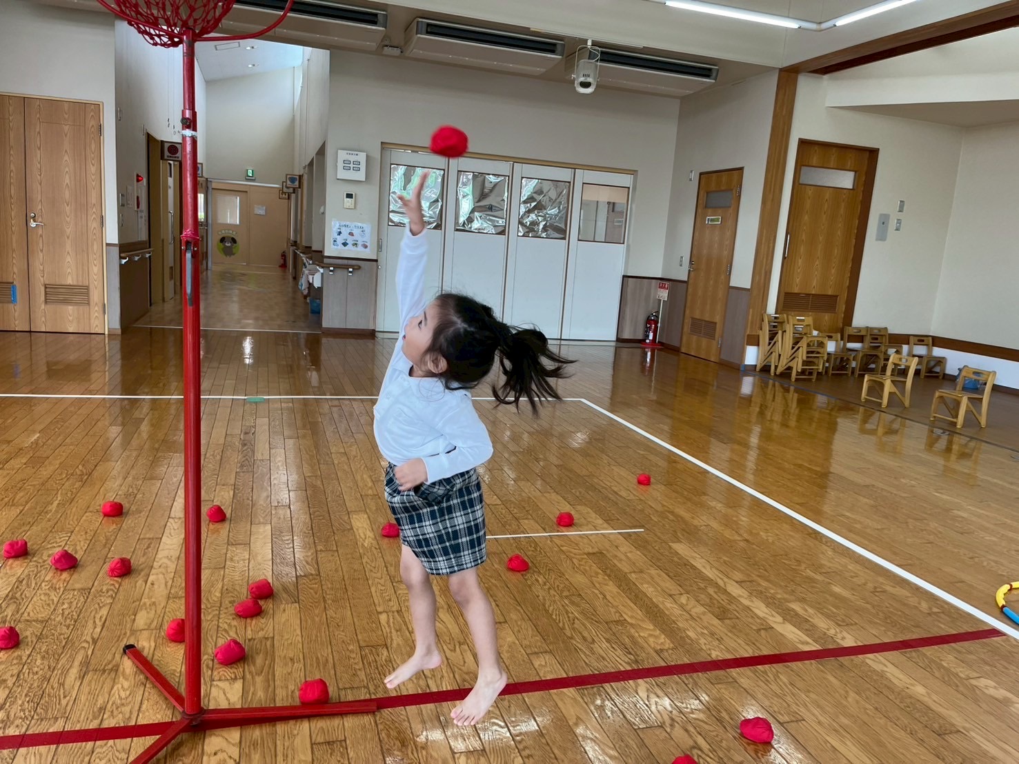 音楽が流れている間はダンスを行い、音楽が止まると籠に向かってお手玉を投げるルールで取り組んでいます。