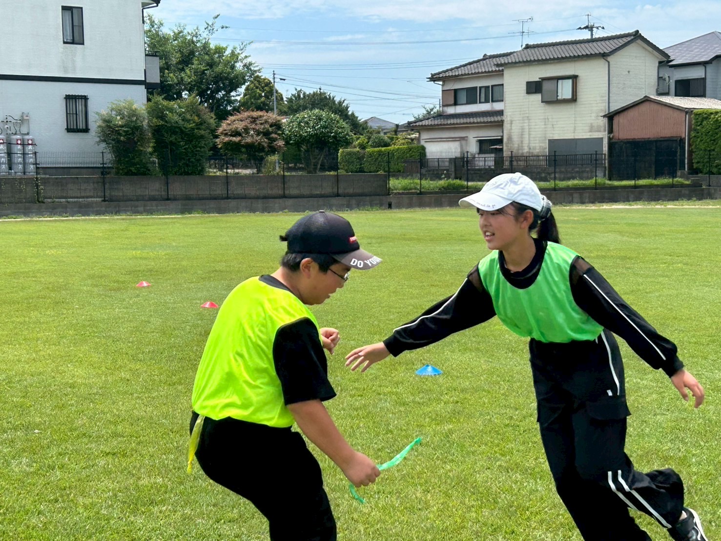 『跳び越えて、しゃがんでレース』では、二人で縄を掴み、コーンまで走ります。コーンで折り返し、スタート位置まで戻ると、待っている児童の足元に縄を通し、跳んで縄を避けると、次の二人組と交代し、最後の二人組が先にゴールしたチームの勝ちです!