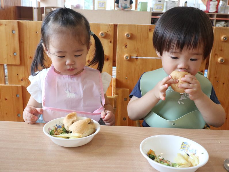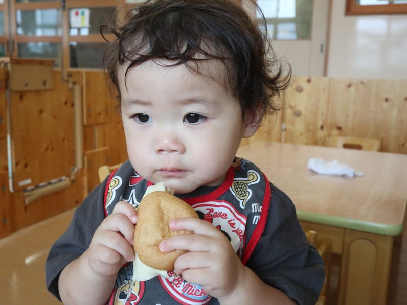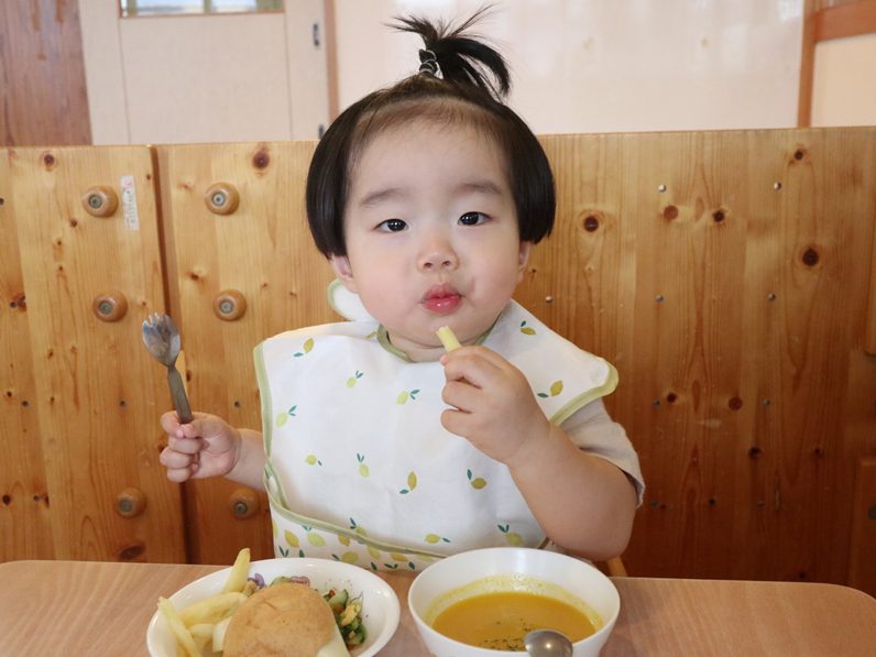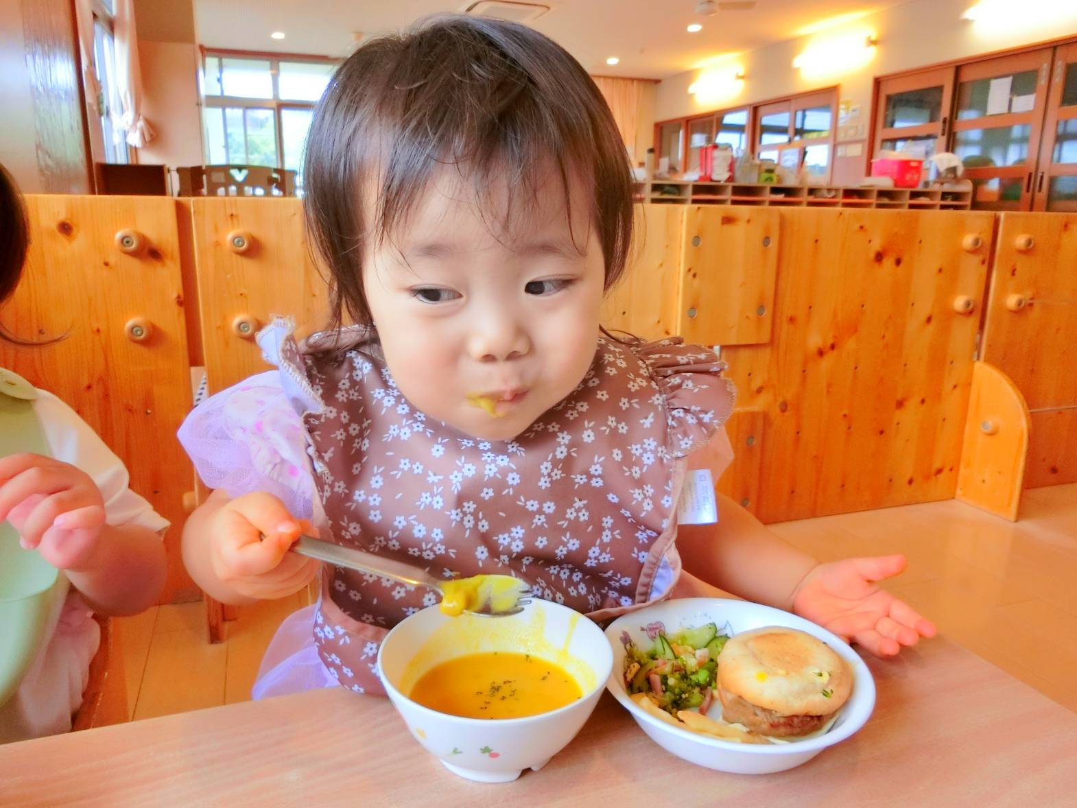 今日は、わくわくメニューの日でした。 給食を見ると、「うわ!美味しそう!」「ポテトだ」と目をキラキラ輝かせる子どもたち。 チーズバーガーやポテトに夢中になって食べ進めていきます! いつもと違う給食のメニューに「美味しい!」と満面の笑みを見せ、大満足のこあら組さんでした!