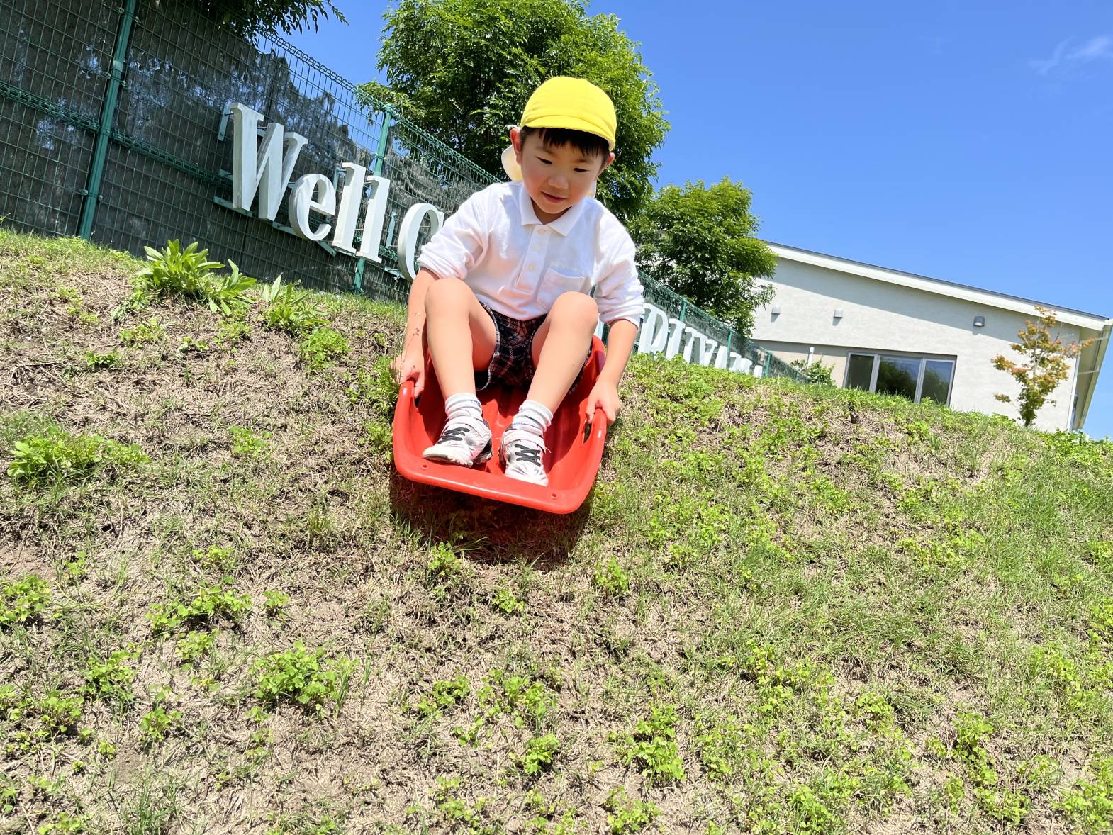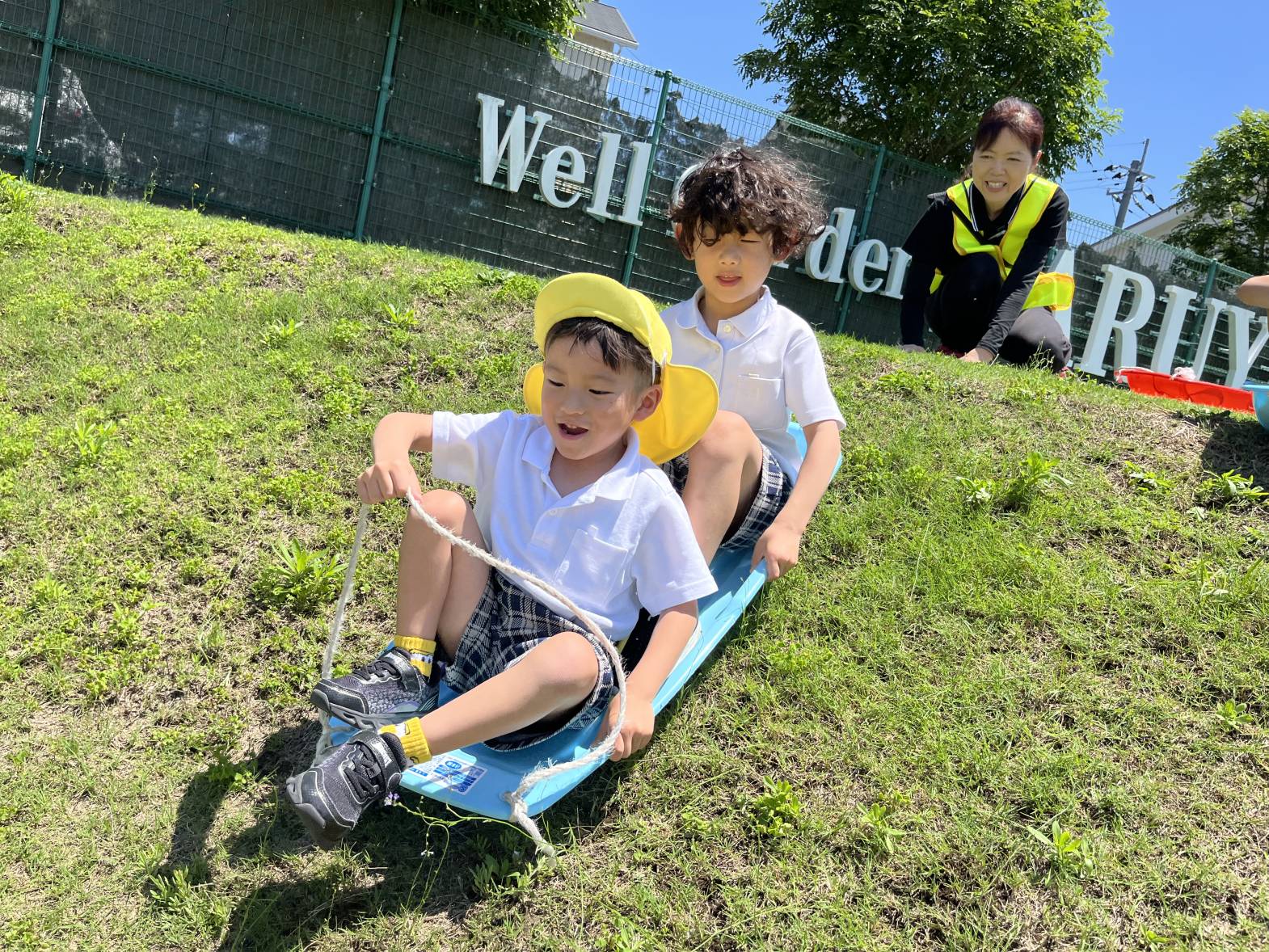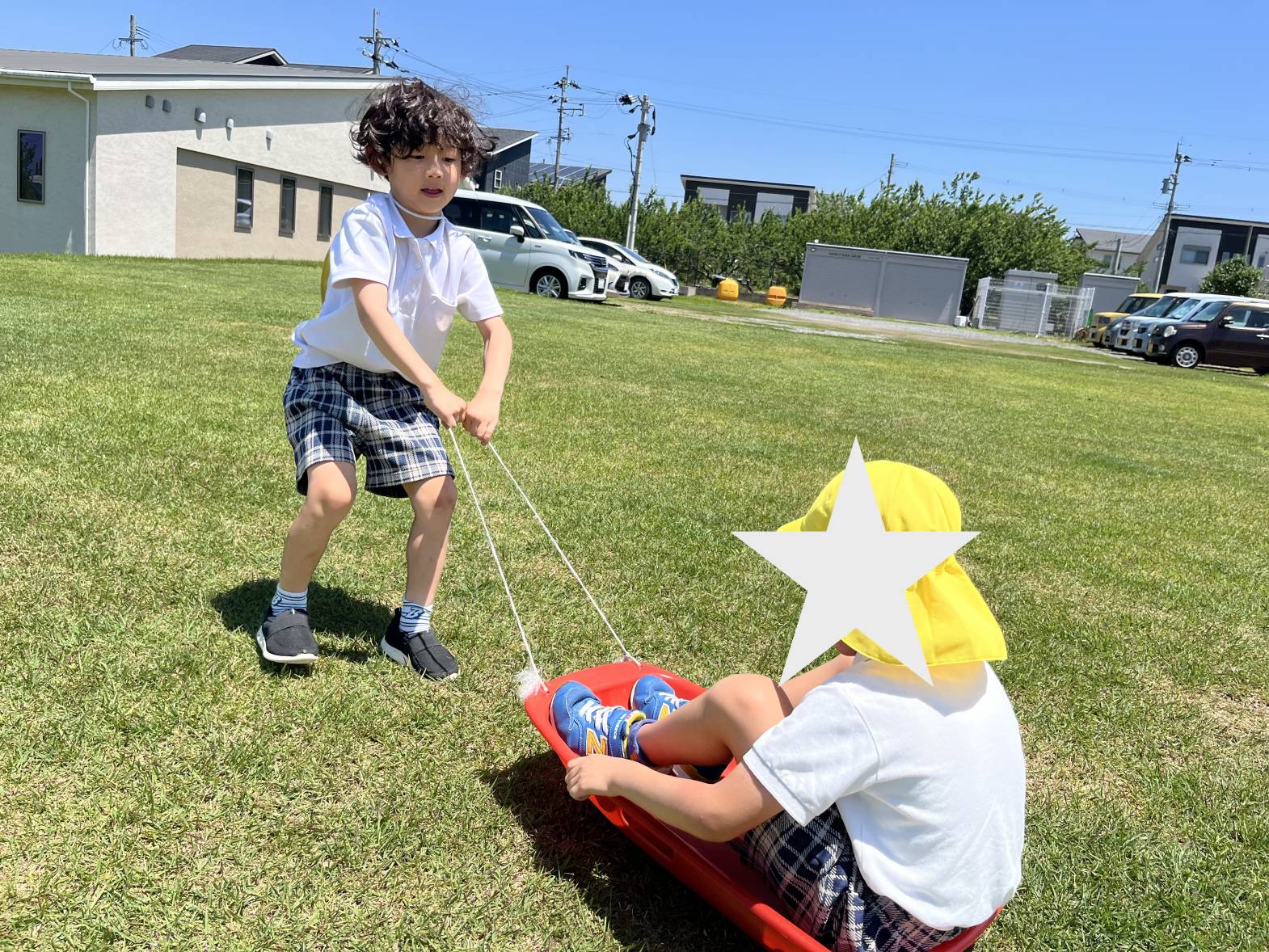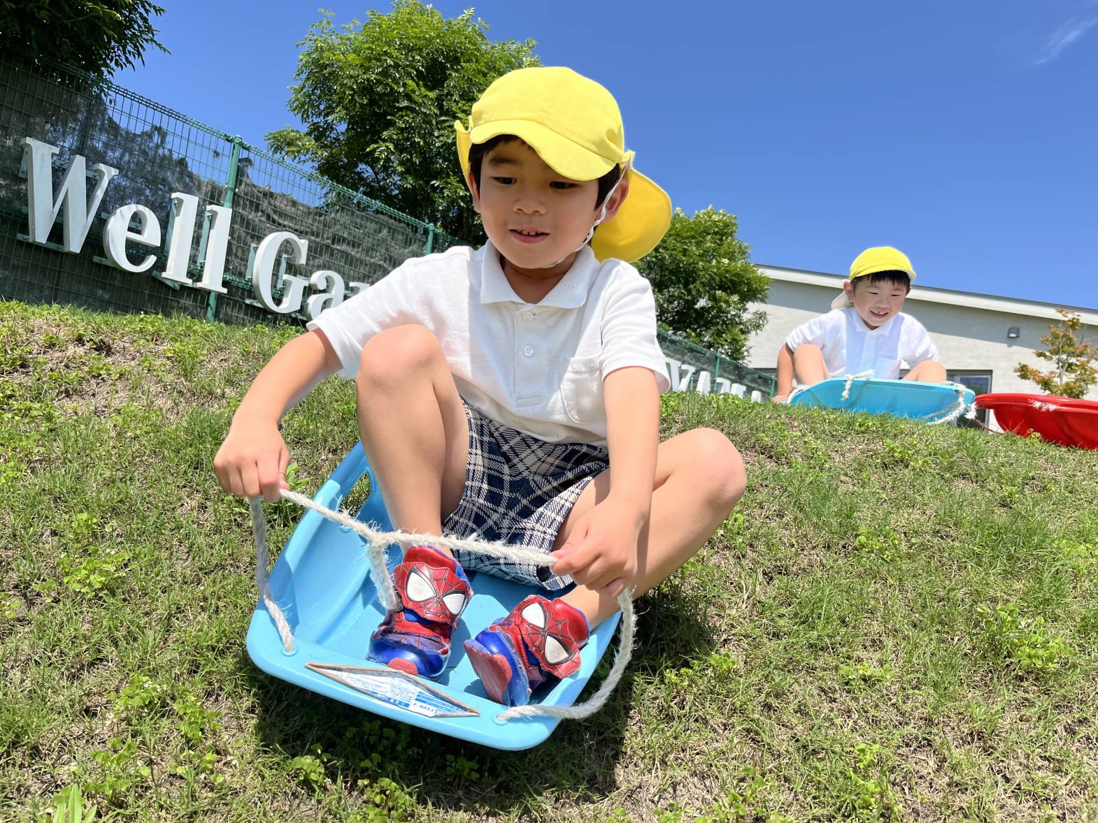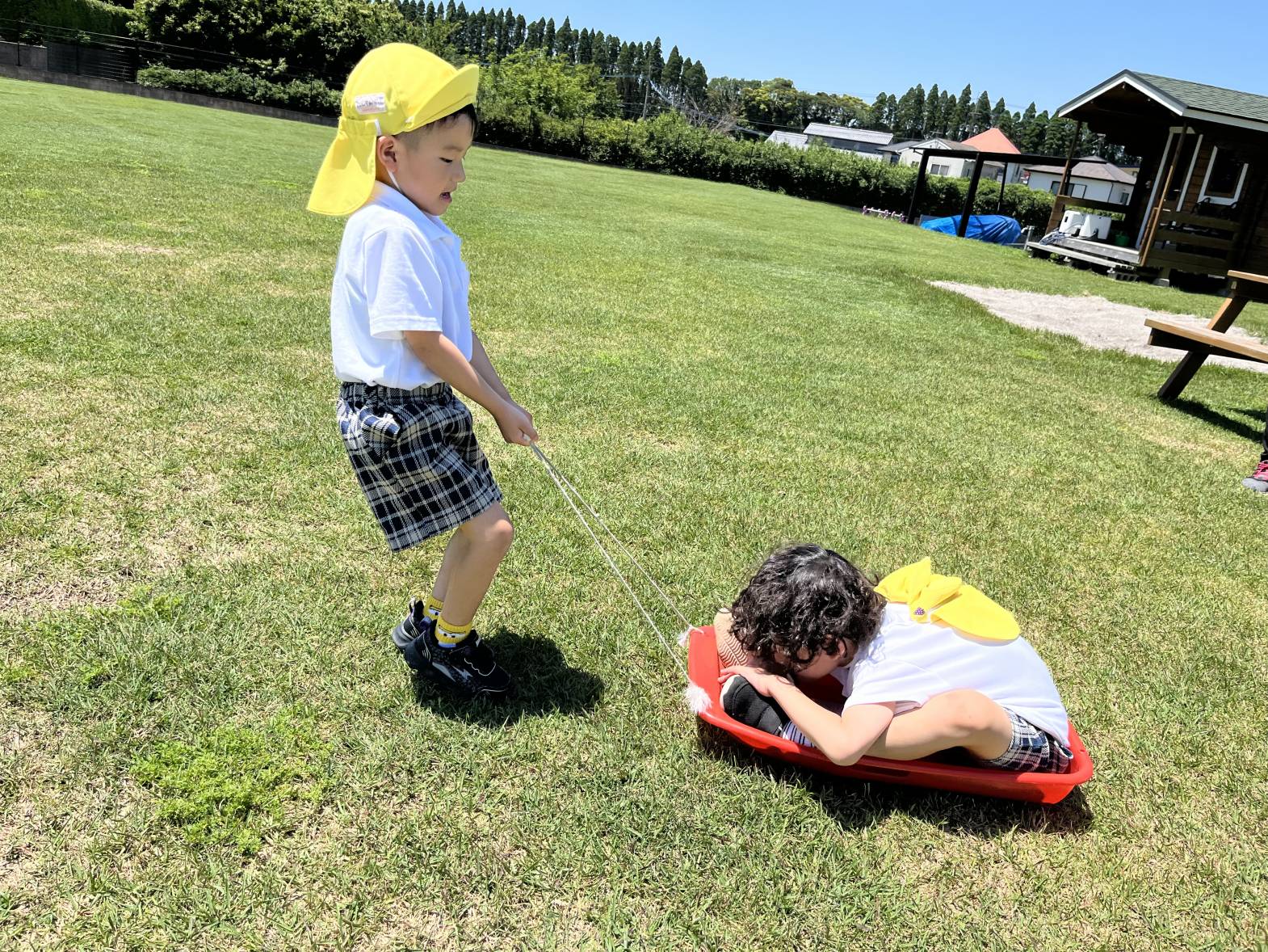 今回は、ウェルガーデンに行き、草スキーをしました。 始めに、草スキーにお友だちを乗せて引っ張ることに挑戦! 途中で立ち止まる園児もいましたが、足腰に力を入れることで、最後まで力いっぱい引っ張ることができていましたよ! 最後に、傾斜がある場所で草スキーをしました! 「一緒にしよう!」と、お友だちと一緒に草スキーに乗り、滑る感覚を共有して、楽しむ、ぞうグループさんでした♪