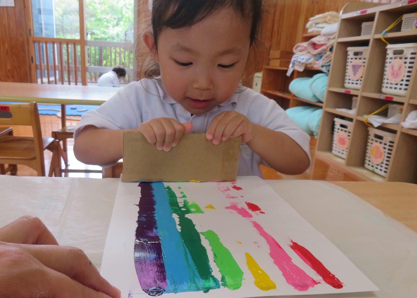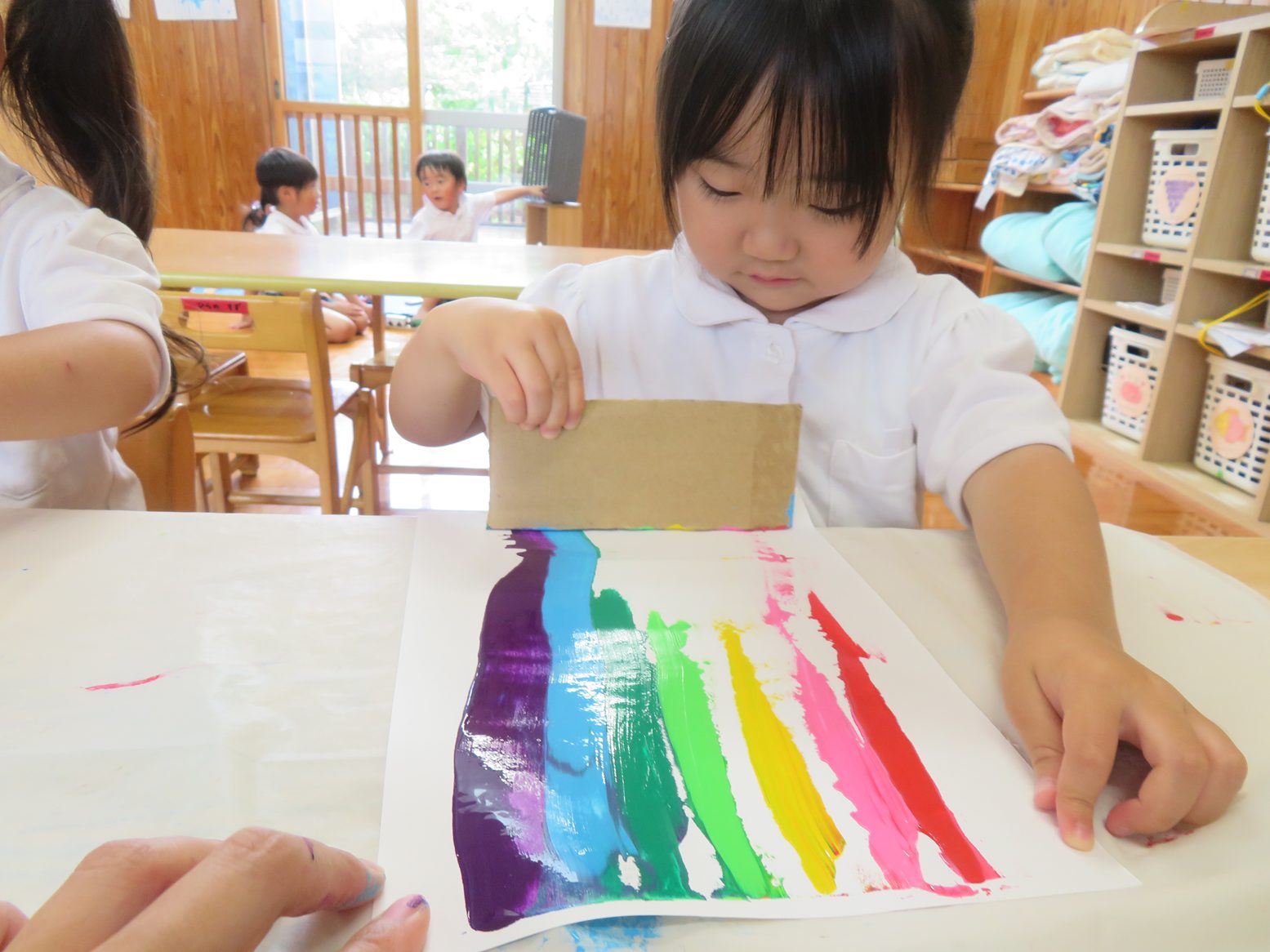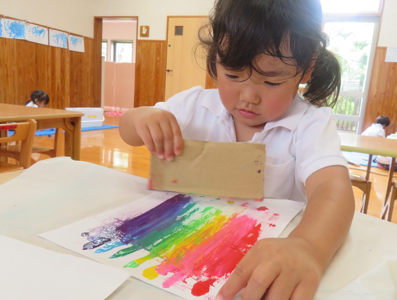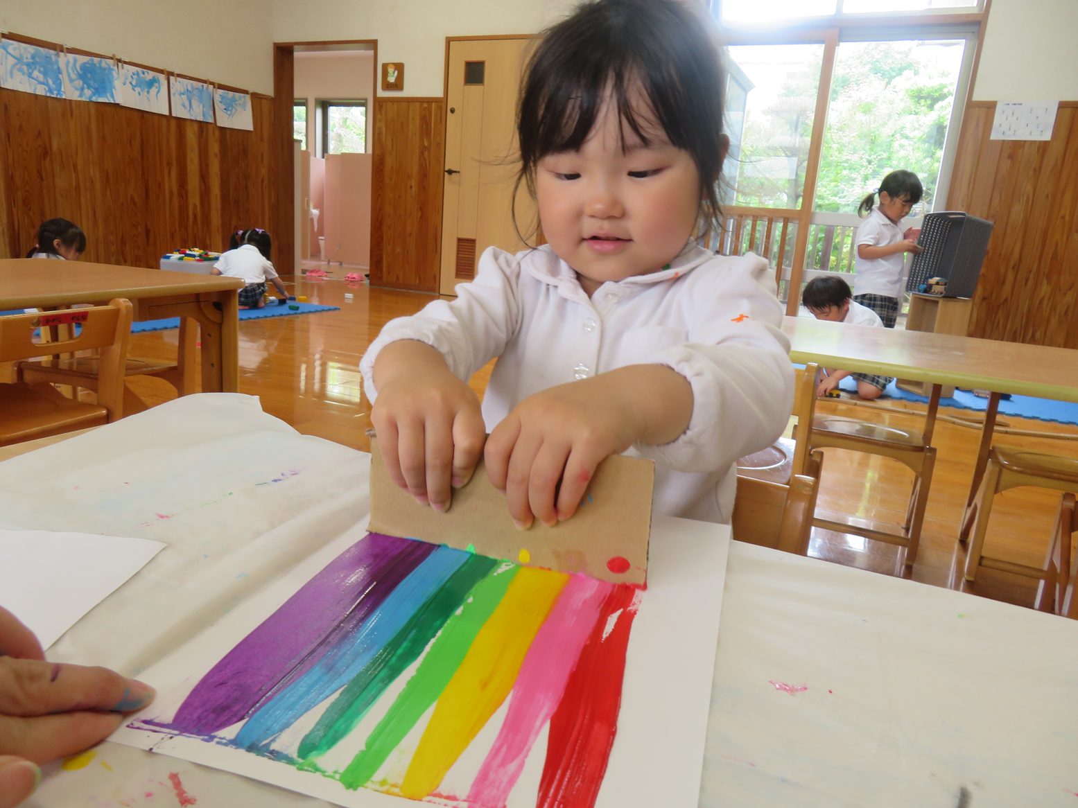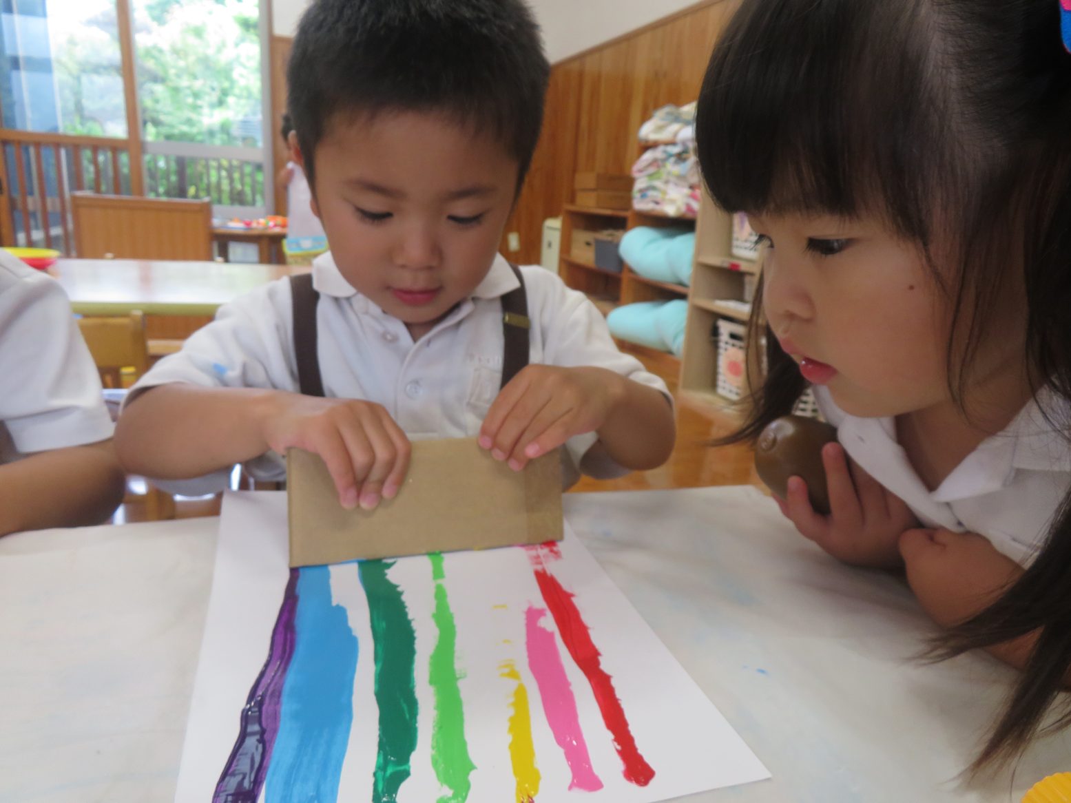 今週は虹の製作を行いました。 画用紙の端に7色の絵の具を付け、それを段ボールで伸ばしていきます。 保育者が画用紙の端に絵の具を1色ずつ出していく中では、「赤!」「次はピンク!」と出している色をクイズのように答える姿が見られました。 また、段ボールで絵具を伸ばし画用紙に虹がかかると「わ!できた。」「きれいな虹!」と笑顔をのぞかせる子どもたち。 今週製作した虹の製作は明日持ち帰りになりますので、子どもたちが作り上げた虹をご家庭でぜひ鑑賞してもらえたらと思います。
