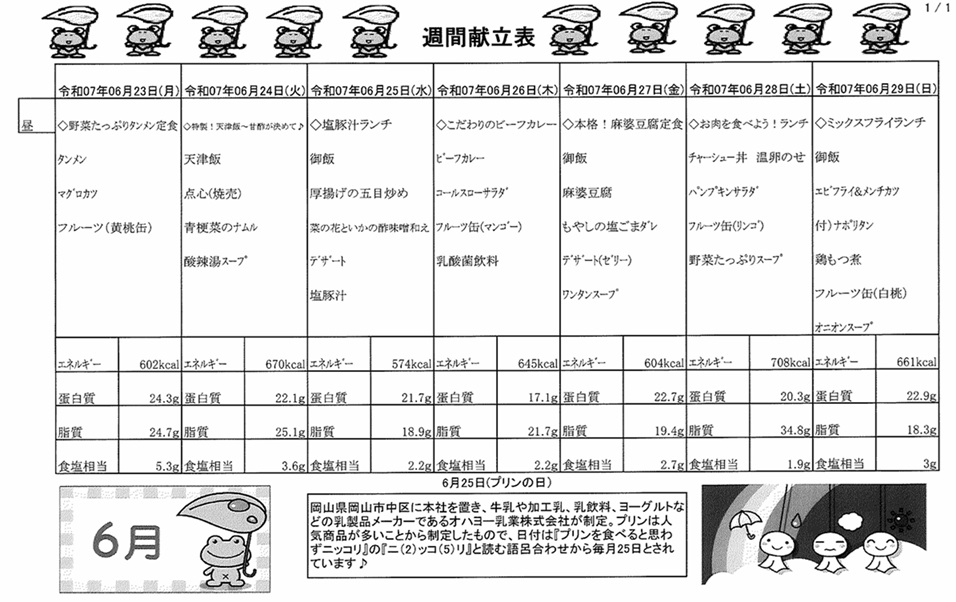 6月23日(月)~6月29日(日)の献立表になります。ぜひご覧ください。