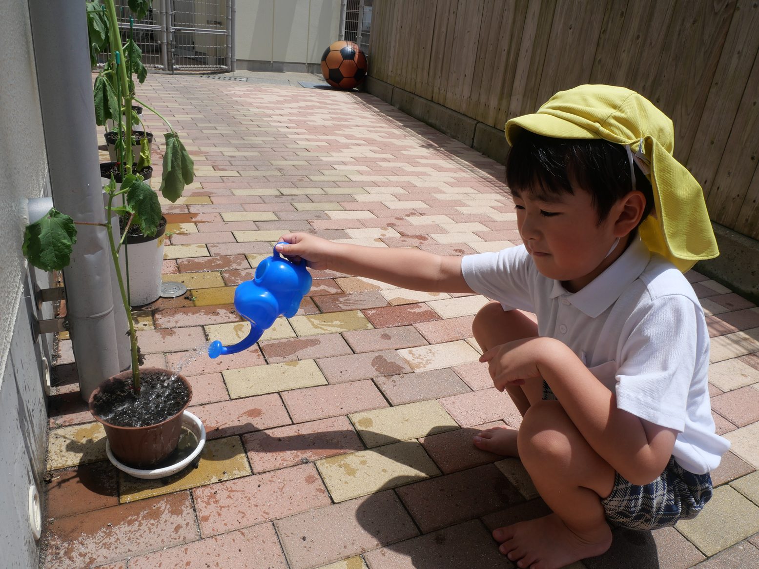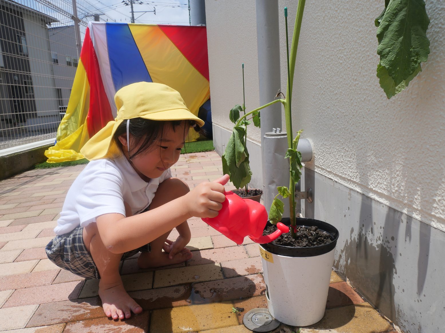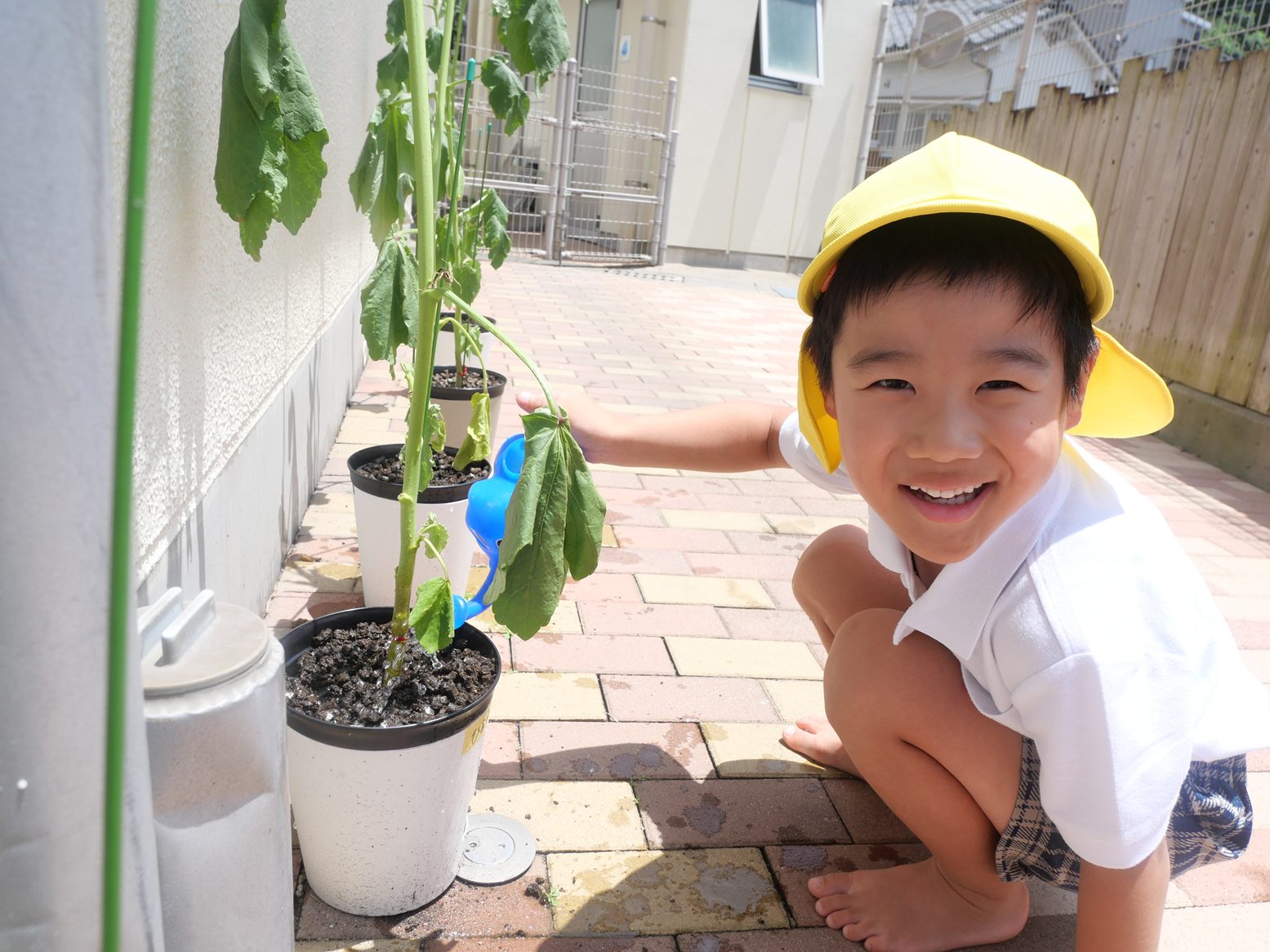 毎日、オクラの水やりを行っている子どもたち。 「今日は私が水やり当番の日だよ!」「僕は明日だ。」と、子どもたち自身で意欲的に水やりに取り組んでいます。 水をあげる際には「大きくなってね!」「お水、美味しい?」と、優しく声を掛ける姿が見られました。 また「オクラ、ここにも出てきている!」「葉っぱが大きくなっている。」と、観察している中での気付きや発見を共有し合うきりん組さん。 「早く出来上がらないかな?」「楽しみだな!」と、今後の成長を楽しみにしている様子です。