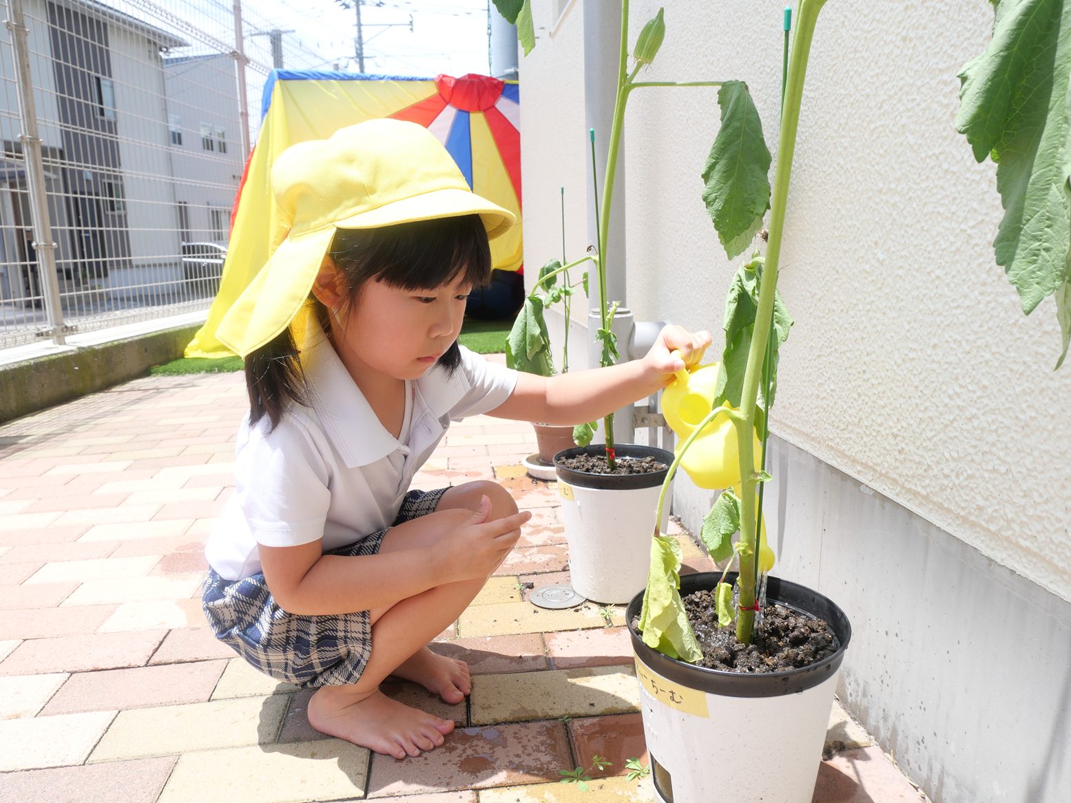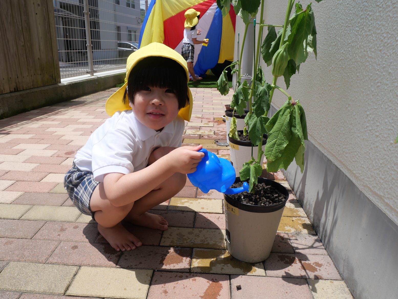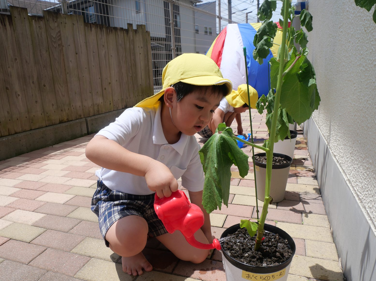 毎日、オクラの水やりを行っている子どもたち。 「今日は私が水やり当番の日だよ!」「僕は明日だ。」と、子どもたち自身で意欲的に水やりに取り組んでいます。 水をあげる際には「大きくなってね!」「お水、美味しい?」と、優しく声を掛ける姿が見られました。 また「オクラ、ここにも出てきている!」「葉っぱが大きくなっている。」と、観察している中での気付きや発見を共有し合うきりん組さん。 「早く出来上がらないかな?」「楽しみだな!」と、今後の成長を楽しみにしている様子です。