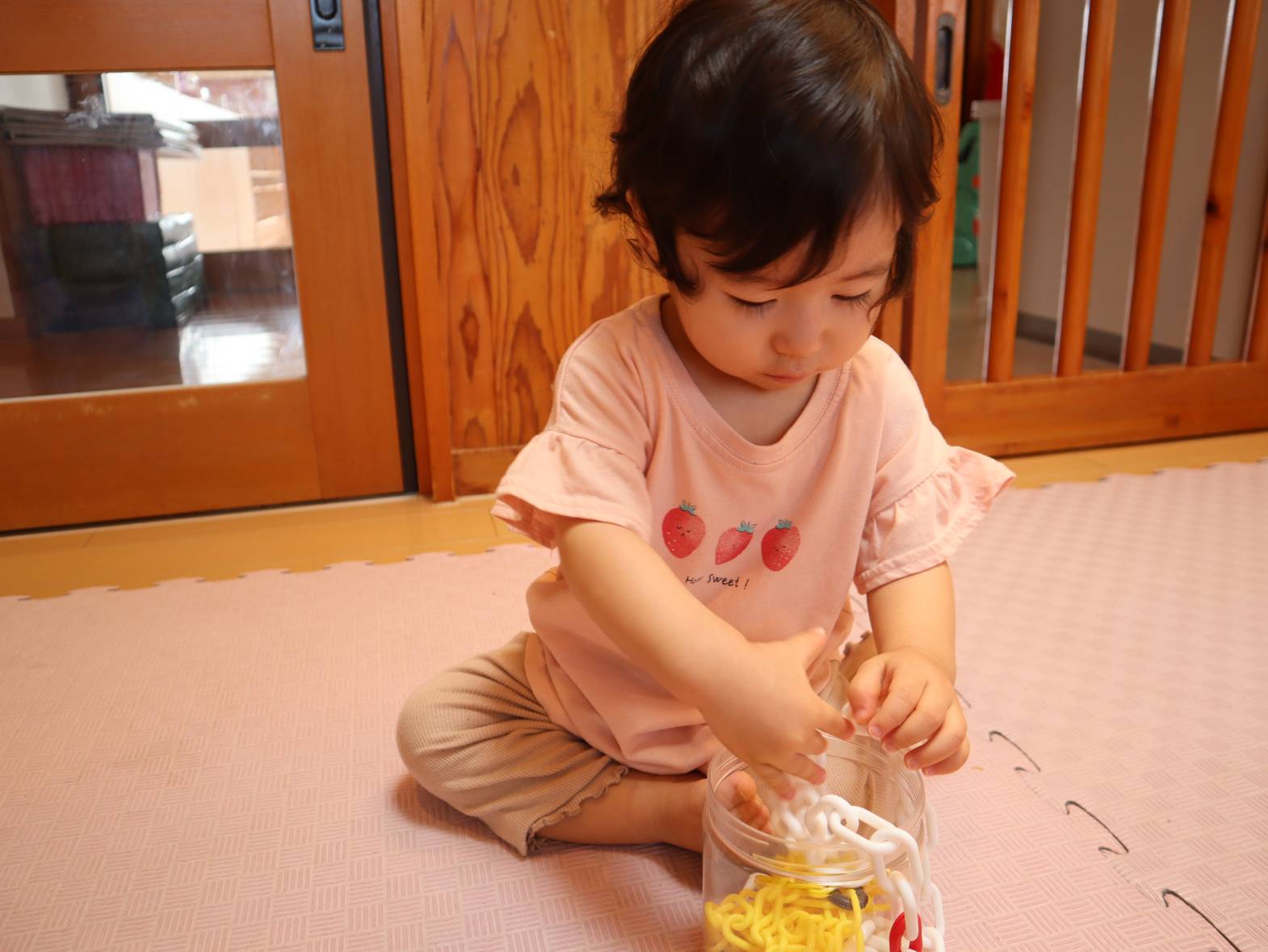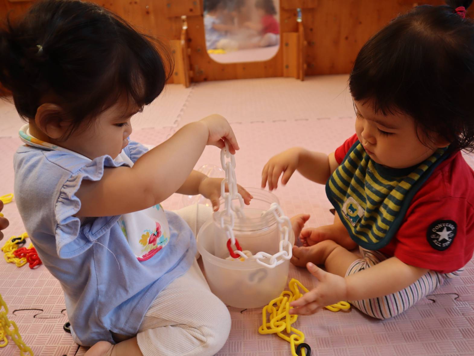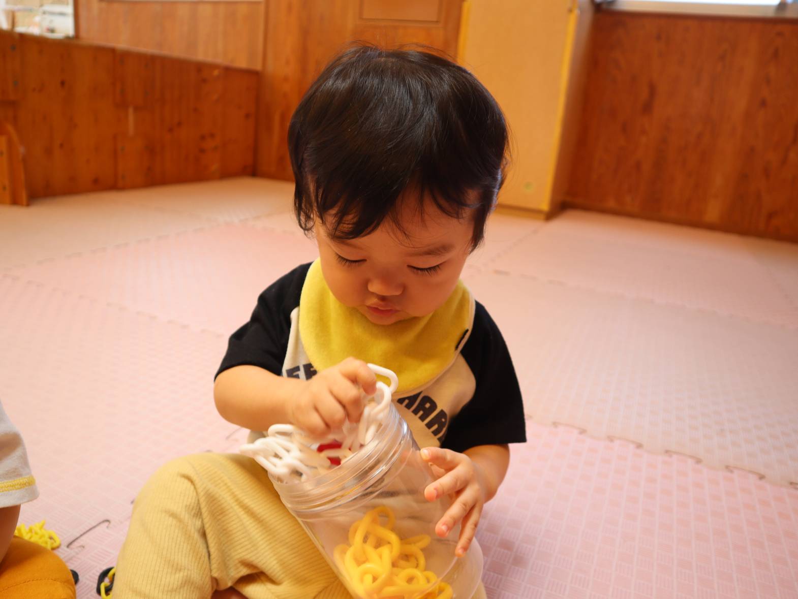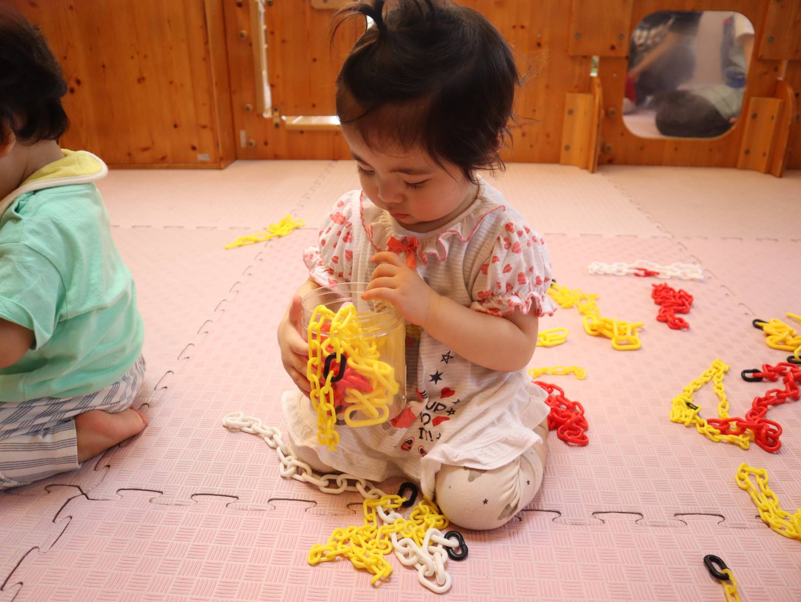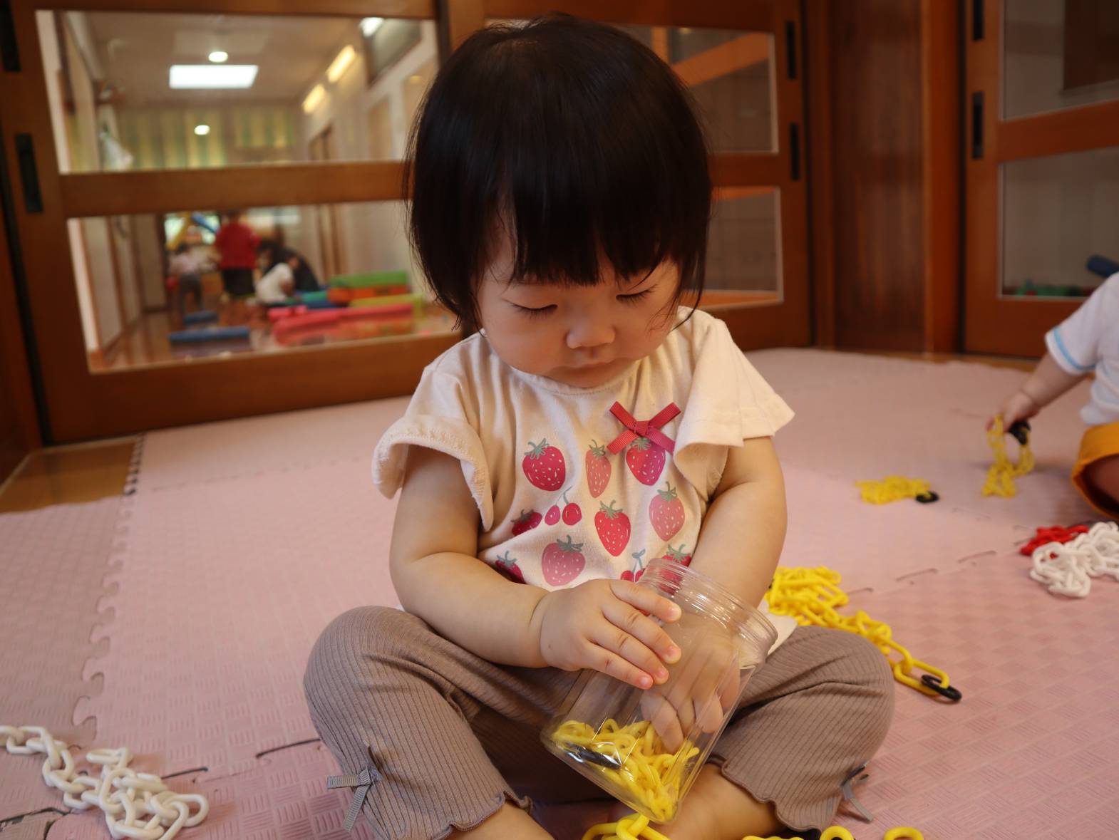 チェーンでよく遊んでいるひよこ組さん! 触ったり舐めたりするだけでなく、容器への出し入れも上手になってきました。 真剣な表情で入れたり出したりを繰り返す子どもたち。 長いため入れることが少し難しいですが、できると「あ!」、「んー!」と嬉しそうな表情です。 今後も、手や指先を使った遊びを楽しめるようにしていきたいと思います。