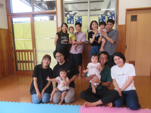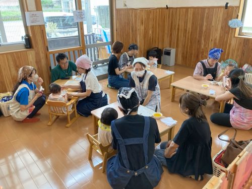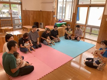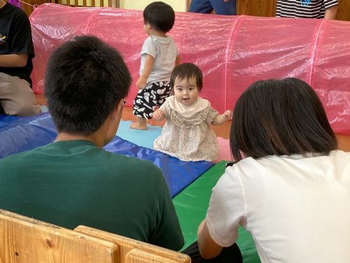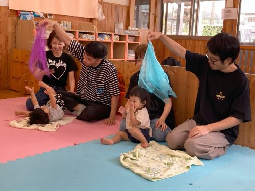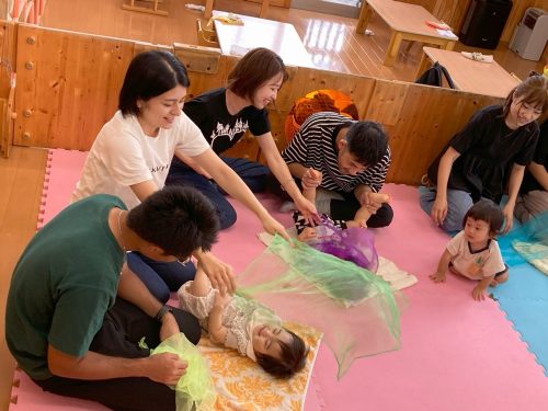 子どもたちは、急に大人が増えたことで驚いた様子だったり、緊張しているような姿も見られましたが「だるまさんが」の絵本を一緒に見たり、大好きなオーガンジー遊びをしたりすることで徐々に緊張もほぐれ保護者から離れて遊ぼうとするひよこ組さん。