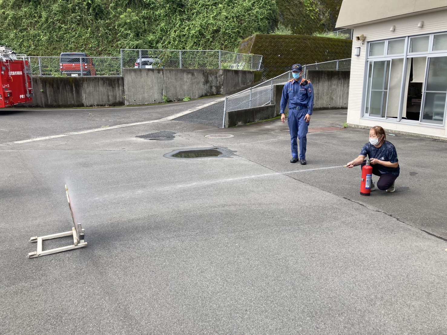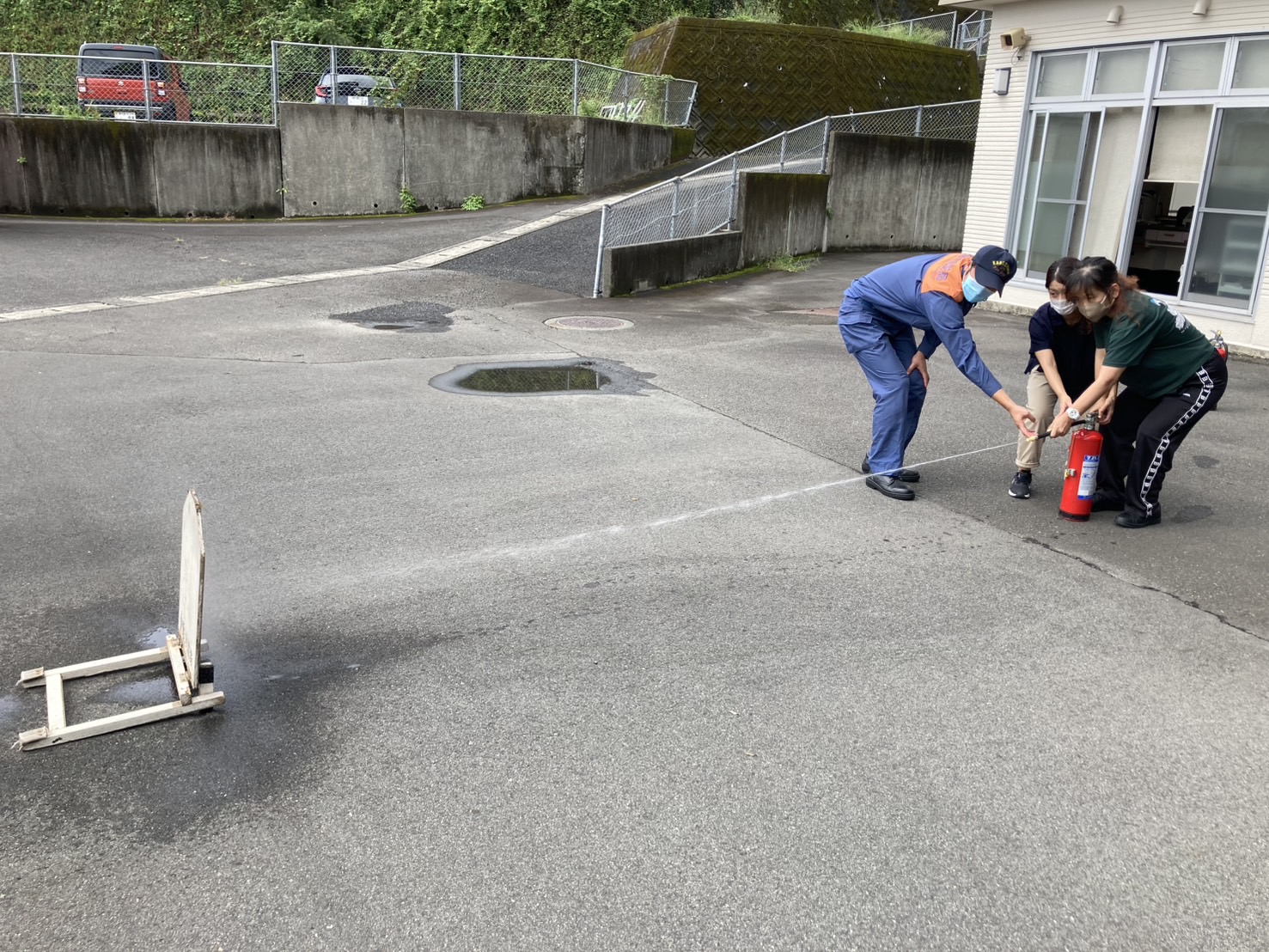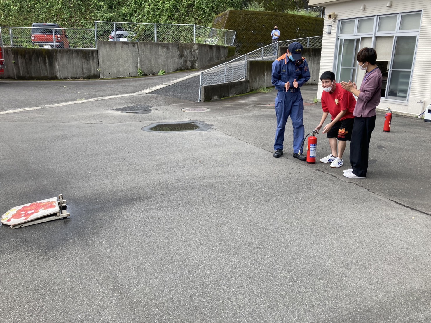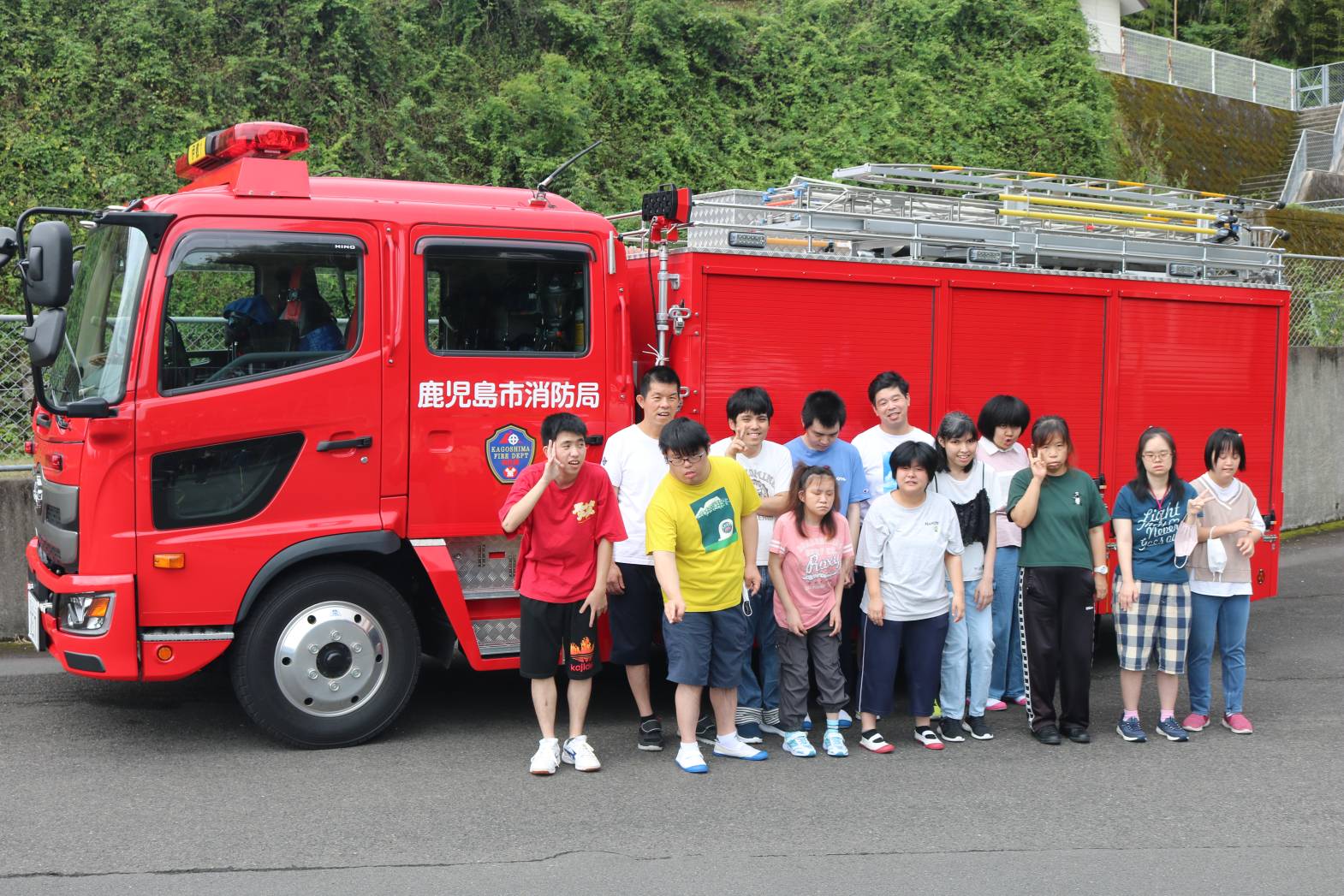 地震と火事を想定した防災訓練を行いました。 支援員と利用者の皆さん一緒に、伊敷分遣隊の方々の立ち合いの元 避難訓練を実施、また消火器の使い方をレクチャーしていただきました。 最後は消防車の前で記念撮影を行いました。