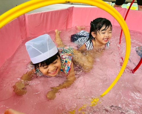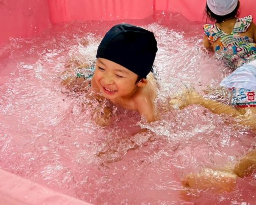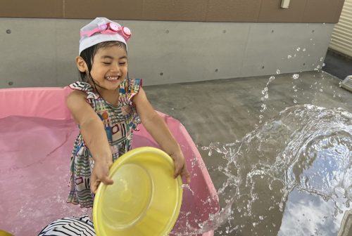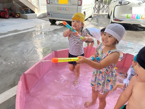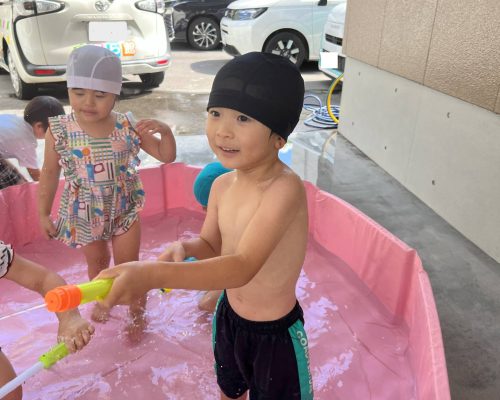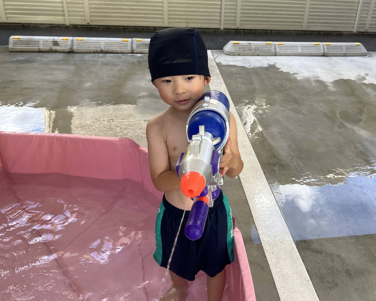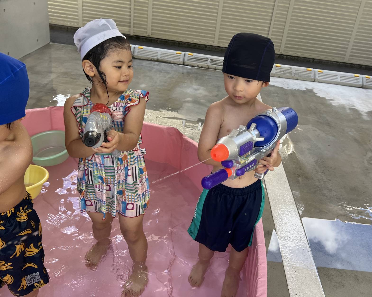 水遊びをしました。 桶や水鉄砲などの道具を使って水を掛け合って楽しむ子どもたち。 「いっけー!」、「先生たちを濡らすぞ~!」と楽しそうな笑い声が響き渡ります! プールの中でワニ歩きやフラフープのトンネルくぐりにも挑戦しました! 「くぐれたよ!」、「お水つめたーい!」と笑顔で水遊びを楽しんだ子どもたちでした!