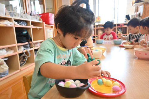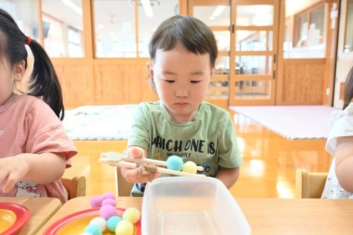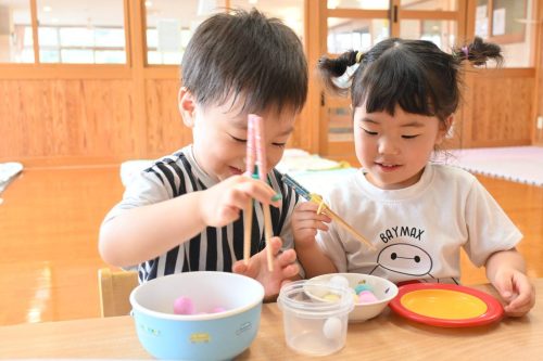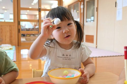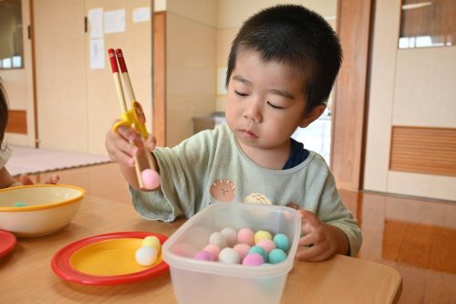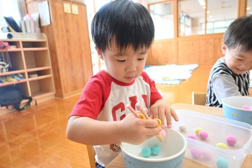 給食では、スプーンのすくい持ちや箸を頑張るぱんだ組さん。 数名箸を使用していることから他の友だちも箸に興味を持つ姿が見られます。 給食の時間だけでなく、遊びの中で箸に触れるよう机上遊びに取り入れてみました。 皿から皿へ小さなボンボンを移動させると、「見て!できた!」、「あれ?落ちちゃった。」と給食の時間になるまで集中して取組む姿が見られました。 遊びの中に取り入れながら、給食でのすくい持ちの練習も進めていけたらと思います。