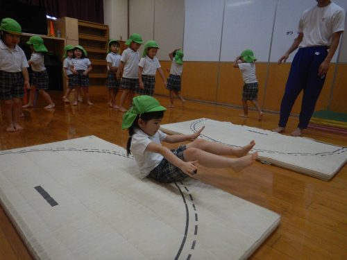「先生できたよ。」「前回り楽しいね!」と、笑顔で前転をしていく子どもたち。