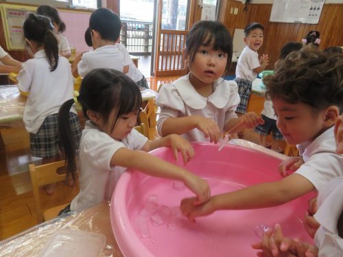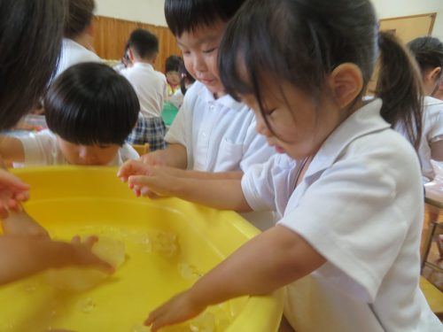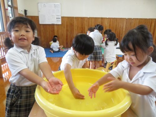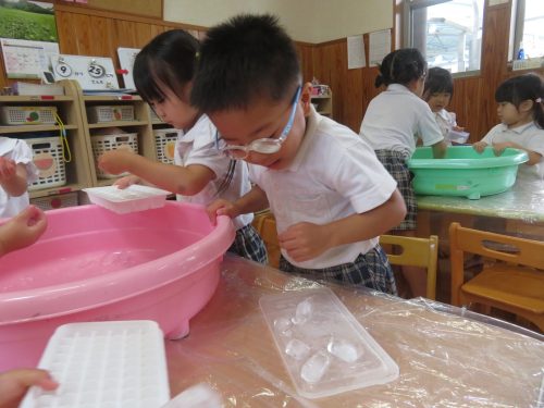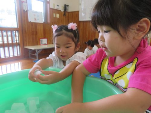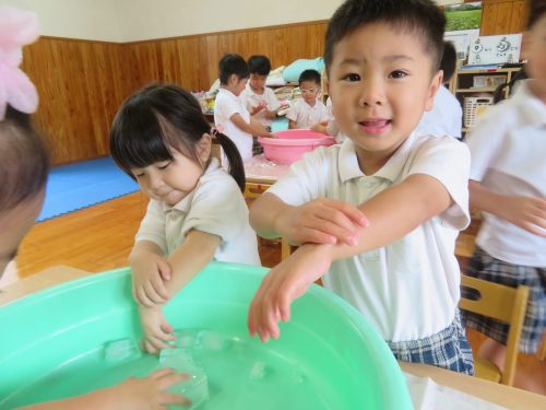 今日は、桶に大小様々な氷を出して触れる活動を行いました。 氷をぎゅっと握って「冷たい!」「ひえひえ~」と冷たさを感じて喜ぶ子どもたち。 しばらく氷を握っていると「あれ?小さくなった。」 さらにもうしばらくすると「氷がいなくなった!」と掌の熱で氷が解けるのを発見です! また、氷の解けたひえひえの水に手をつけたりその手を頬に付け合いっこしたり様々な遊び方に発展させていく子どもたち。 まだ暑さが残る今日は氷遊びにはもってこいだったようで、氷の冷たさを十分に感じて楽しむりす組さんでした。
