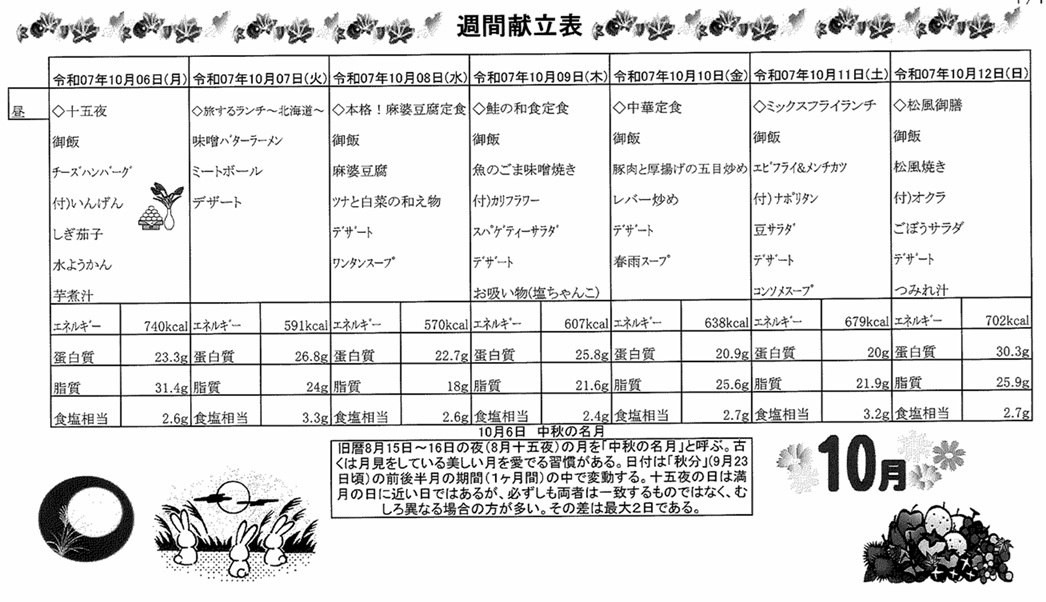 10月6日(月)~10月12日(日)の献立表になります。ぜひご覧ください。