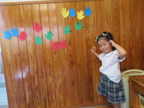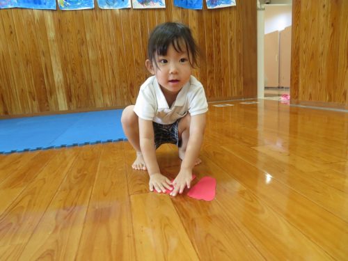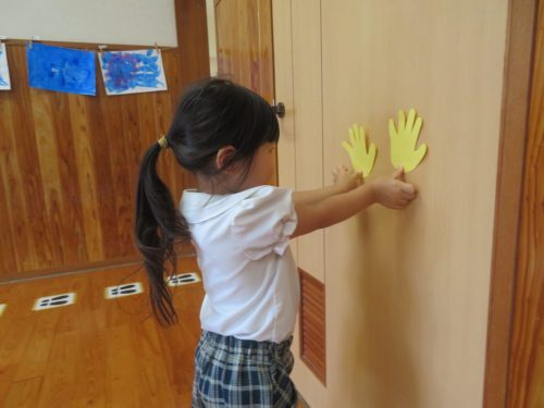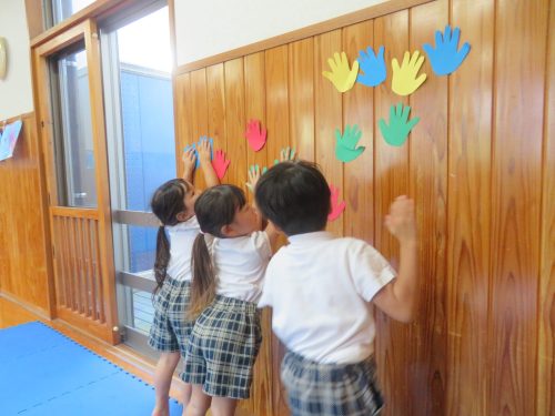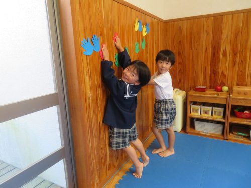 時には、もう友だちがタッチをしていてタッチすることができないことや、高い場所に貼ってあって「あれ?届かない。」というころもありましたが、そういう場面も「あちゃー。」「残念!」と楽しむ子どもたち。