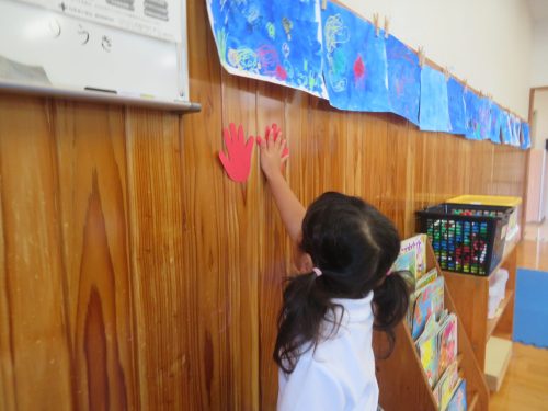 まずは、りす組の部屋の壁や床に手形や足形を貼っていきます。