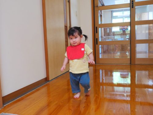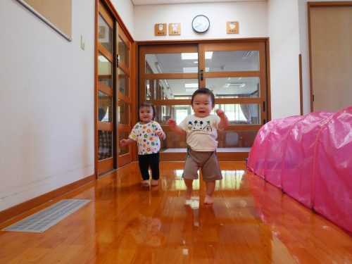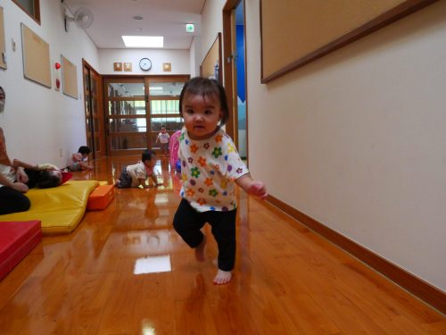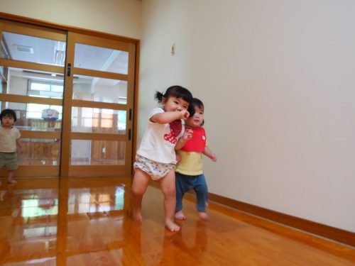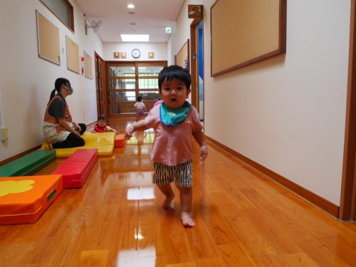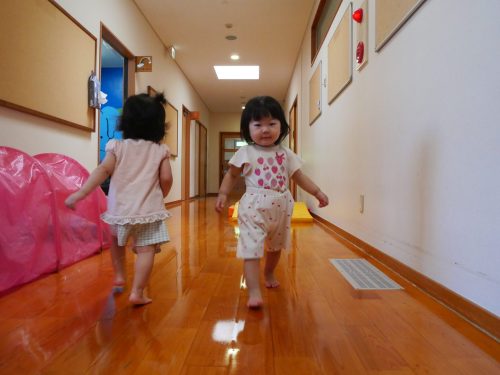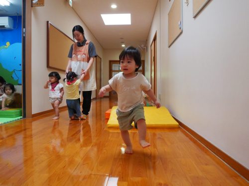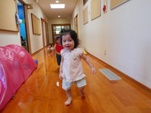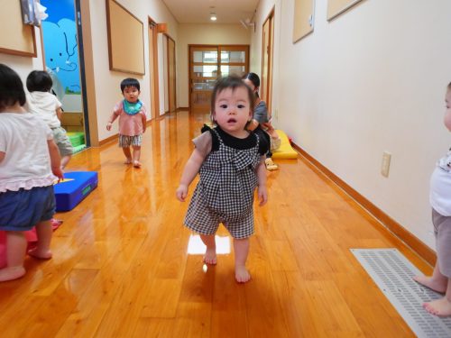 廊下に出て、保育者の「よーい、ドン!」に合わせて少ずつ進めるようになった子どもたち。