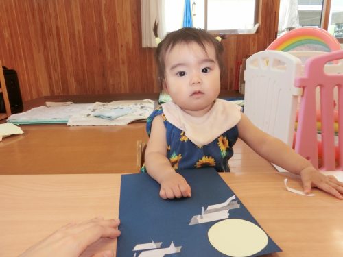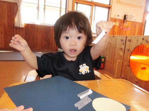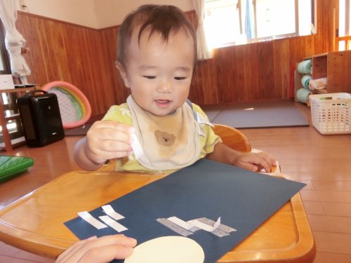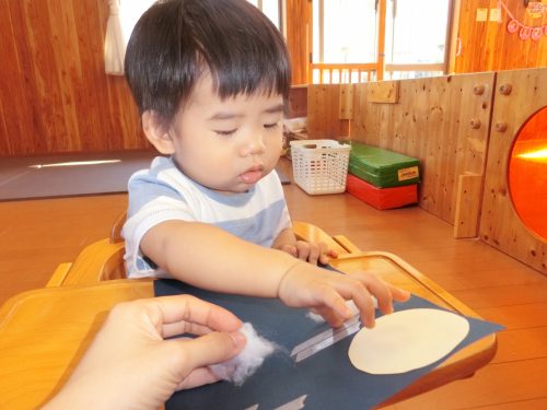 お月見の製作をしました! 画用紙についている両面テープを先生と一緒に剥がしていく子どもたち。 お手本を見せると「早くしたい!」と言いたげに「ん!ん!」と声を出すひよこ組さん。 手先も器用になってきており、両面テープの紙を一人で剥がす子どもの姿も見られました。 両面テープをはがしたら、一緒に綿を付けていきます。 綿を少し渡すと、付けたり外したりして遊びだす様子も見られましたが無事に完成しました♪ 足型で作ったうさぎを貼って可愛い製作ができました♡