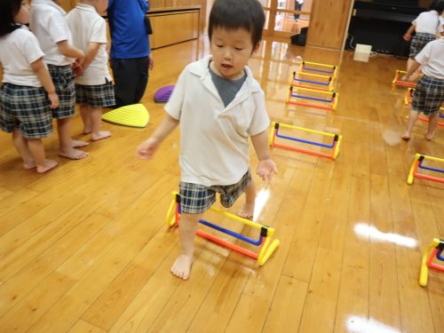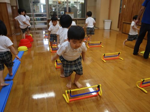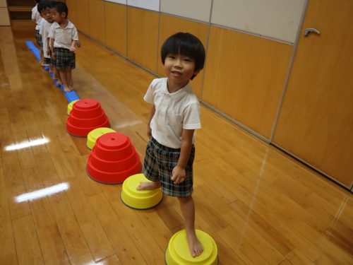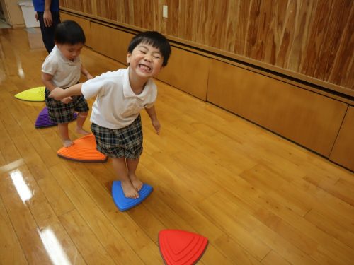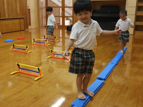 先日、プレイルームでサーキット遊びに取り組みました! サーキット遊びとは、色々な遊具をコース状に組み合わせて周回する遊びです。 始めに約束事の確認を行いました。 「これどうやってジャンプするの?」「できるかな?」と、不安気な表情の子どもたちでしたが、積極的に取り組む友だちの姿を見て、勇気を出してジャンプをします! リバーストーンや平均台の上も上手に歩く子どもたち。 「楽しかった!」「ゆっくり渡ったから落ちなかったよ。」と、嬉しそうな表情を見ることができました!