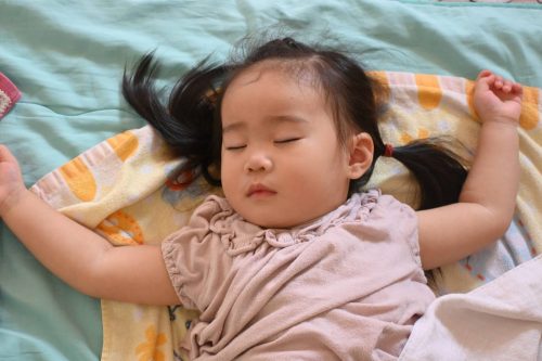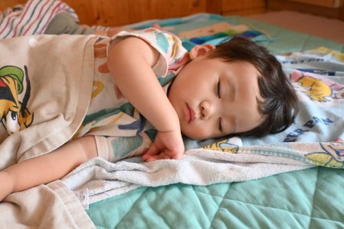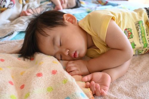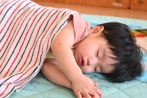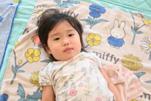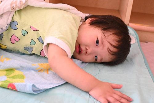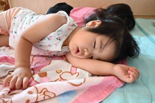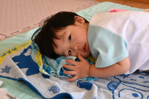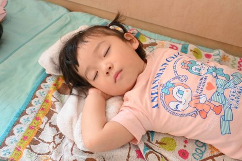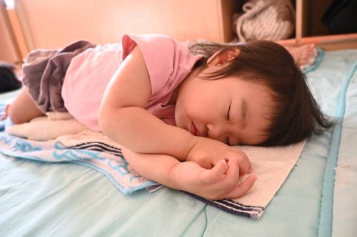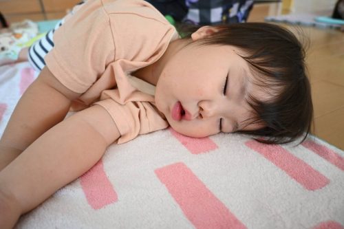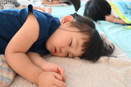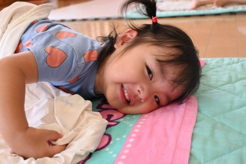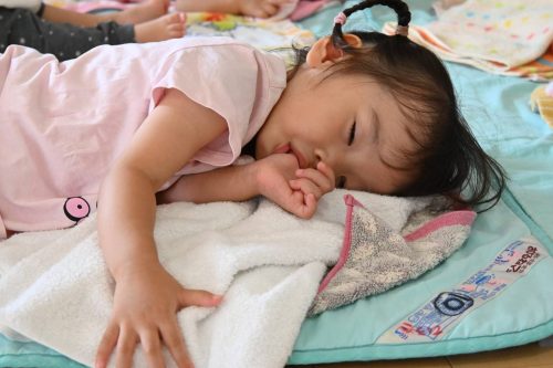 給食の時間が終わるとお昼寝の時間です。 食べ終わった子どもたちから順に、布団に横になります。 「あった!」と自分の場所を見つけると、布団に抱きついたり、自分で布団をかけようと挑戦してみたりなど、すっかりお昼寝モードです。 優しくトントンするとあっという間に眠りにつく子どもたち。 たっぷりお昼寝をして、午後からまた元気いっぱいのこあら組さんです!