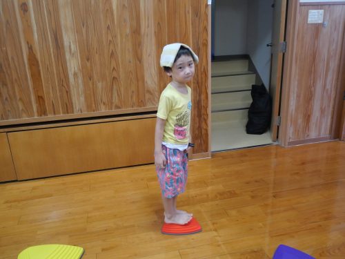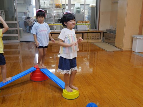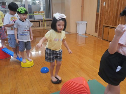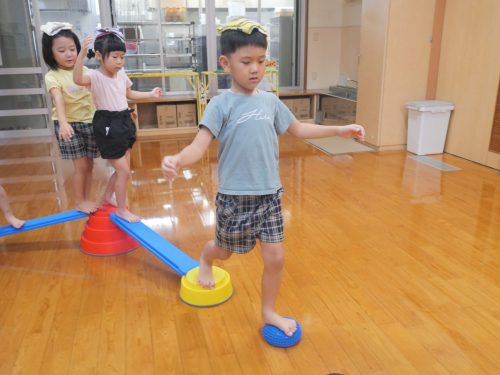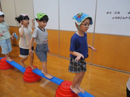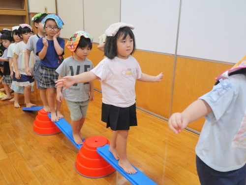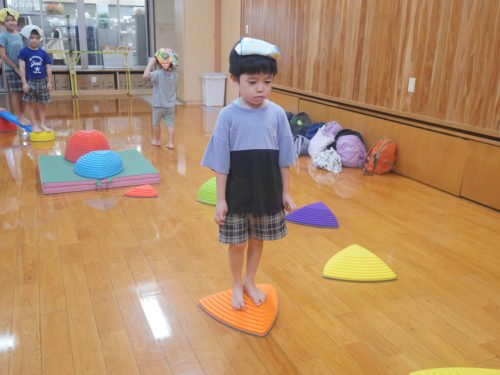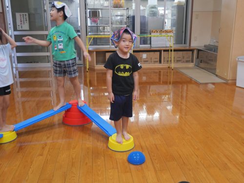今日は、うさぎ・きりん組合同で活動を行いました。 タオルを頭の上にのせて、バランスを取りながら歩いていきます。 「おっとっと。」「落ちないように・・・」と、慎重に歩き進めていく子どもたち。 少し難しいところも「一緒に頑張るぞ!」と、みんなで声を掛け合いながら取り組む姿が見られます。 ゴールすると、「やった!」「最後までできたよ。」と嬉しそうな表情です。 「また今度やりたい!」「楽しかったね。」と、満足気な様子の子どもたちでした。