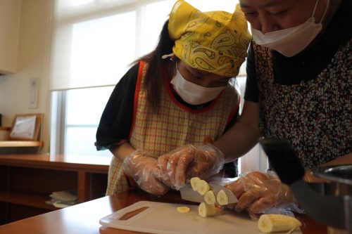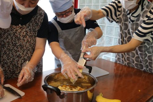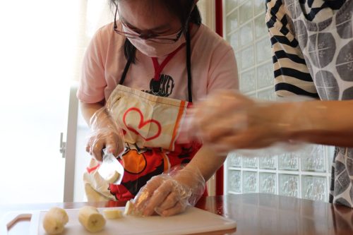 バナナを切る際は、お料理するお母様方への憧れからか、勢いよく切ろうとする方もおり、ゆっくりと丁寧に切るよう話をしながら進めます。