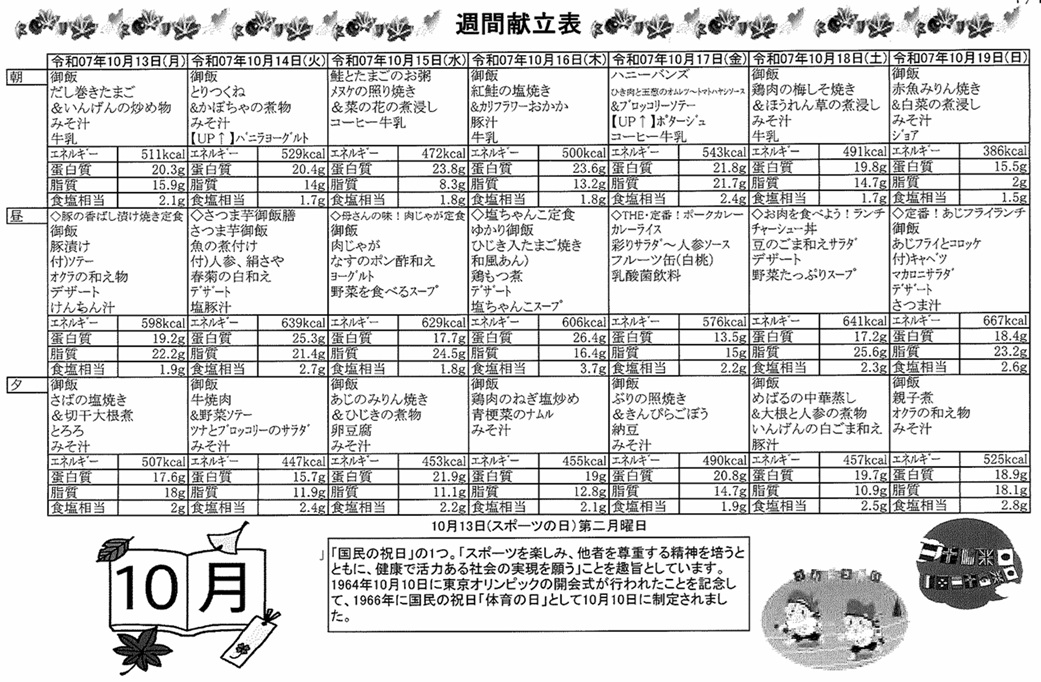 10月13日(月)~10月19日(日)の献立表になります。ぜひご覧ください。