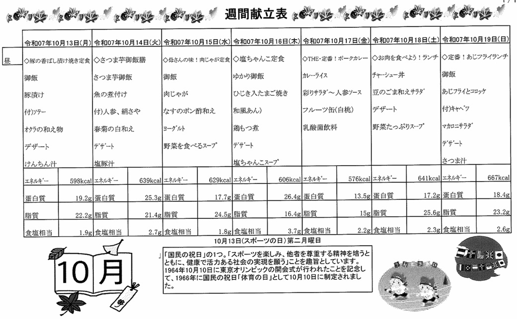 10月13日(月)~10月19日(日)の献立表になります。ぜひご覧ください。