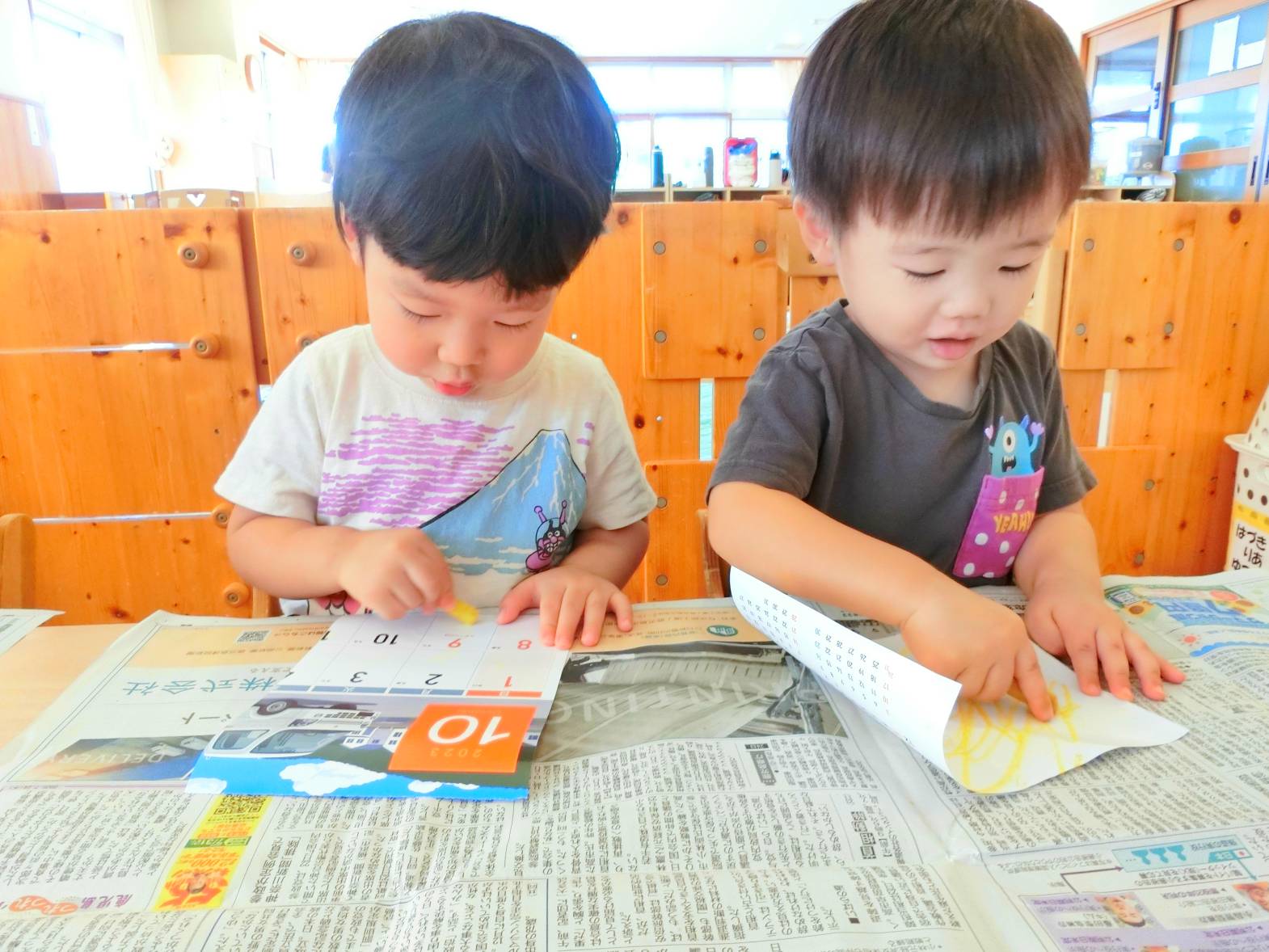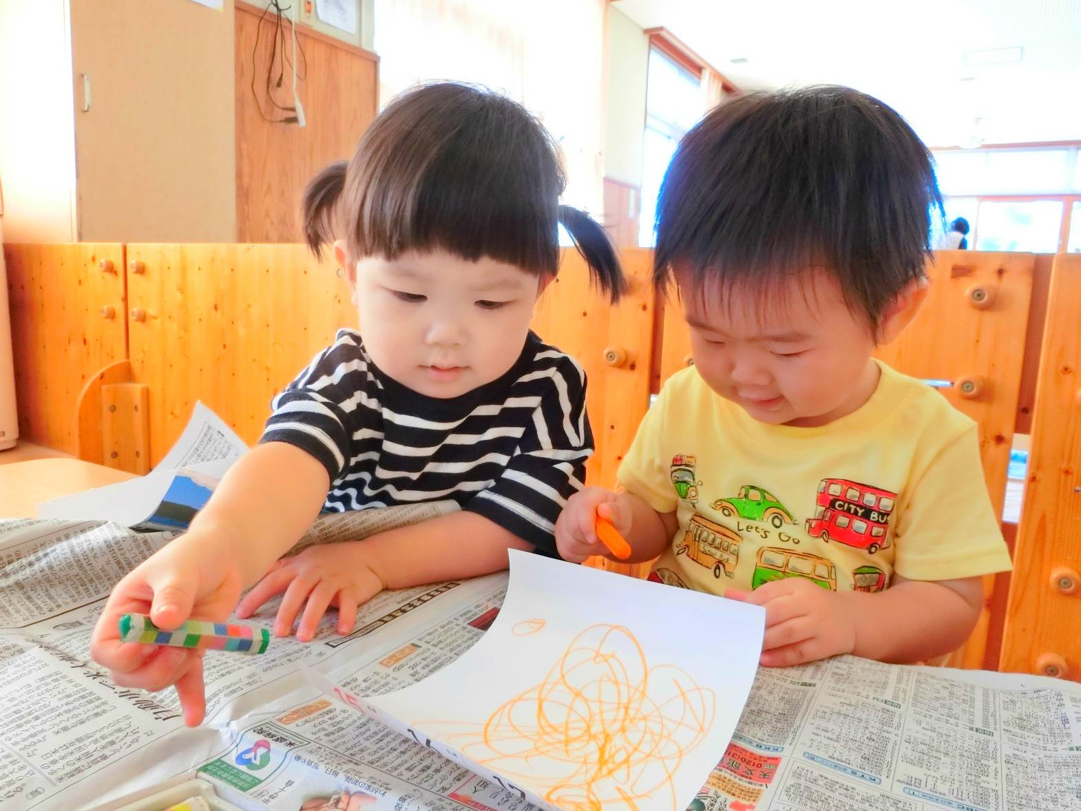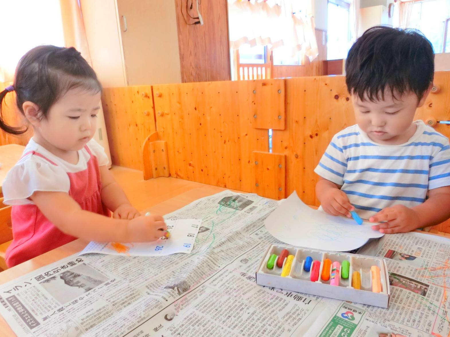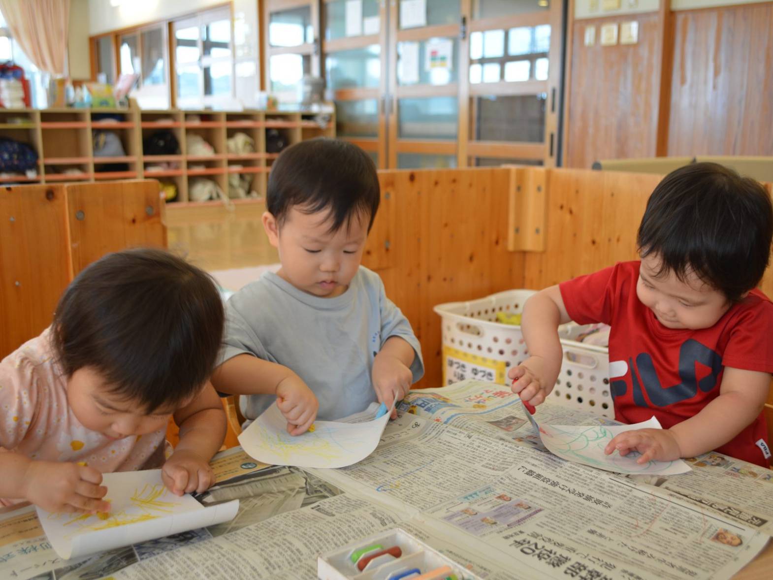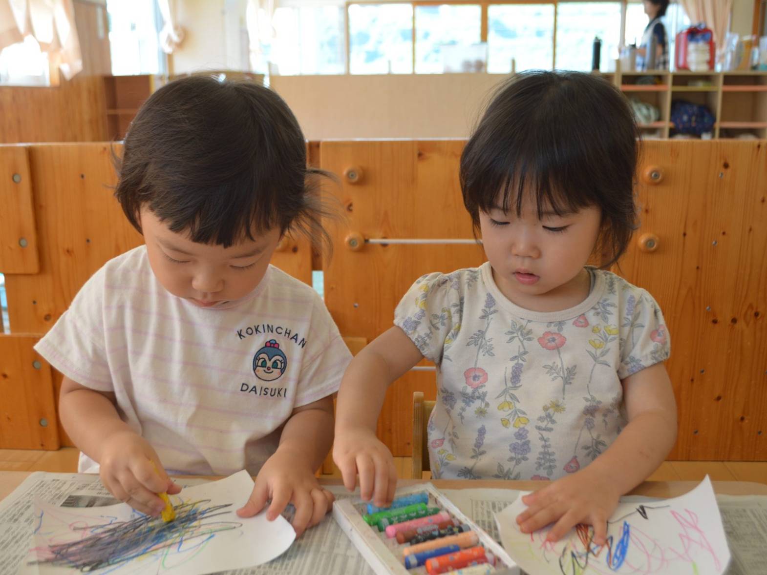 「かきかきする~?」と言葉を掛けるとわくわくした様子で机に向かってくる子どもたち。 自分たちで椅子に座りお絵描きの準備万端! クレヨンの箱を出すと好きな色を手に取り自由に描き始めます。 「先生見て~。」と描いたものを自信満々に見せてくれたり、「あお。」、「ピンク。」と描いた色を教えてくれたりする姿が見られました。 片付けの時間になると使ったクレヨンを箱に戻します。 活動後は、「楽しかった~。」、「かきかきしたね~。」と言葉を交わすこあら組さんでした。